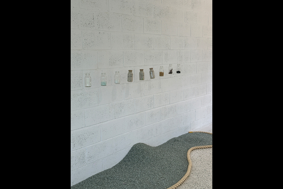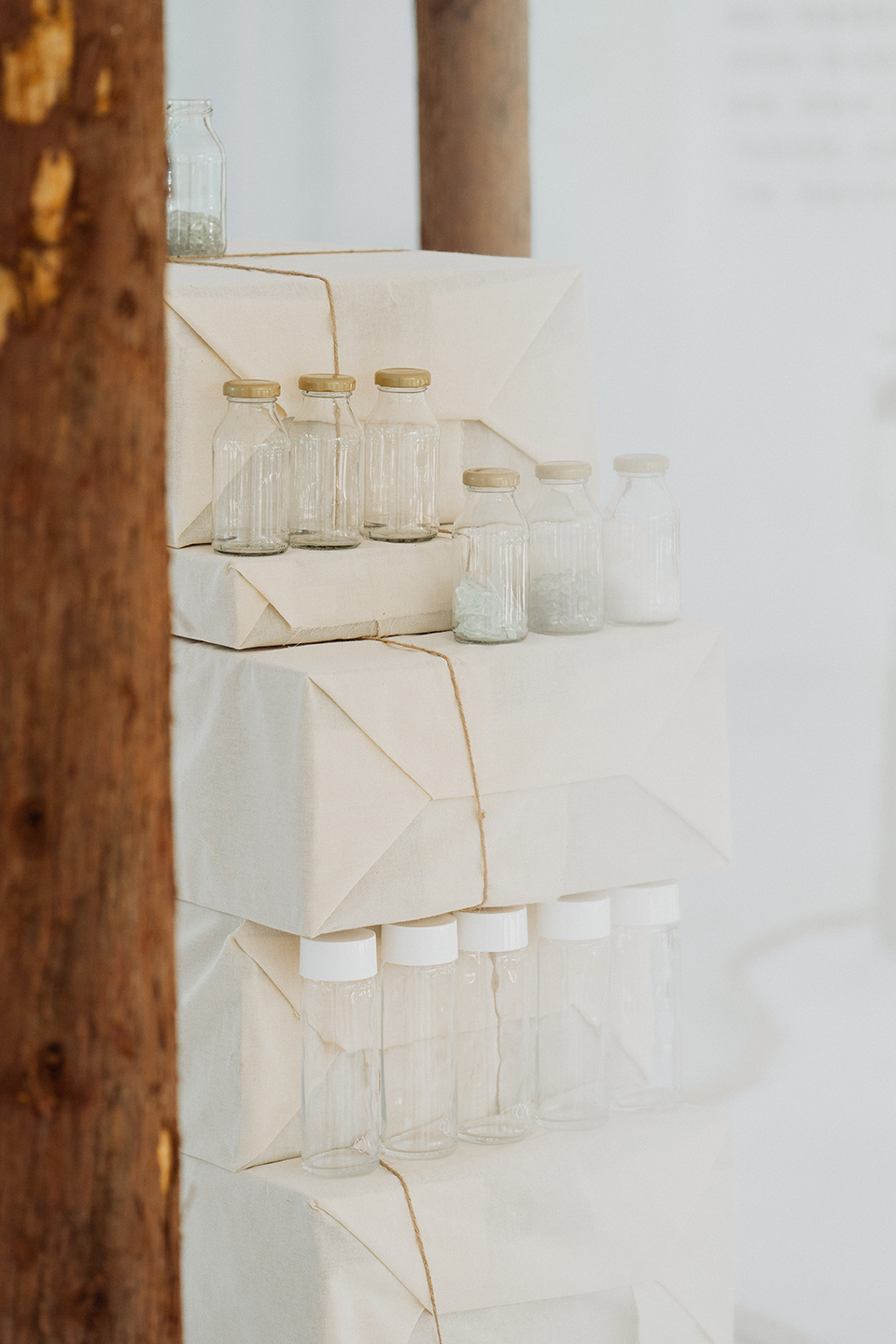 本區域以垂直向度的單元排列來回應復育森林時的空間感。紙箱的堆疊創造出高高低低的平台,順著平台將裝著原料的玻璃瓶依照製作關係層層擺放,從原料到加工成產品,透過由下而上的閱讀順序理出產品與材料之間的關係,每一個堆疊的柱狀單元都代表著從土地中誕生的各種供應鏈,而玻璃砂以流體狀鋪設在地面上展出也象徵著最原始的土地和土地孕育出原物料之美。