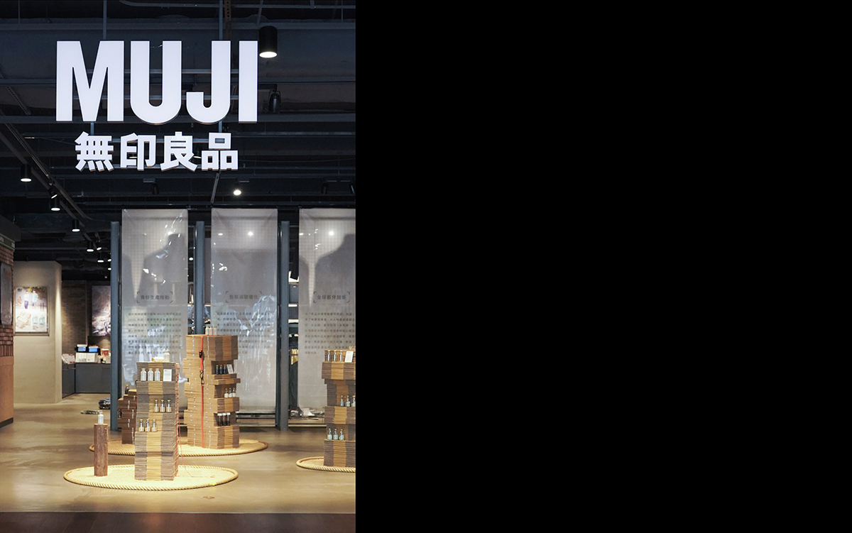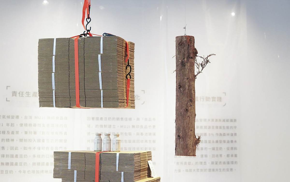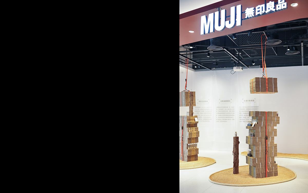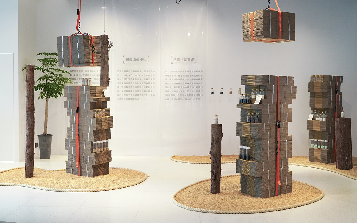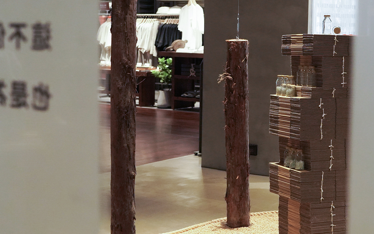 透過堆疊、解構與排列,以無印良品的零廢棄供應鏈為發想,透過垂直向度的模組化展示單元創造森林感受,發展垂直循環概念,從原料、製造、成品到運輸與販售後的森林復育回饋,在紙箱堆疊成型的單元上,說明著一環又一環的供應鏈關係。