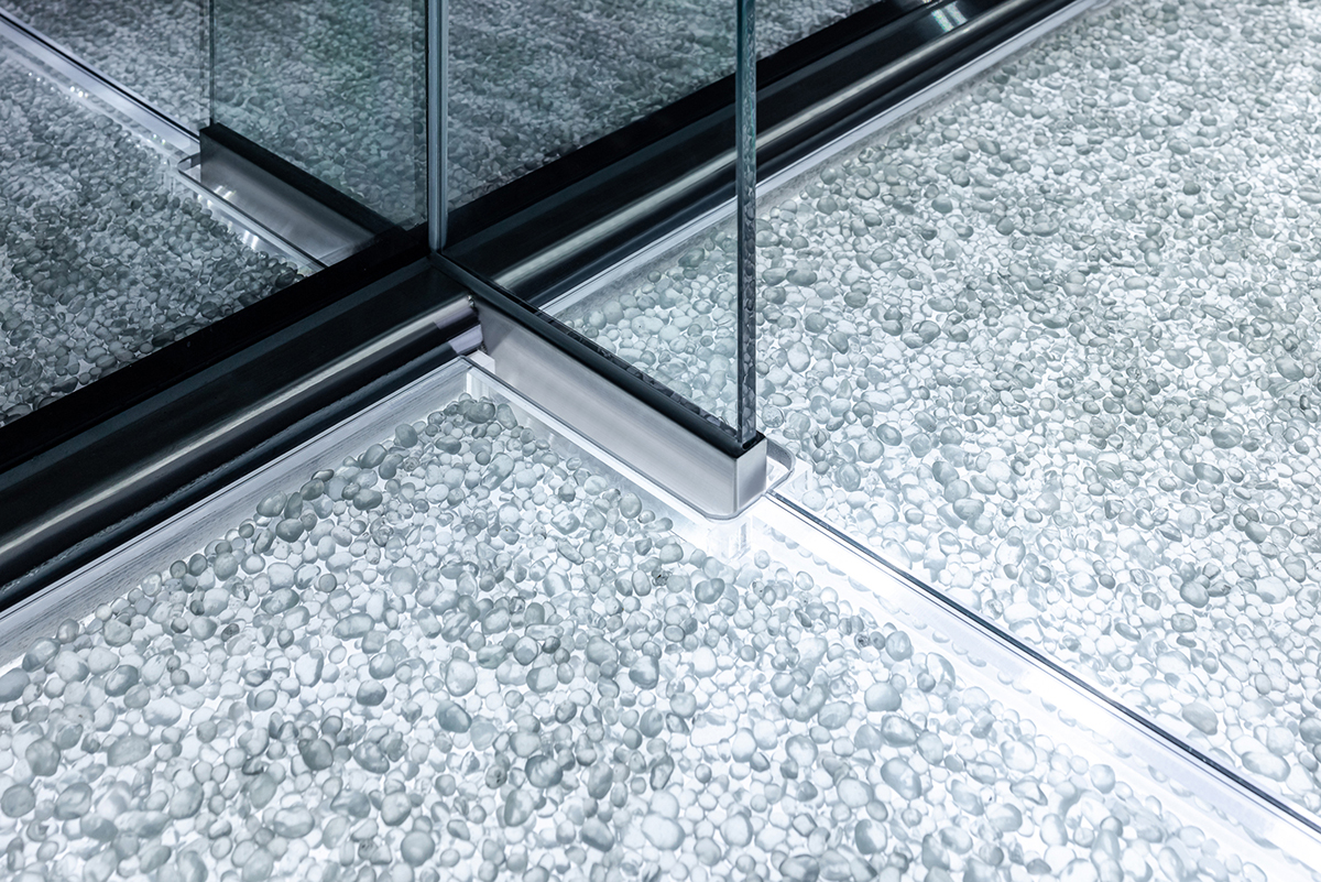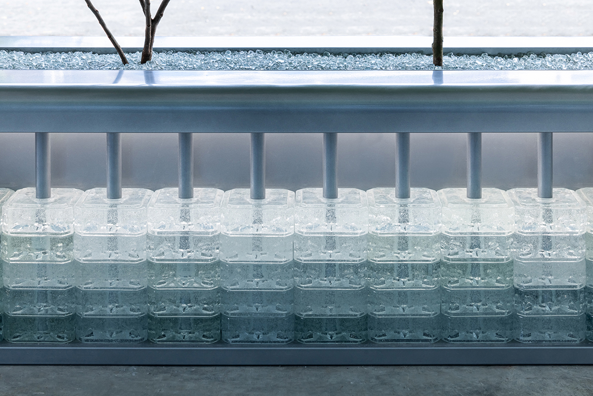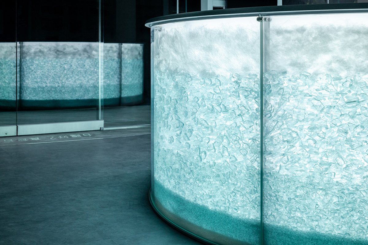 The reception counter directly faces the store’s entrance. Its arc-shaped glass is filled with five layers of recycled glass waste different in source and grain size. People who walk casually around the counter will see the glass waste refracting the light into the twinkle of grains. Its rammed earth-like configuration comprises particles from small to large, which not only recounts the rolling and breaking processes of glassware recycling but also reflects Gogoro’s constant endeavor to refine and upgrade itself in terms of circular energy network and industrial technology. The business counter at the inner flank employs a gray glass top to continue the vocabulary of glass. Its fretwork structure provides a direct contrast with the solid reception counter. The salesclerks can receive and negotiate with customers, keep customers’ files, and help customers check out step by step along the inner arc of the ∞-shaped service counter, thereby forming a functional loop of sales and services.