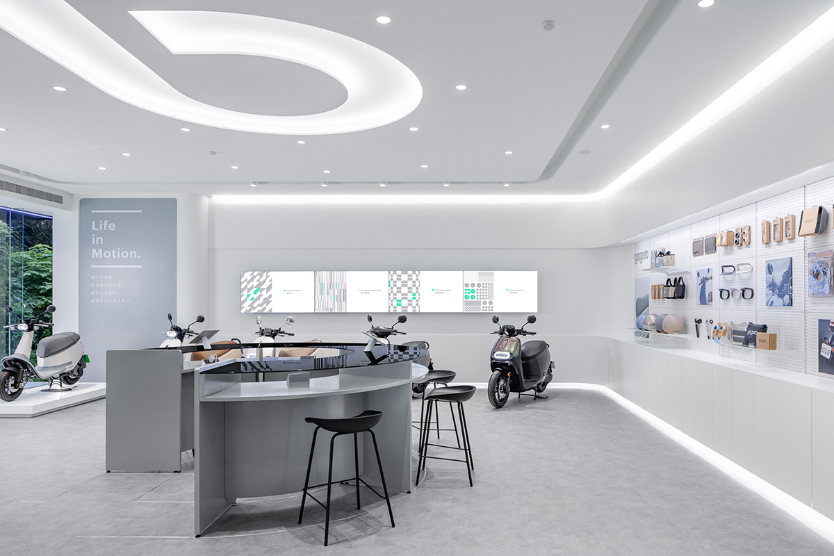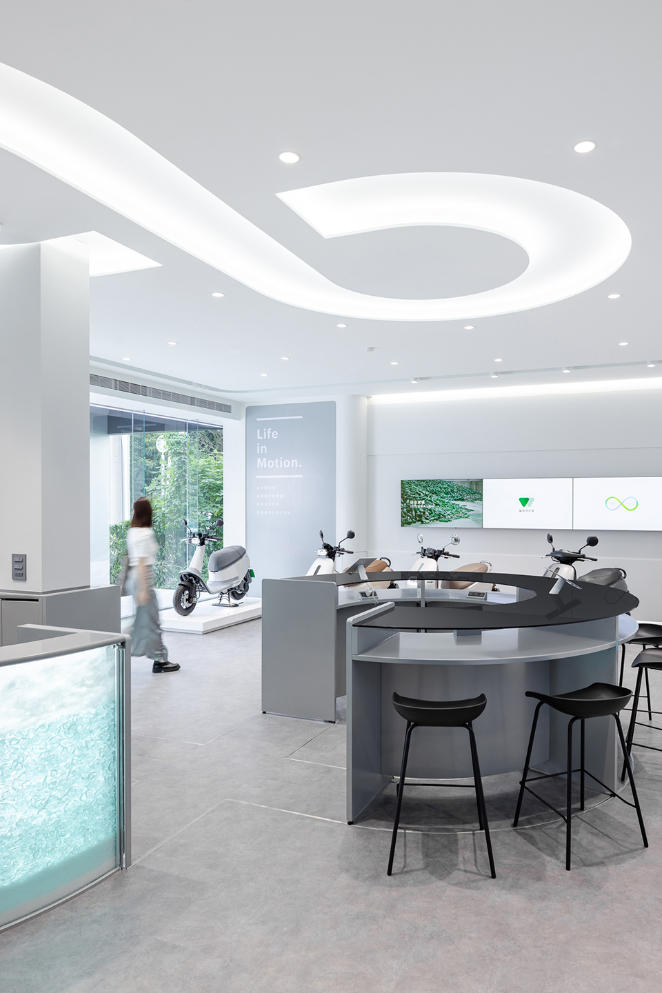 The design concept is based on “∞,” the symbol of Gogoro’s POWER LOOP services. The imbricated dual curves on the ceiling imply the cycle of innovation and energy. The symbol is transformed into a solid service counter composed of two glass cabinets at the center of the RS space, which integrates the entire sales process including reception, demonstration, negotiation, selection, delivery, and check-in. The customers enter the “∞” loop and become part of the sustainable energy cycle as they walk around the counter to complete the sales and service process.