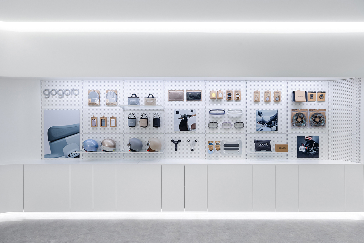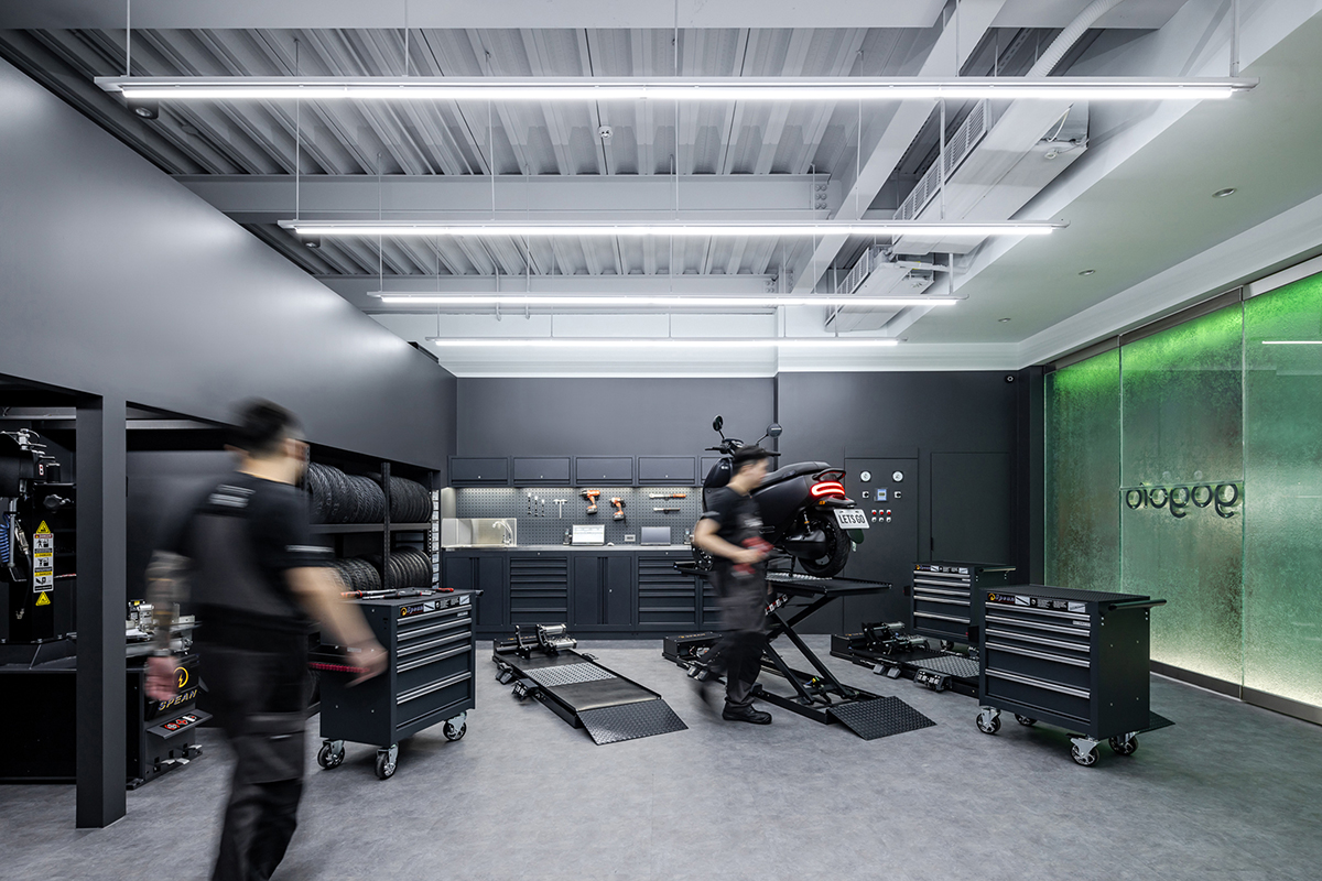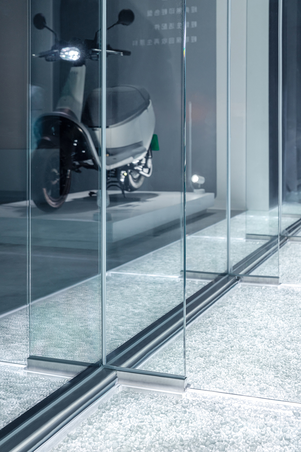 With the transparent texture of glass, the visible maintenance space beckons, inviting customers to come closer to it. The translucent floor-to-ceiling display windows comprise three panels of etched glass. The “gogoro” bubble glass lights hung on the display windows are handmade by the glassblower from the Spring Pool Glass, using a special technique to make the bubbles float inside the glass. The exquisite glass texture not only creates its own dialogue with the professional image of the CS (maintenance) space, but also makes Gogoro’s pursuit of brand quality shine more brilliantly.