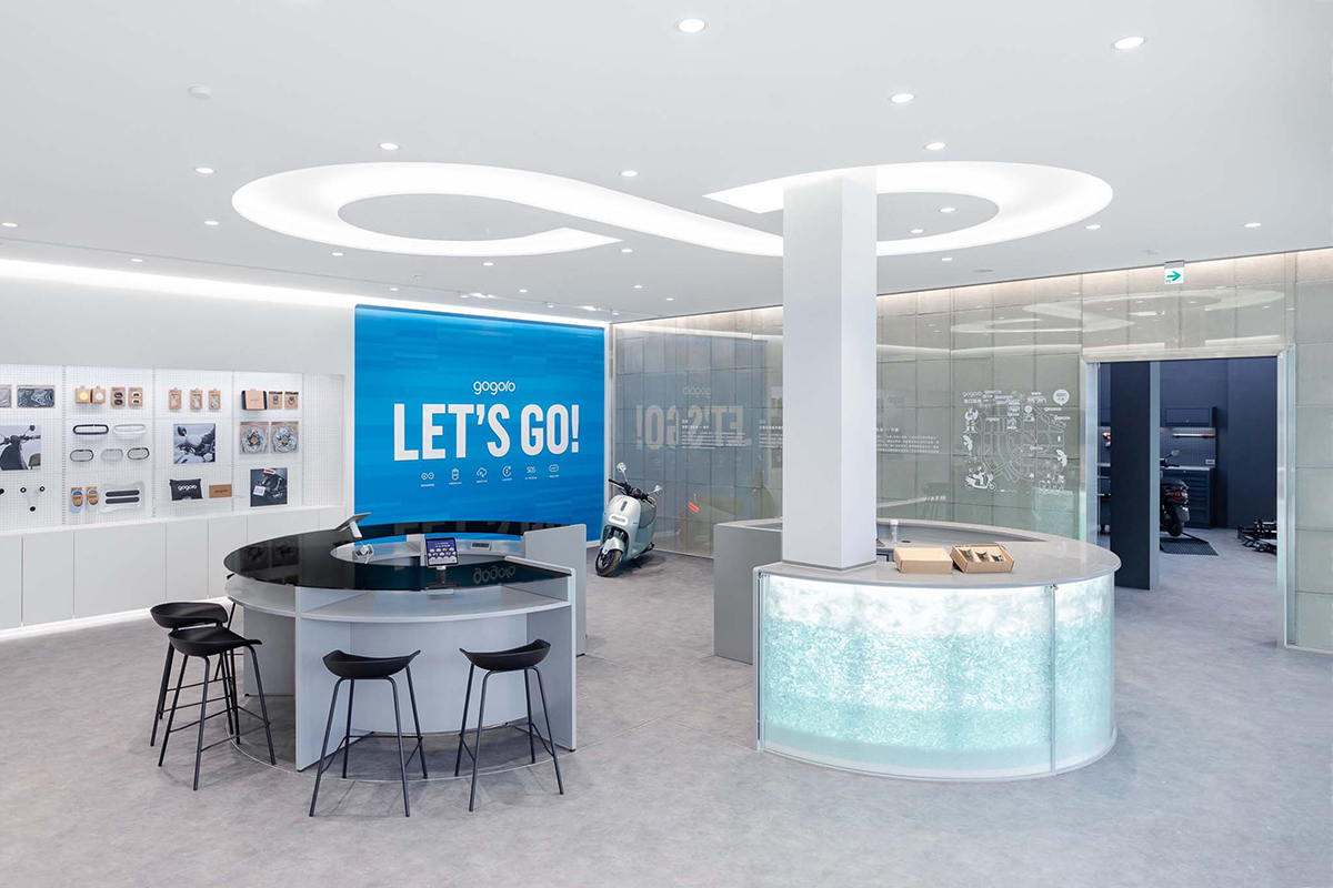 設計概念源於Gogoro電力服務的POWER LOOP —「∞」符號,以雙弧曲線交疊象徵創新與能量的循環,在RS空間中心立體化為兩座玻璃組構成的服務櫃台,整合現有門市中從接待、展售、洽談、選配商品到交車打卡等銷售流程,於環繞櫃檯完成售服步驟的同時也將顧客自身帶入「∞」LOOP中,成為永續能源循環的一員。