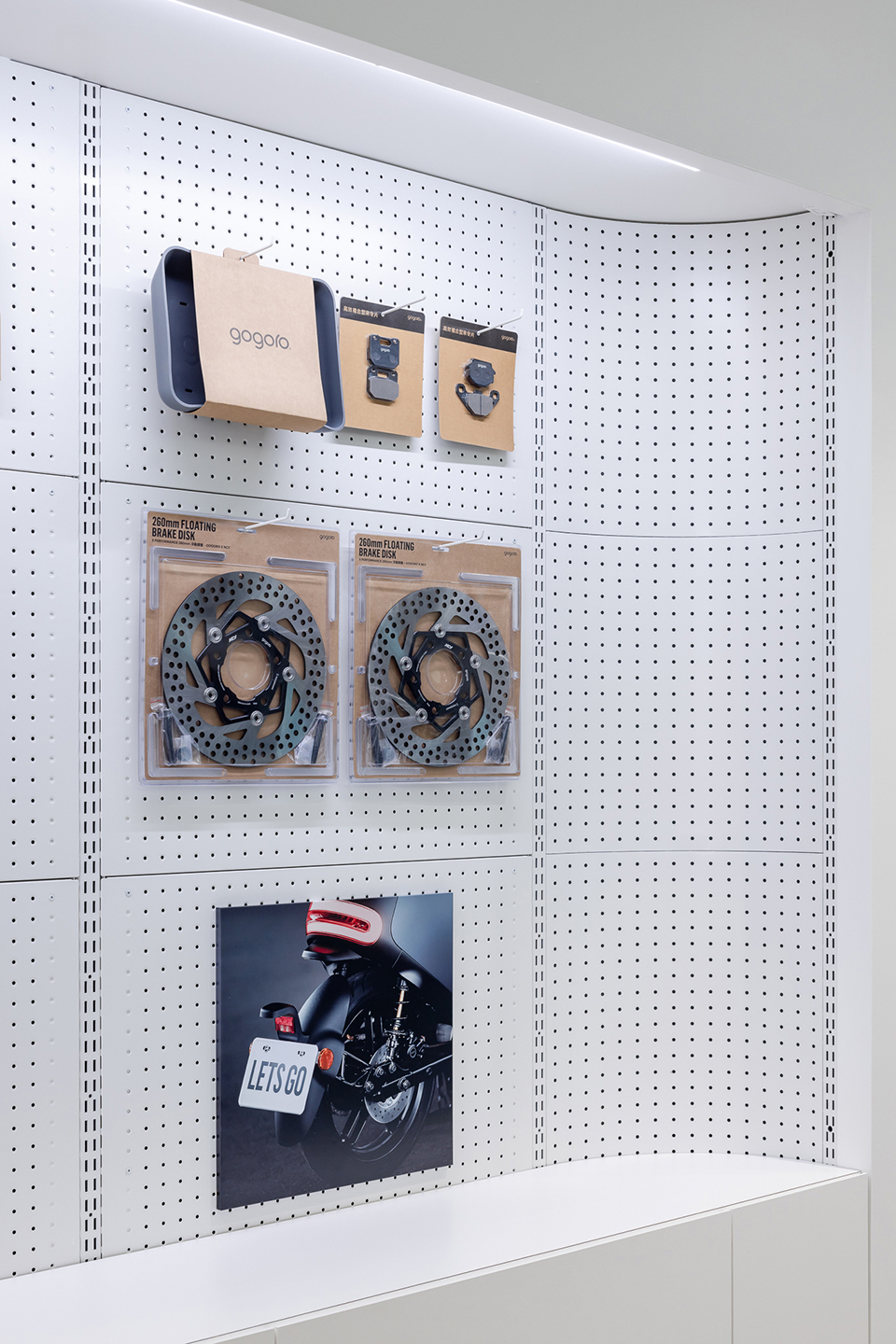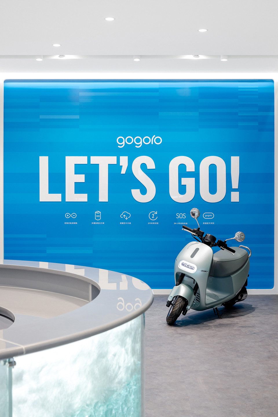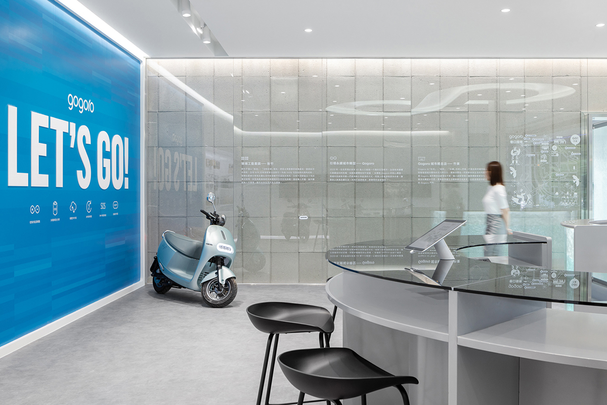 對應於「玻璃」的通透質地,透明化的維修服務空間拉近與顧客間的距離,透過三道落地的蝕刻玻璃形成半透明的展示櫥窗。玻璃上方掛載的Gogoro氣泡玻璃燈字由春池的玻璃師傅手工製成,以特殊工法使氣泡漂浮於玻璃內部,工藝般精緻的玻璃紋理與CS(維修)空間的專業形象產生對話,並與Gogoro企業對品牌品質的追求相映生輝。