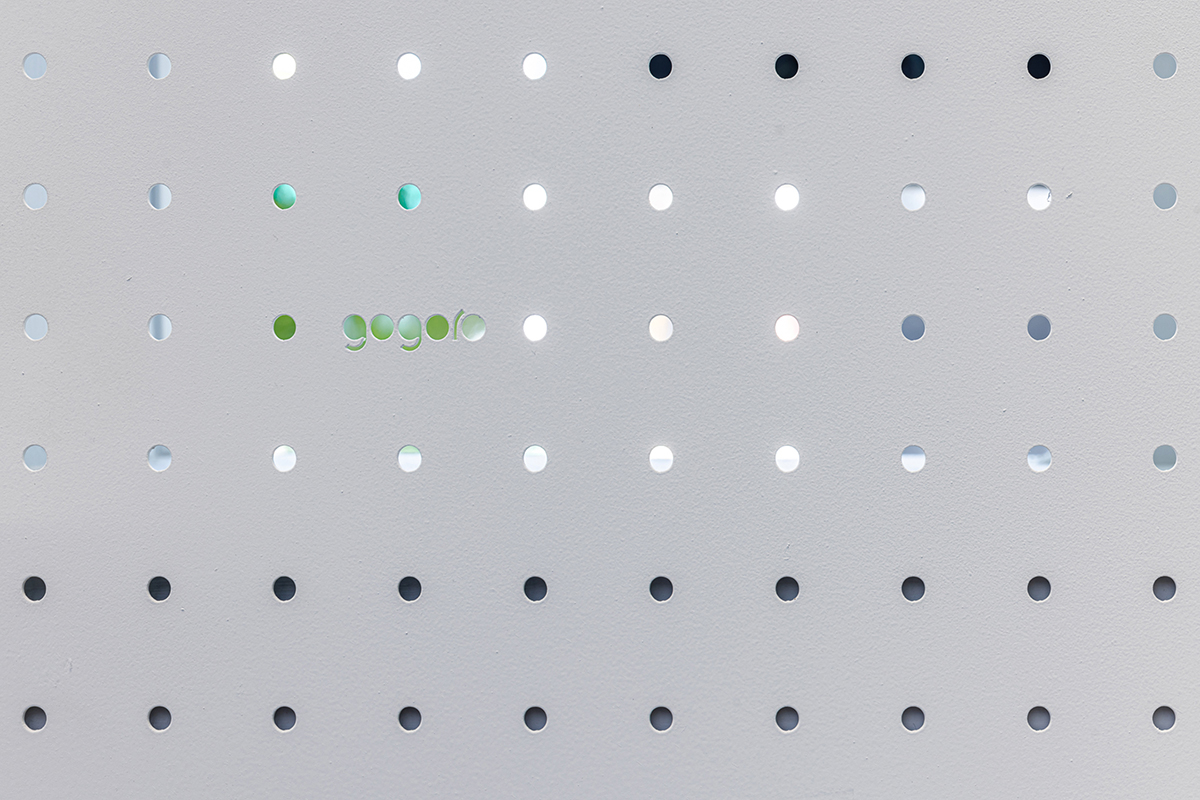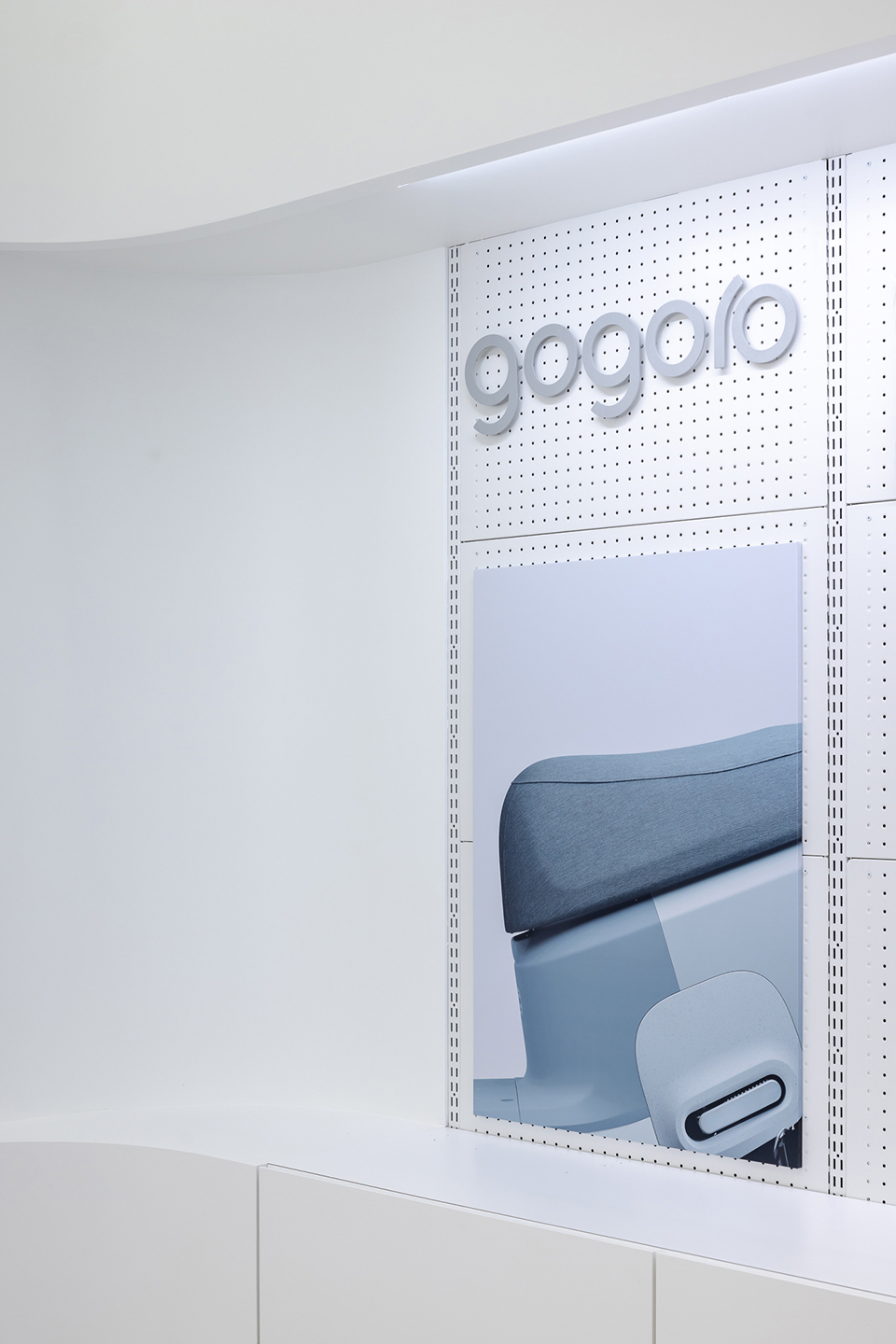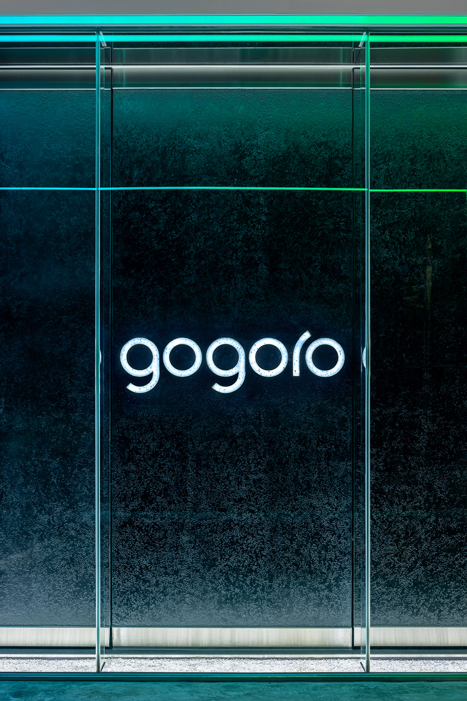 對應於「玻璃」的通透質地,透明化的維修服務空間拉近與顧客間的距離,透過三道落地的蝕刻玻璃形成半透明的展示櫥窗。玻璃上方掛載的Gogoro氣泡玻璃燈字由春池的玻璃師傅手工製成,以特殊工法使氣泡漂浮於玻璃內部,工藝般精緻的玻璃紋理與CS(維修)空間的專業形象產生對話,並與Gogoro企業對品牌品質的追求相映生輝。
