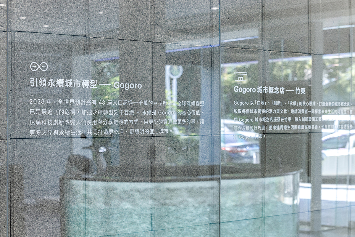 彷彿一聲鏗鏘有力的客語問候,親切向竹東問好,以金屬字鑲嵌於入口地坪。自日治時代起,竹東就成為玻璃工業的重要據點,竹東概念店透過100%可循環回收的再生建材–「玻璃」的介入,喚起老一輩新竹人的共同城市記憶,也更映照出Gogoro與春池企業對永續能源和台灣在地色彩的關注與投入,期許能更貼近地區生活並展現新的永續風潮!