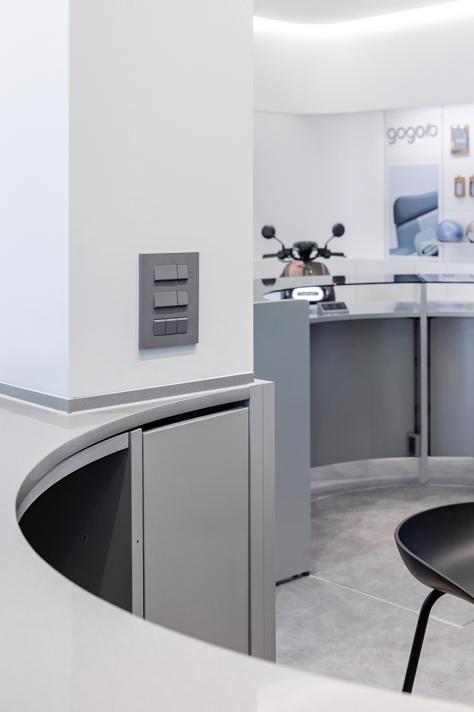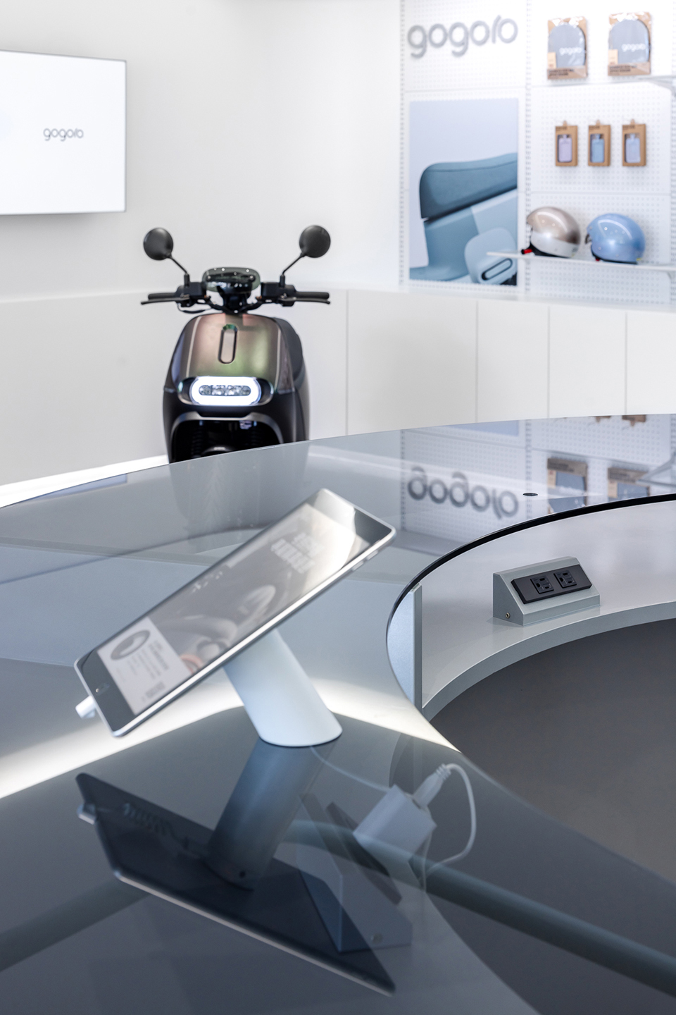 面對門市入口的接待櫃台,於弧型玻璃內填充五種不同粒徑與來源的回收玻璃廢料,在不經意地行走間折射燈光不斷閃爍。由小至大的顆粒組構如夯土般層層堆疊的立面畫面,描繪玻璃器皿於回收再生中逐步滾動、碎形的過程,同時回應Gogoro品牌在建立循環能源網絡與提升工業技術中持續去蕪存菁、向上升級;內側的洽談櫃台以灰玻作為檯面延續玻璃語彙,簍空的桌體結構與接待櫃檯的夯實產生的輕重對比。門市人員可於櫃台內弧中逐步完成接待到洽談作業,順著「∞」記號整合收納、收銀形成屬於售服的機能LOOP。