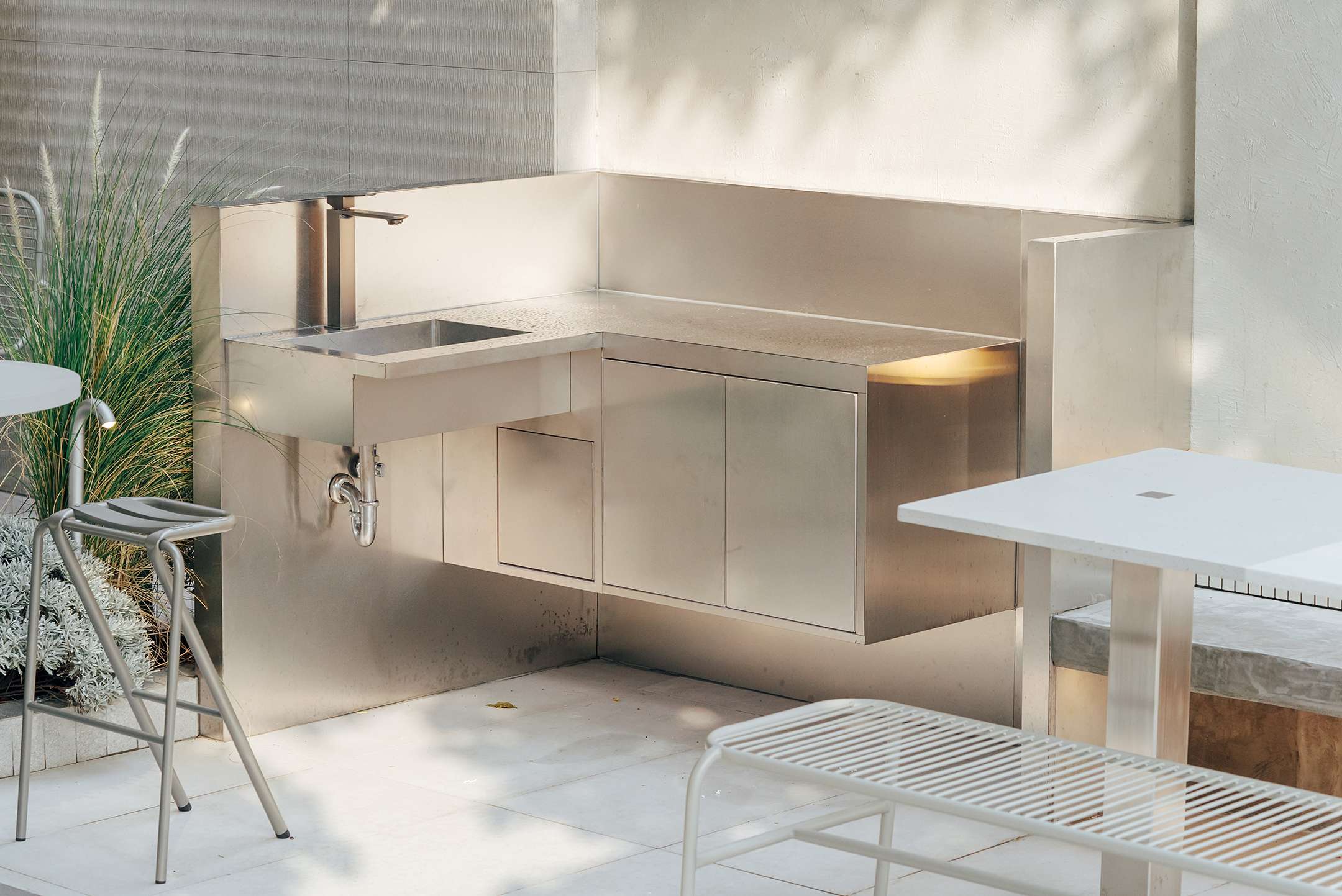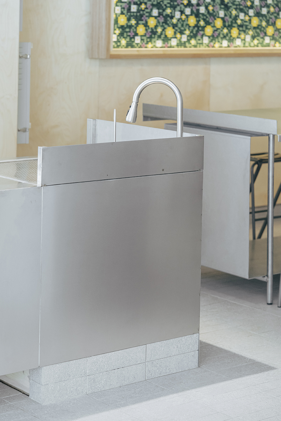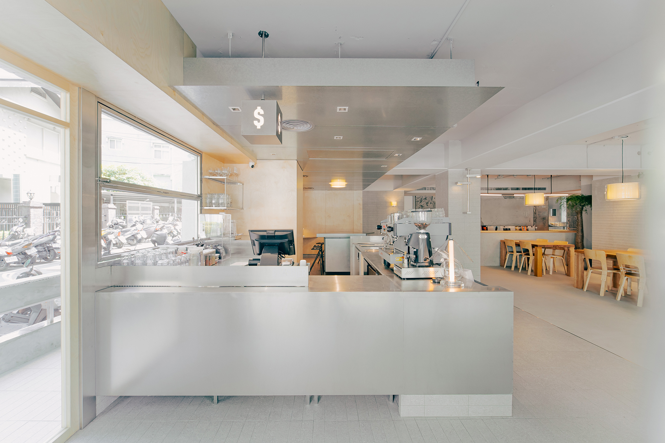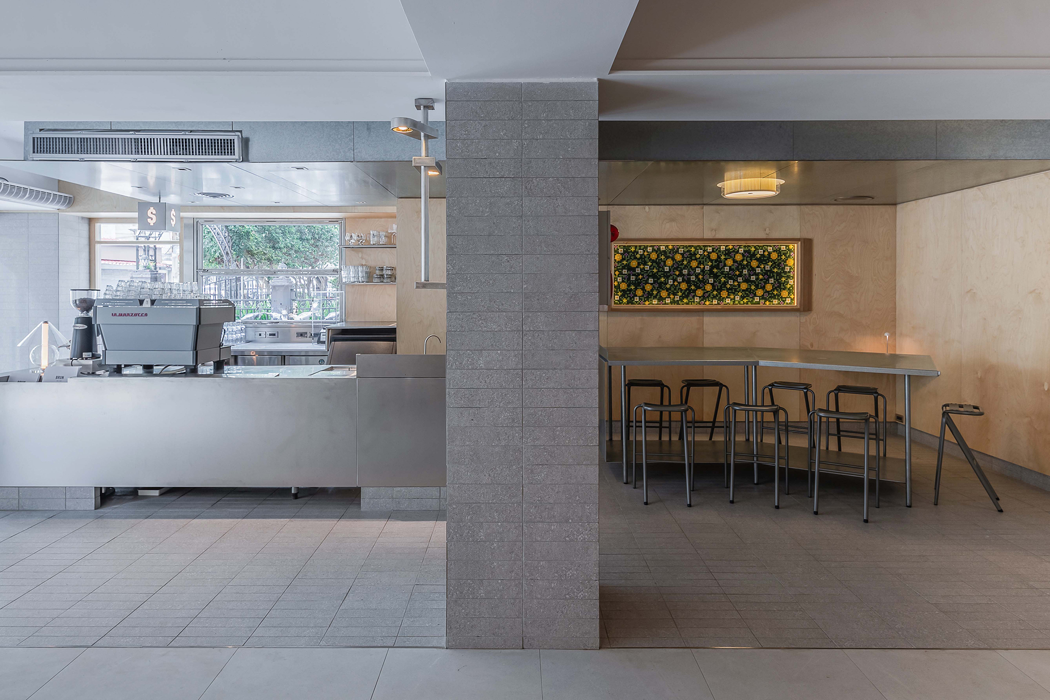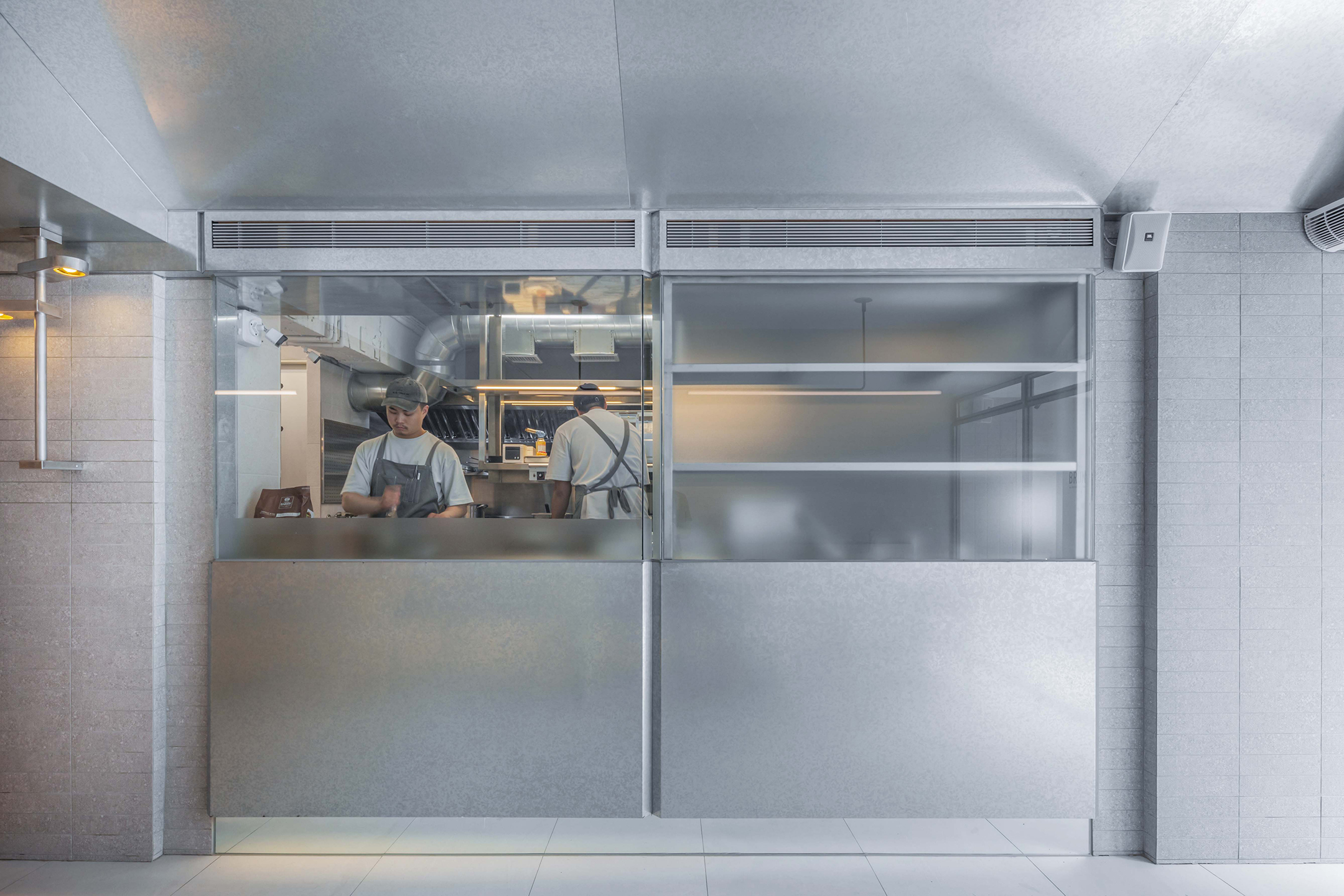 因應室內ㄇ字型格局,我們以內側大磚、外側小磚來定義不同機能的空間屬性,並透過延伸戶外的地磚來打破邊界感;同時將ㄇ字劃分成內、外環,內環以木質及布面等素材營造舒適客席區,外環則以較冷冽的金屬規劃為工作檯、廚房等機能工作區。