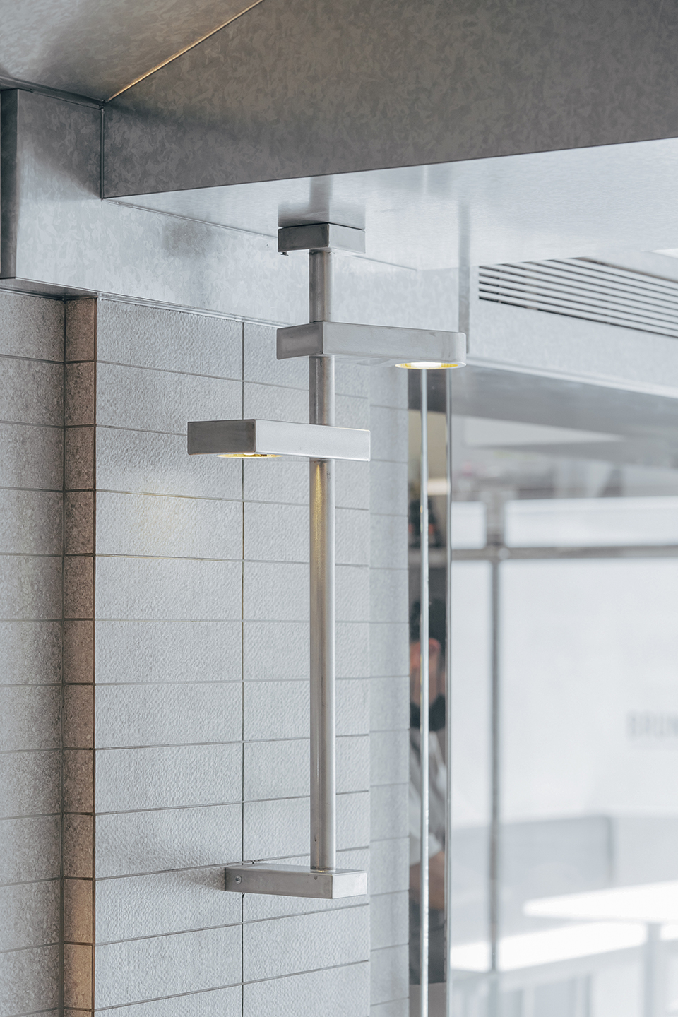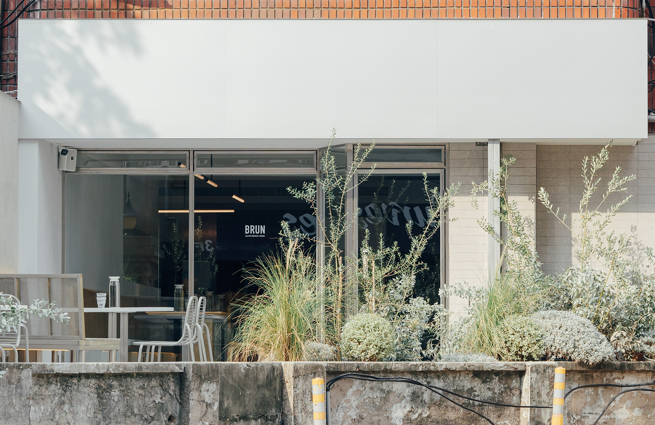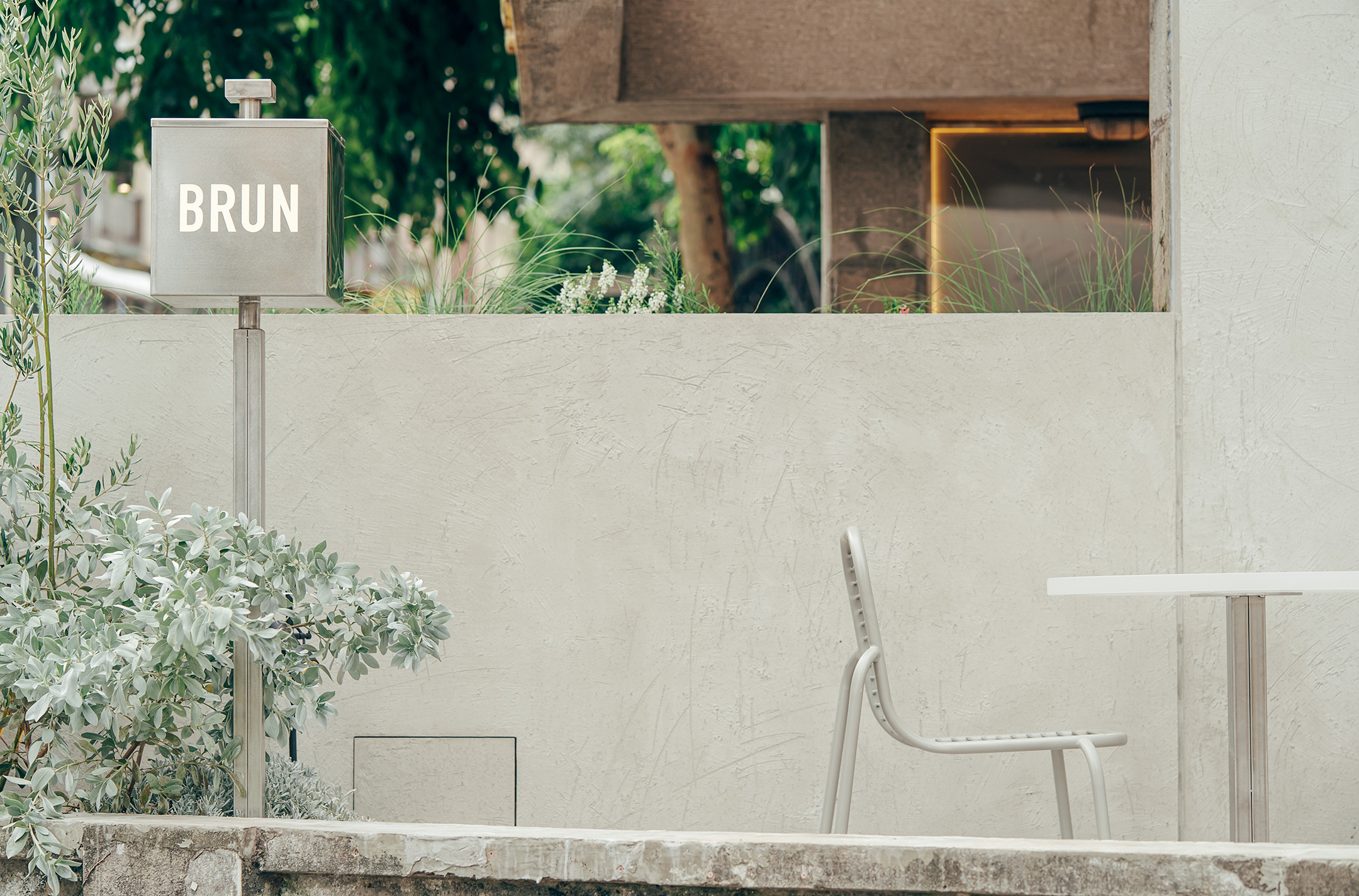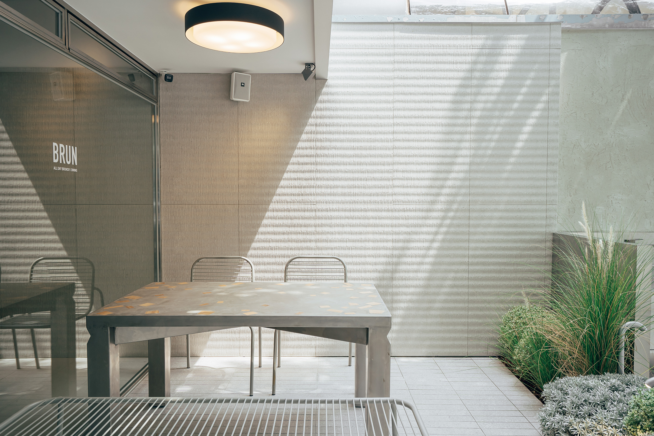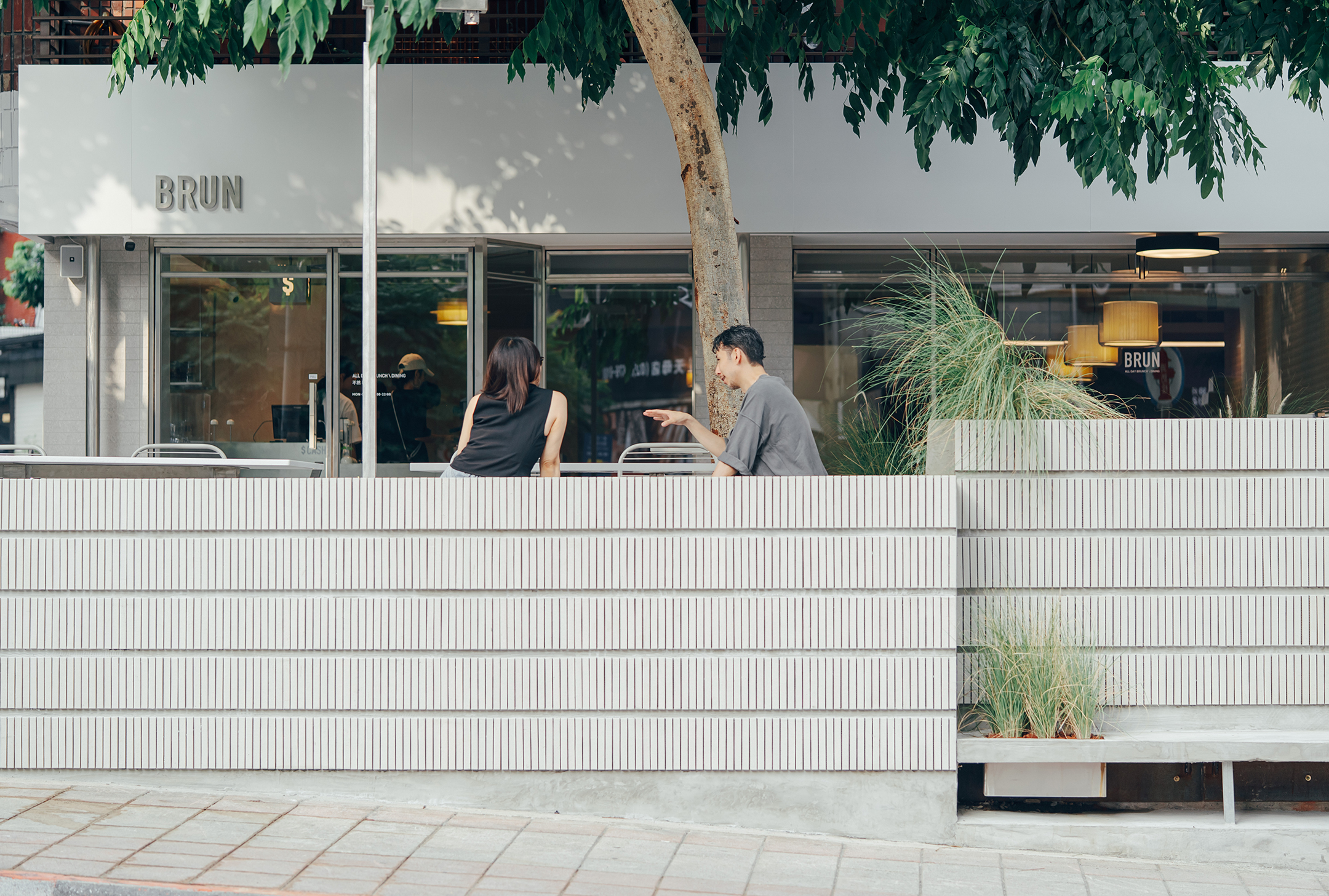 緊鄰庭院的室內外牆面則貼上大器又富自然肌理的大面波紋磚,似水波,又像有落雨的淅瀝聲,切合 BRUN 不然「食材自然」的理念。外牆則以「立體感」為磁磚挑選目標,刻意拉開黏貼間隙、不填縫,演繹原始輕鬆的風貌;此外,外牆磁磚也成了門把,作為形塑店面個性的要角,以各種形式巧妙地融入店中。
