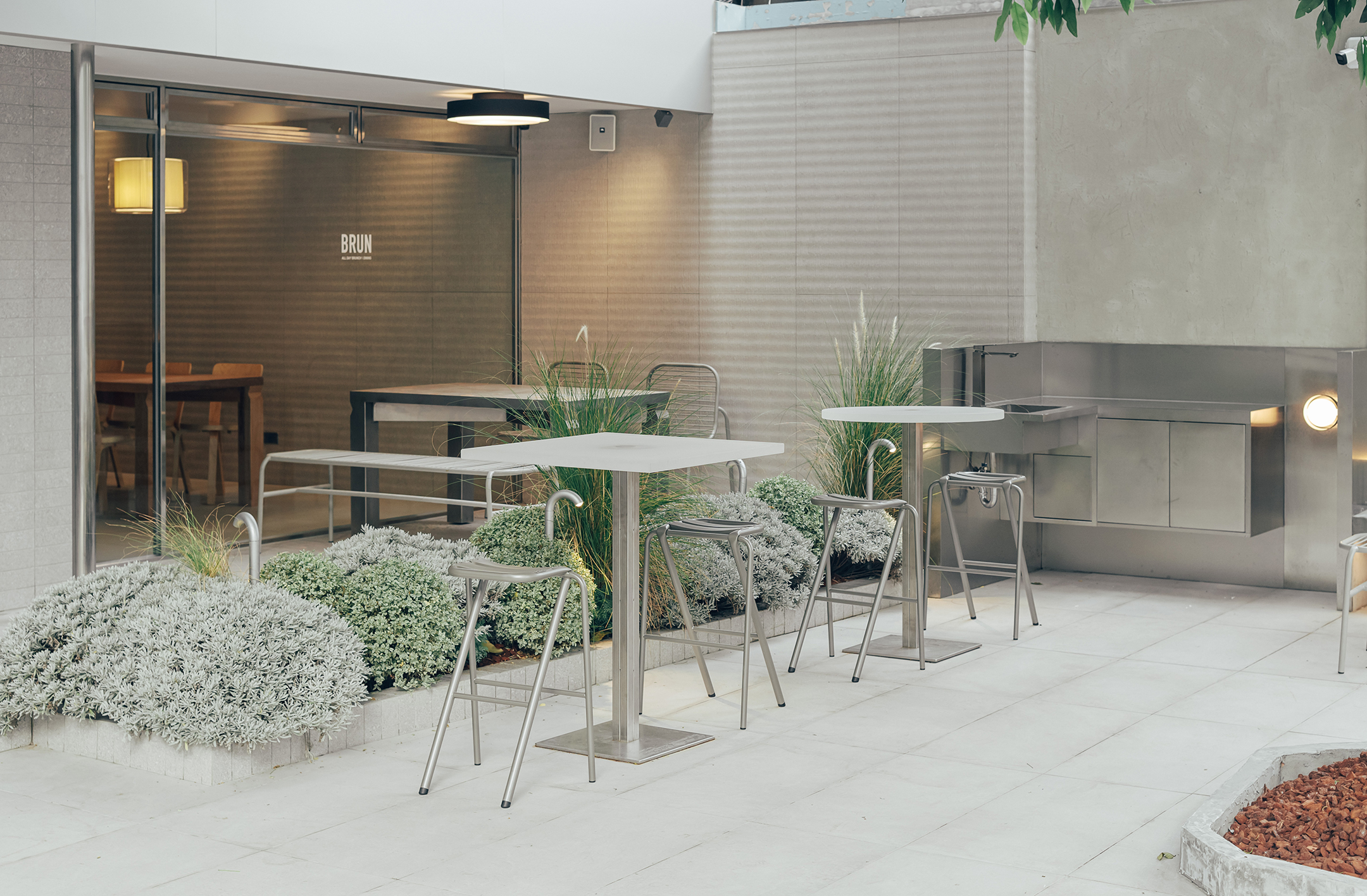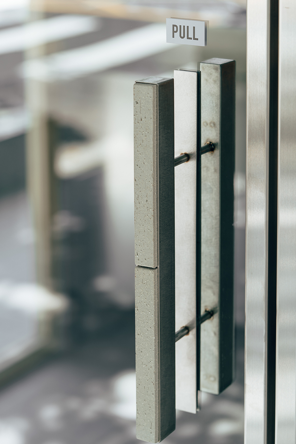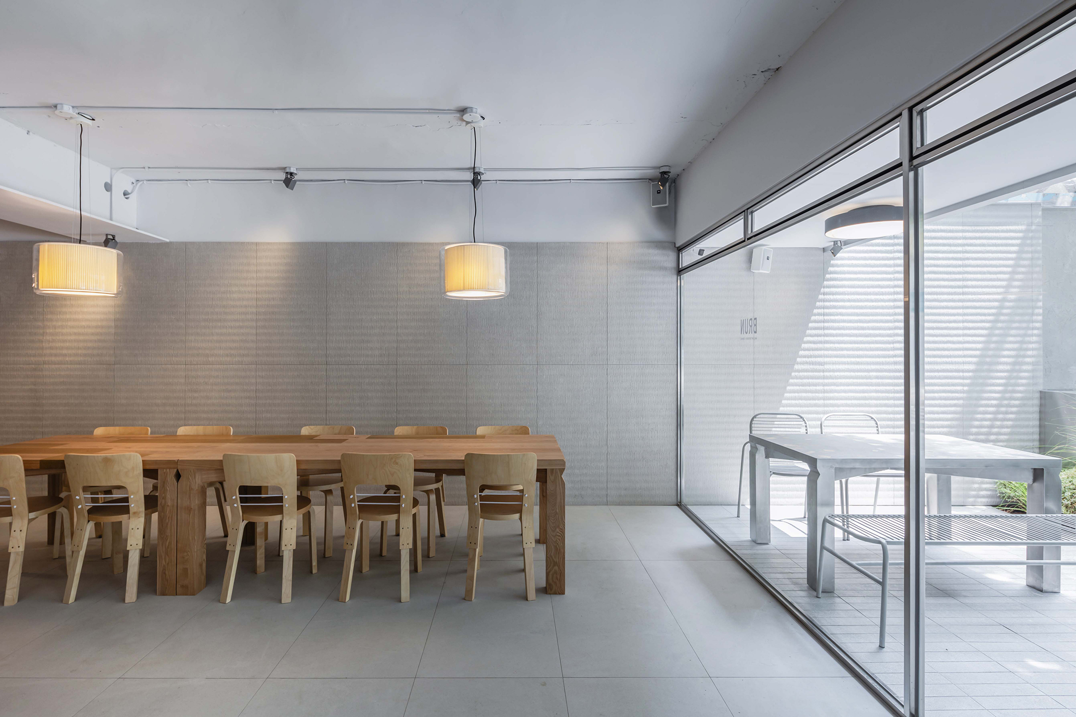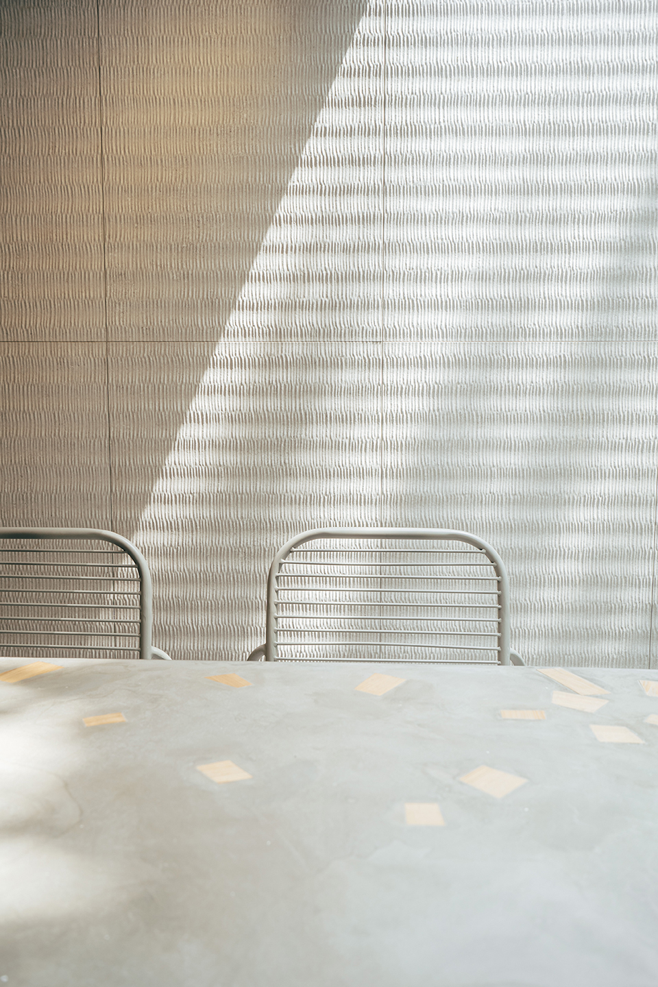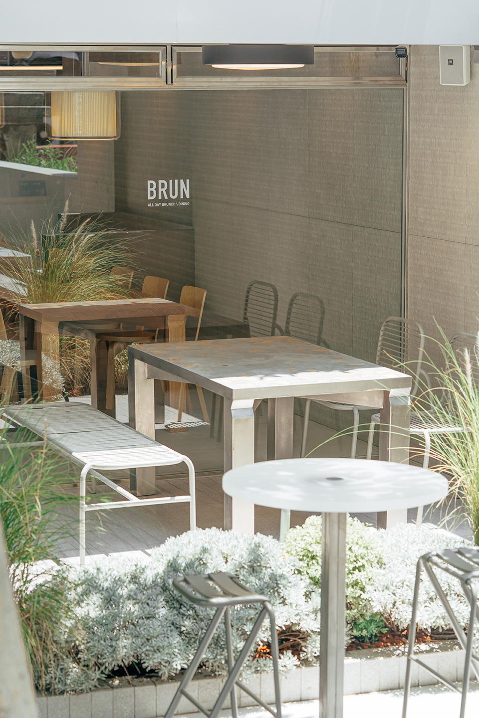 緊鄰庭院的室內外牆面則貼上大器又富自然肌理的大面波紋磚,似水波,又像有落雨的淅瀝聲,切合 BRUN 不然「食材自然」的理念。外牆則以「立體感」為磁磚挑選目標,刻意拉開黏貼間隙、不填縫,演繹原始輕鬆的風貌;此外,外牆磁磚也成了門把,作為形塑店面個性的要角,以各種形式巧妙地融入店中。