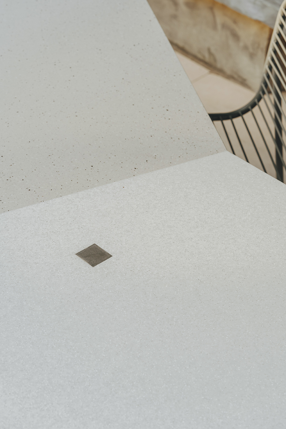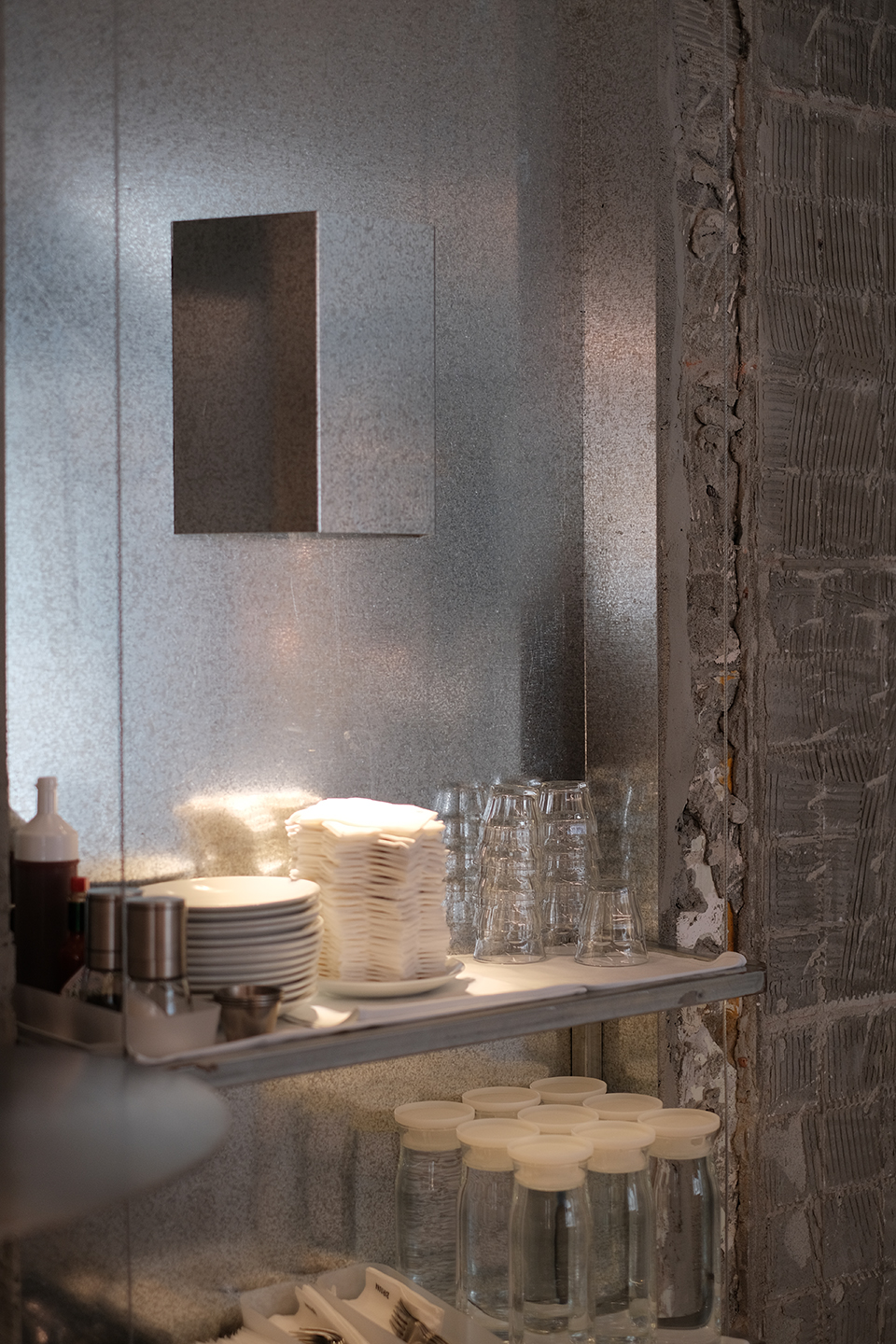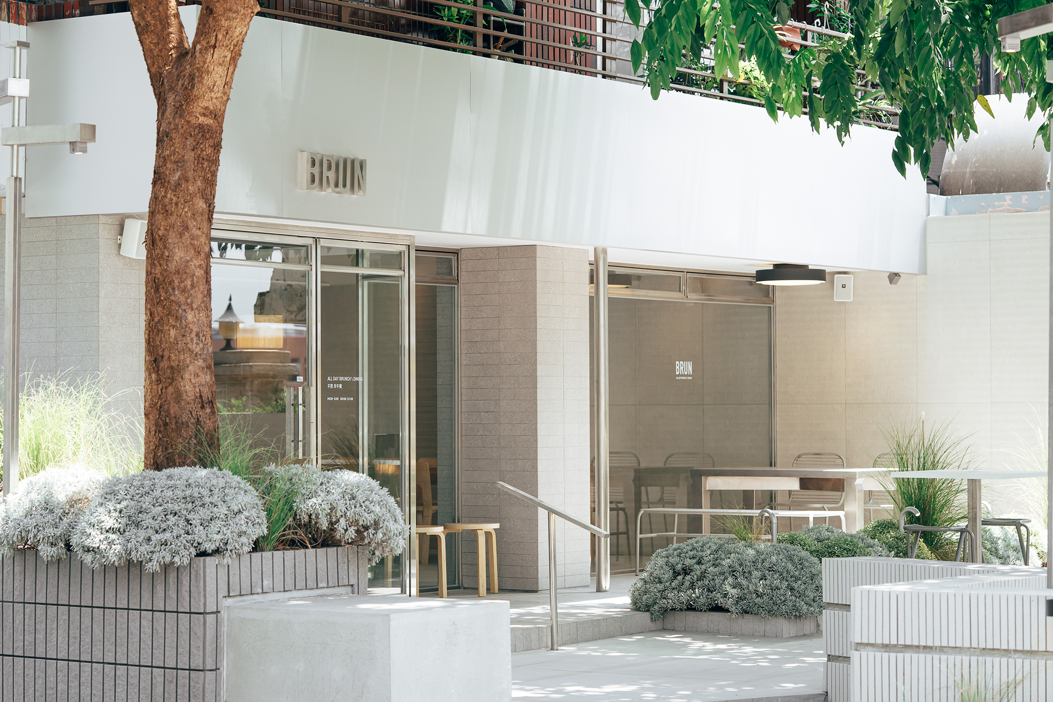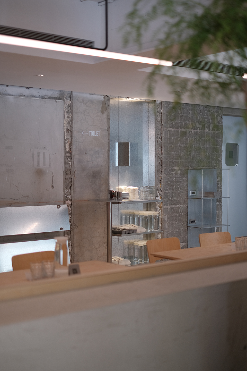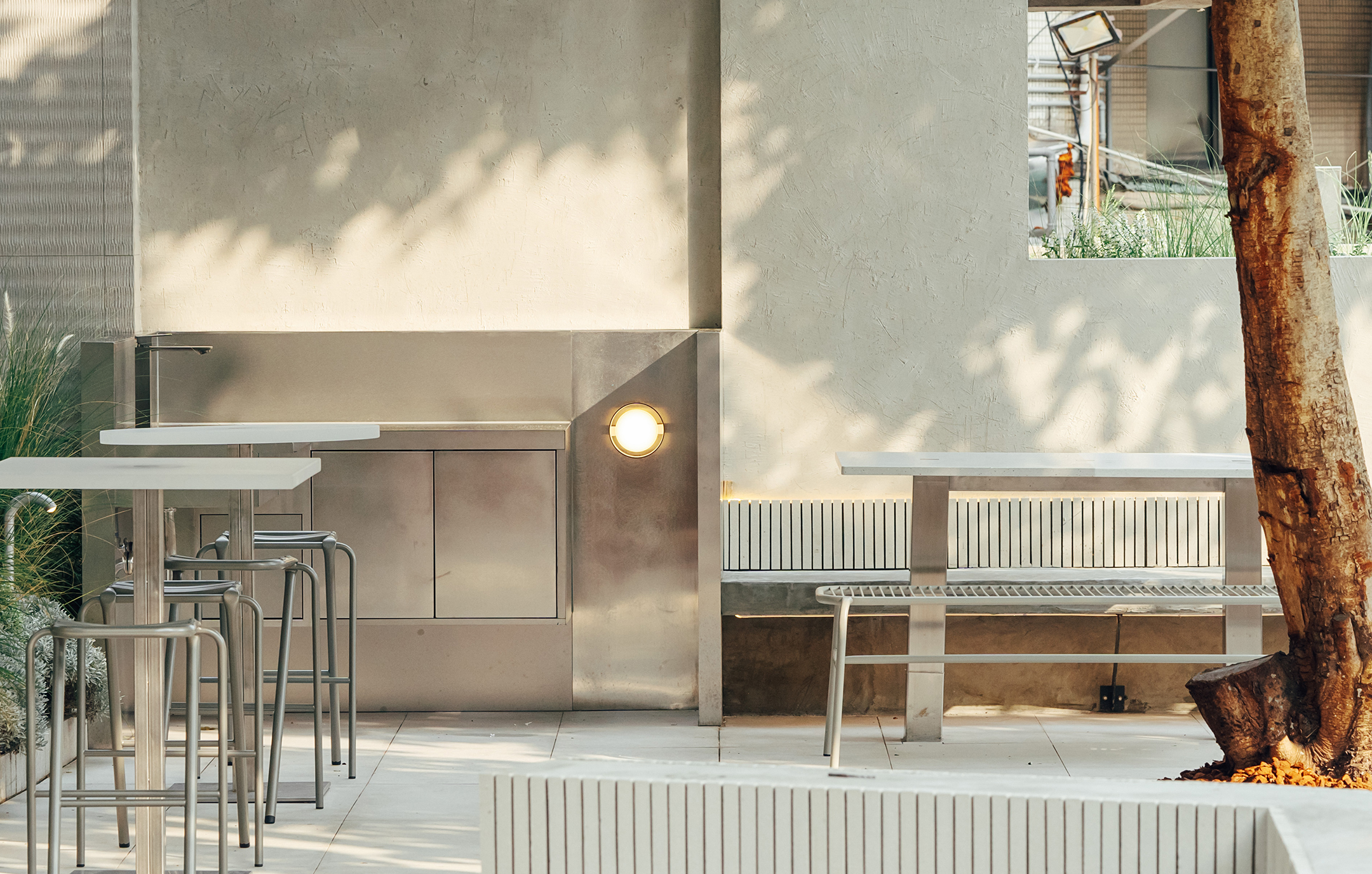 緊鄰庭院的室內外牆面則貼上大器又富自然肌理的大面波紋磚,似水波,又像有落雨的淅瀝聲,切合 BRUN 不然「食材自然」的理念。外牆則以「立體感」為磁磚挑選目標,刻意拉開黏貼間隙、不填縫,演繹原始輕鬆的風貌;此外,外牆磁磚也成了門把,作為形塑店面個性的要角,以各種形式巧妙地融入店中。