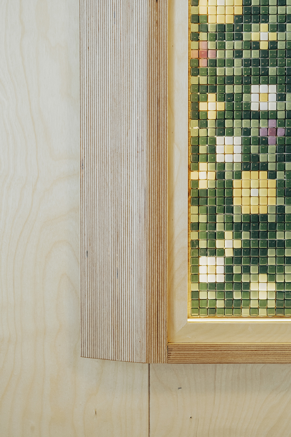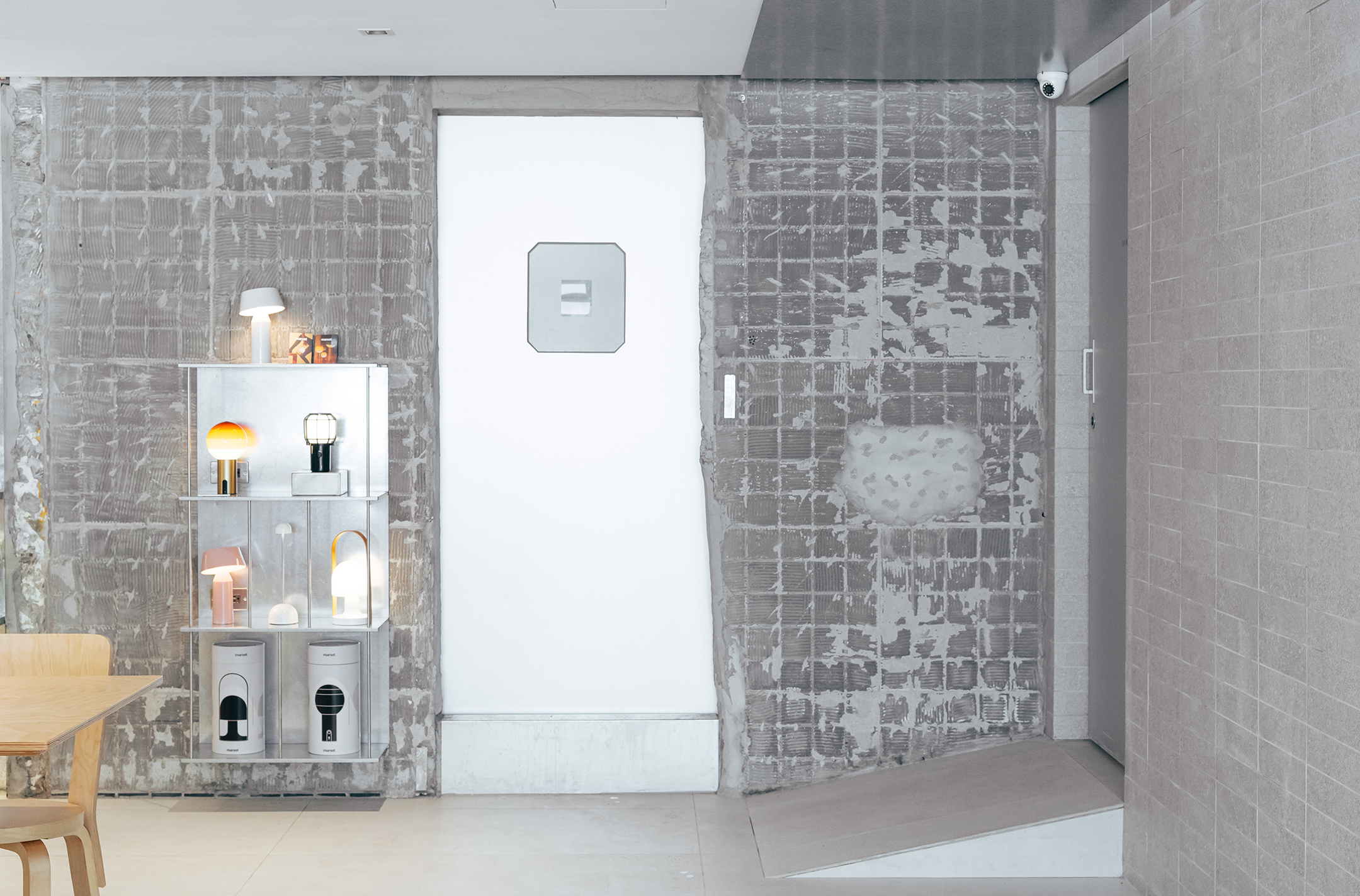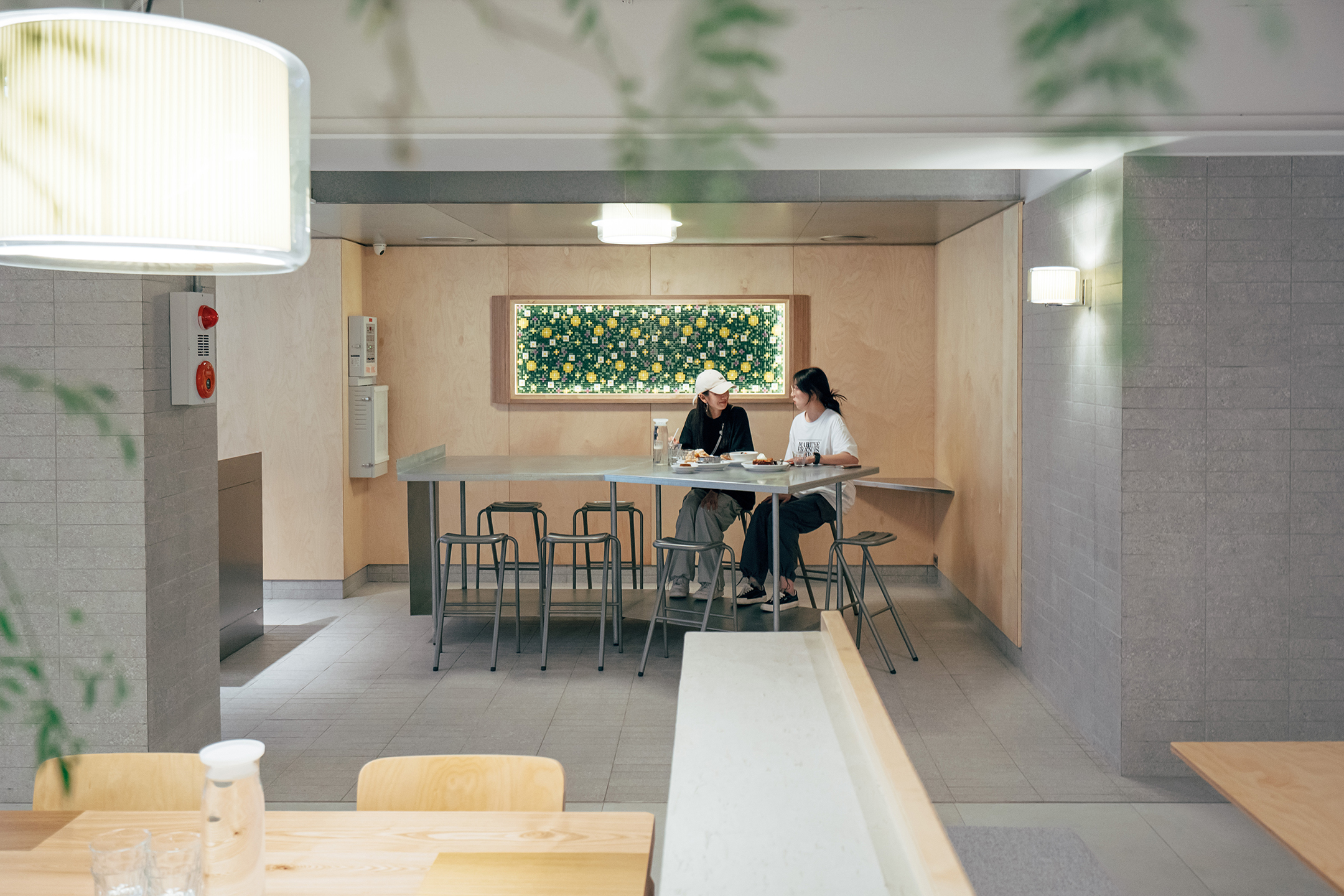 Mercer 吸頂燈巧妙以半嵌手法隱入天花板,又以鮮豔童趣的花園馬賽克畫平衡冷調視覺。與之相對的轉角,感官花子以 BRUN 不然的幽默基因安排樹型奇趣的象腳樹,和拼貼畫產生「真假植物」遙相對話的詼諧。