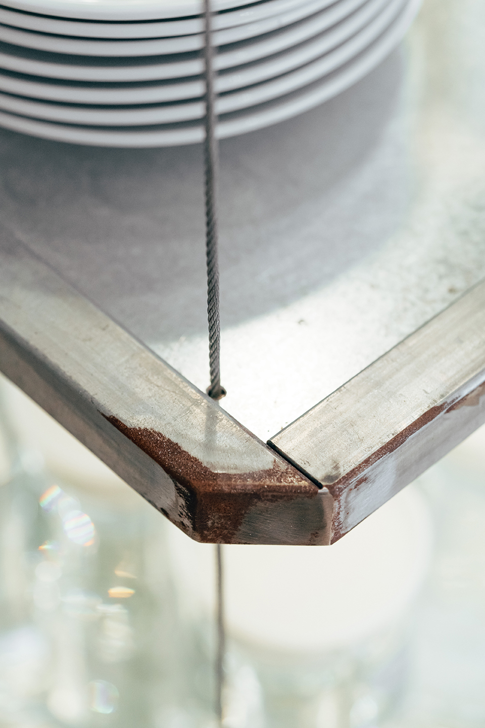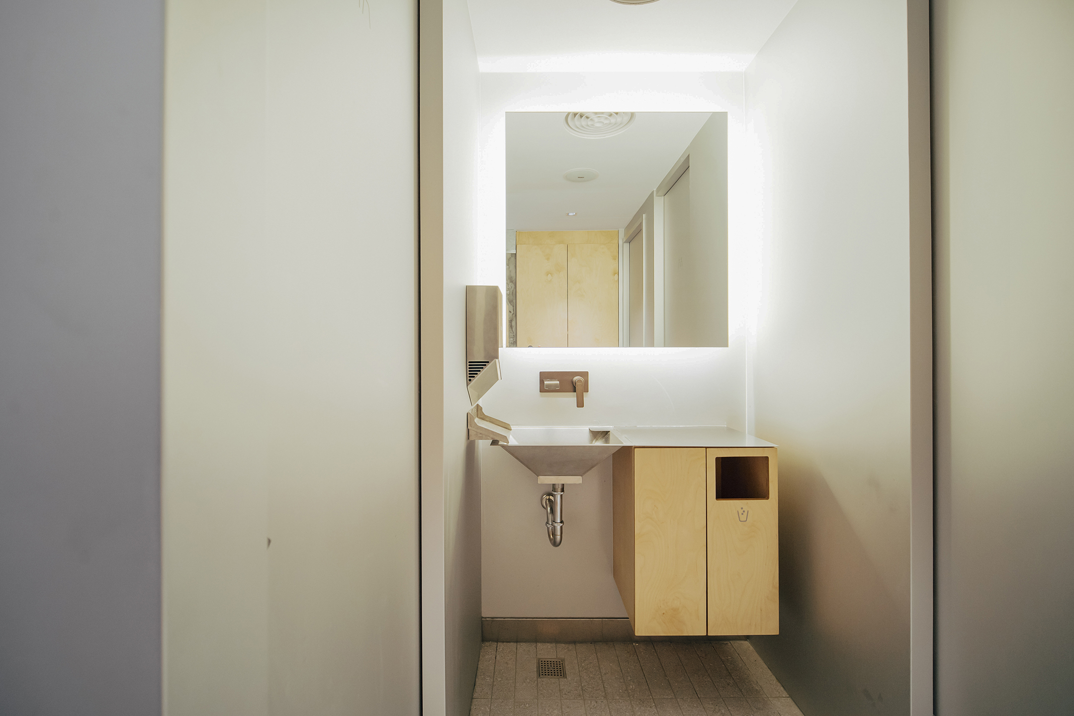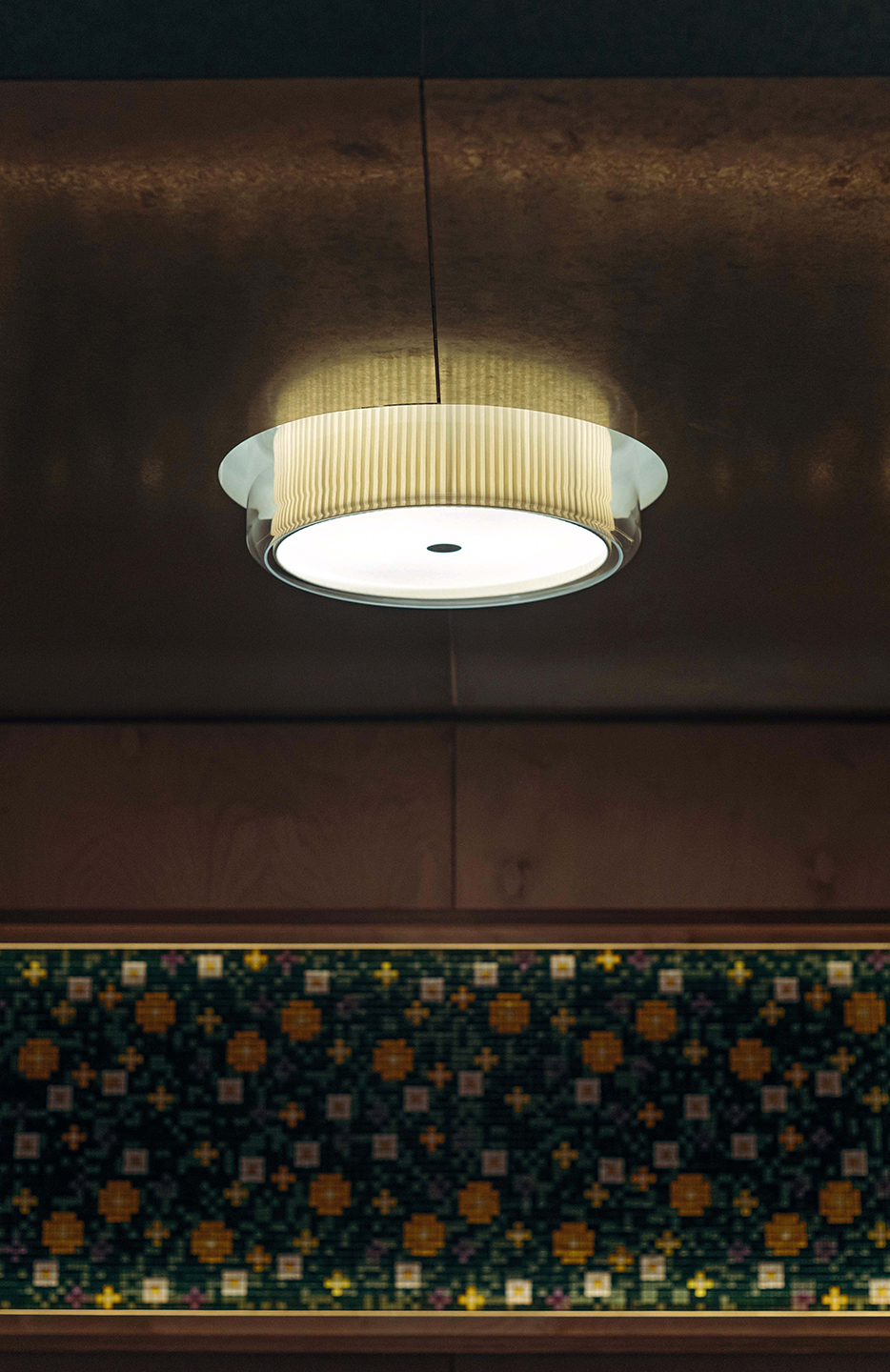 Mercer 吸頂燈巧妙以半嵌手法隱入天花板,又以鮮豔童趣的花園馬賽克畫平衡冷調視覺。與之相對的轉角,感官花子以 BRUN 不然的幽默基因安排樹型奇趣的象腳樹,和拼貼畫產生「真假植物」遙相對話的詼諧。