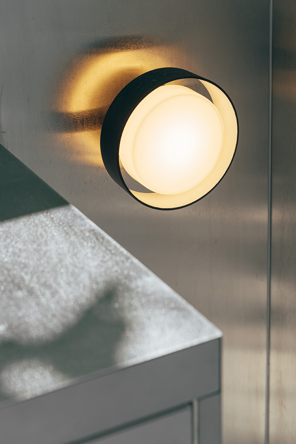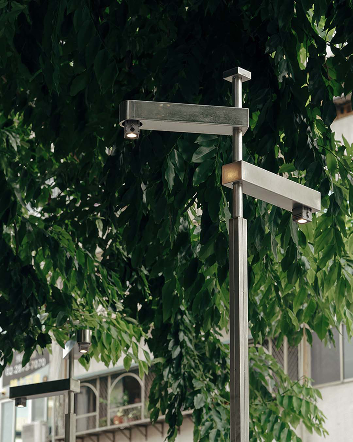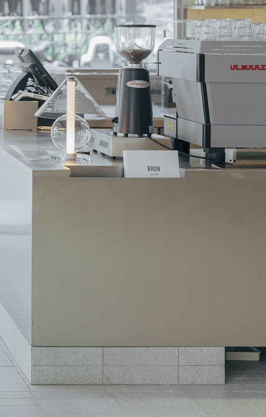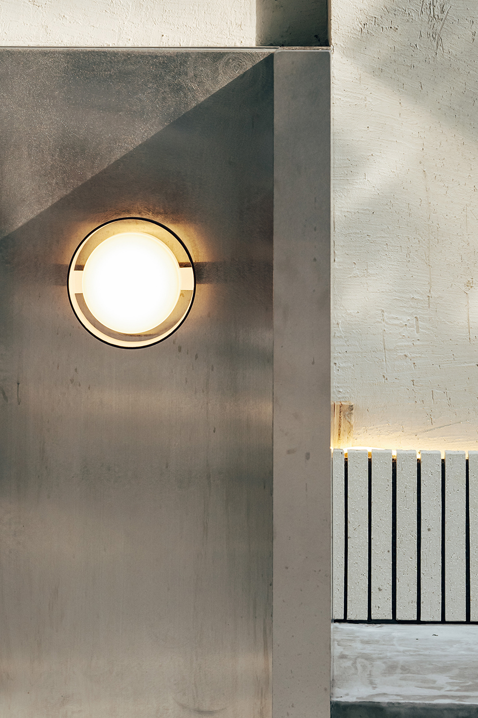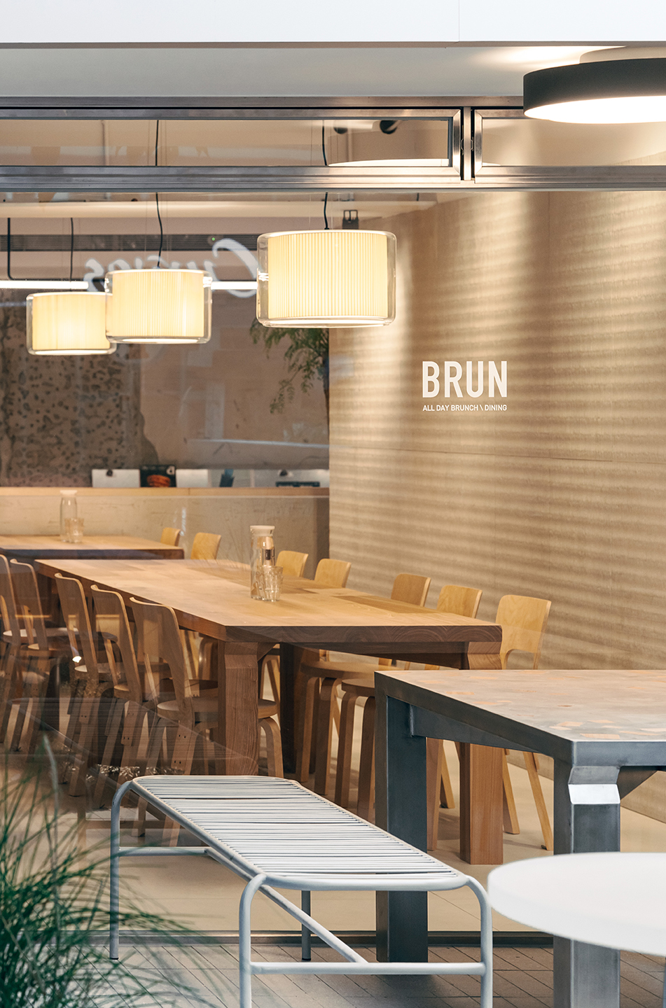 雖是早午餐店,BRUN 不然的營業時間卻是從早晨一路至夜間 22 點,融合鄰里社區的「路燈」成為造型金屬燈具矗立於庭院為夜晚帶來豐富照明,也當作壁燈設於室內座位區交界,和Marset 燈具相得益彰,看見燈具應用的不同可能。