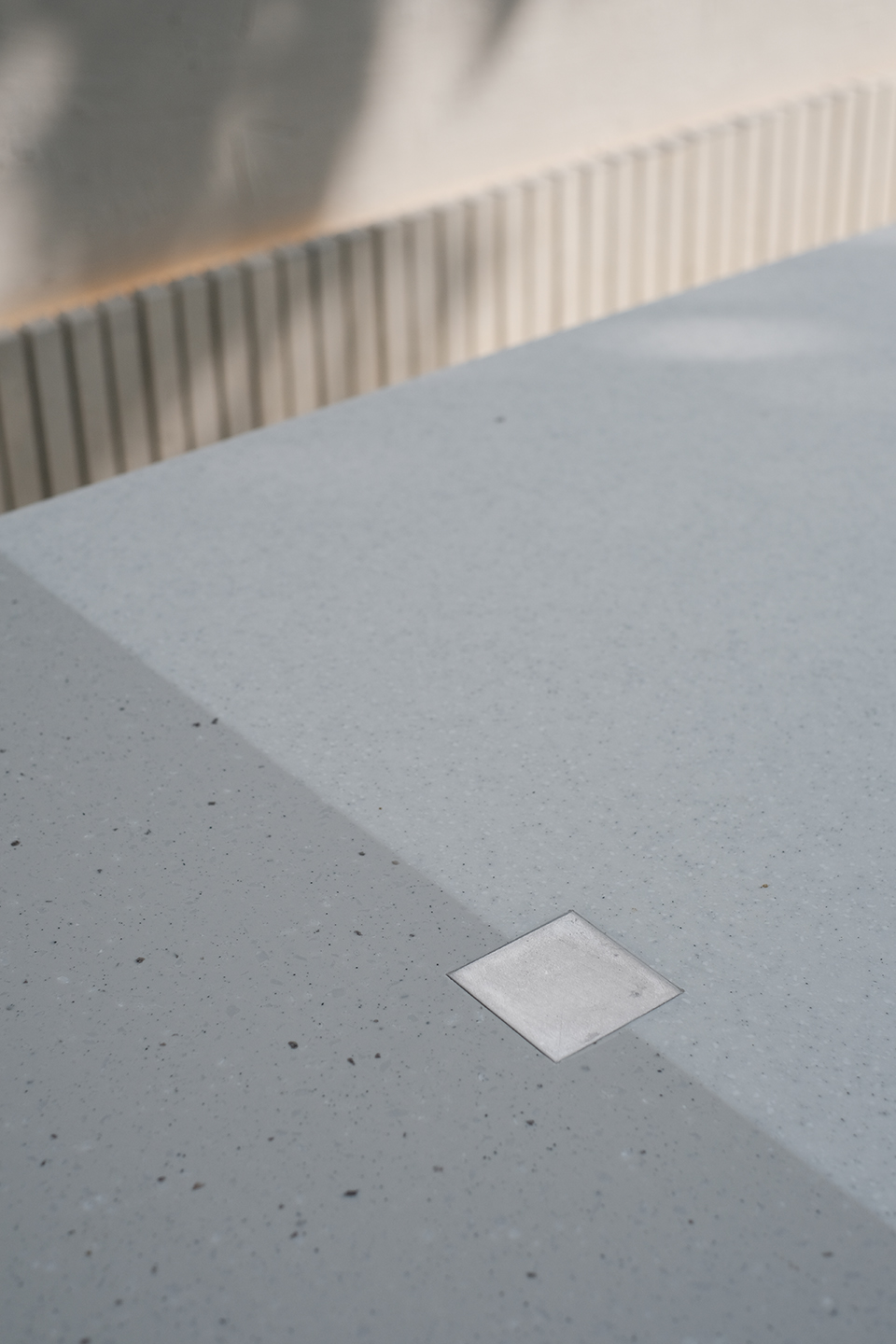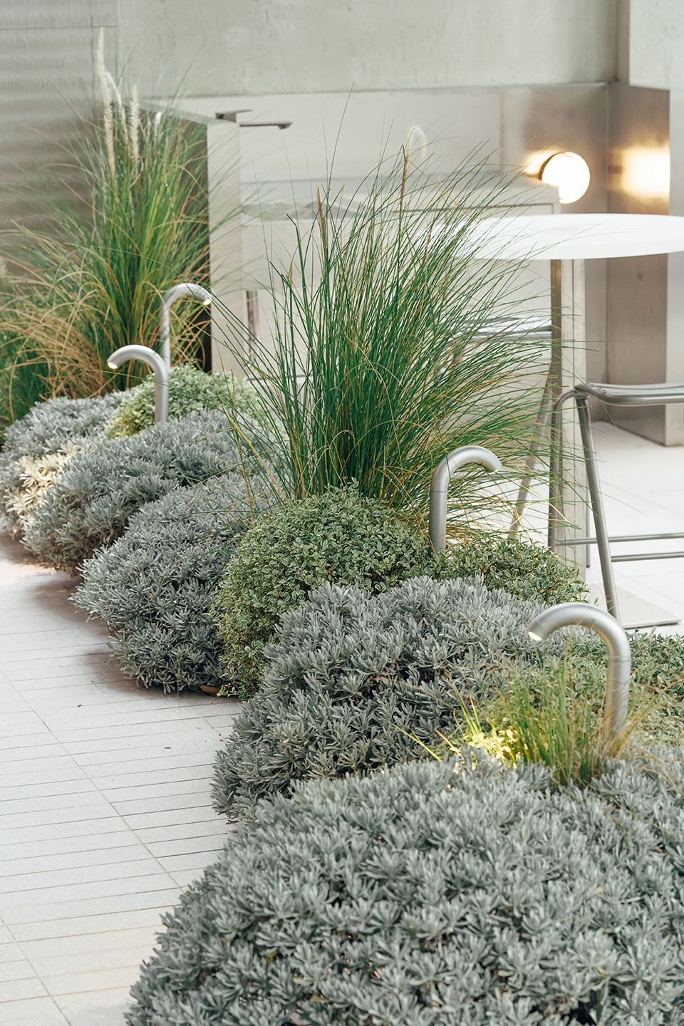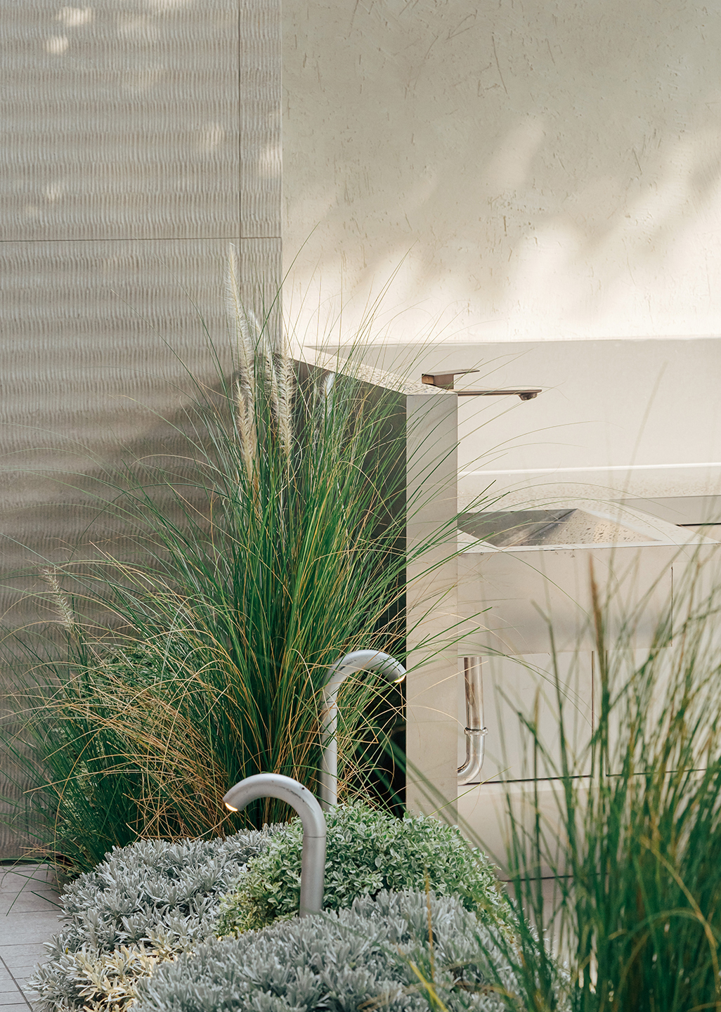 院中造景來自 感官花子 ,從對天母滿山芒草搖曳的記憶出發,取用秋日開花、鬚狀形態的噴泉草聯想意境,搭配芙蓉、銀葉鈕釦樹、銀姬小蠟、橄欖樹等帶灰色調的植栽,清一色細小卻質地各異的葉片交疊出不同灰階與光影轉折,低矮、球狀的姿態則如同植物從地表不斷叢生迸出,灌注綿延的生命力,在節奏與呼吸感間使人嚮往探索。