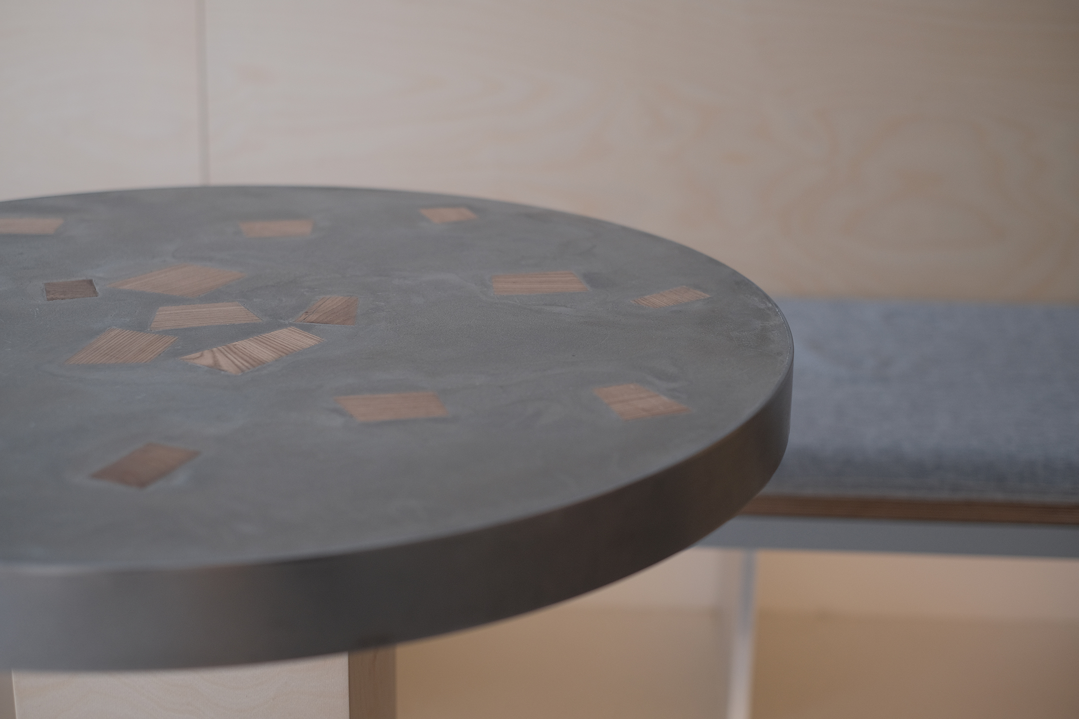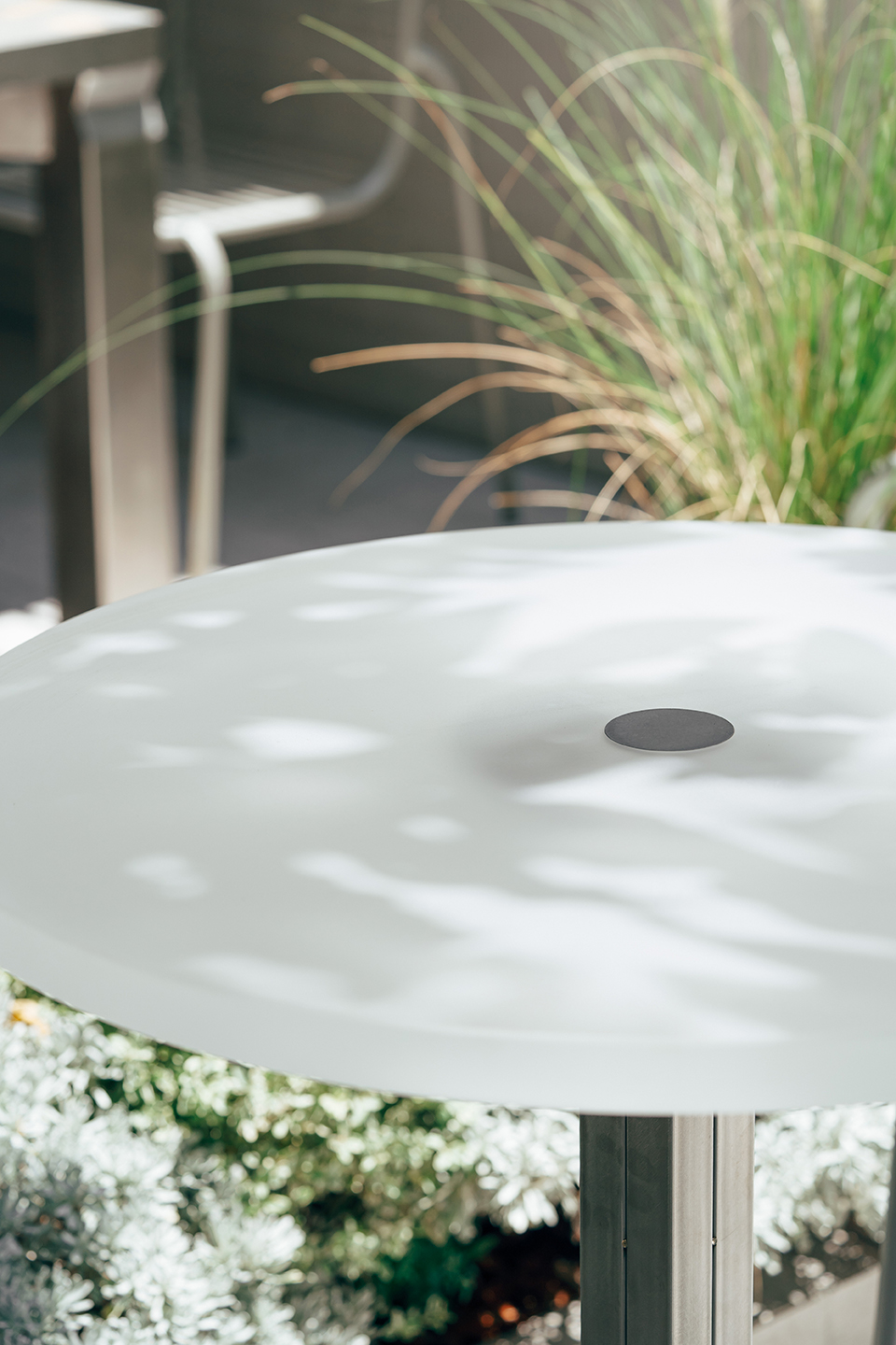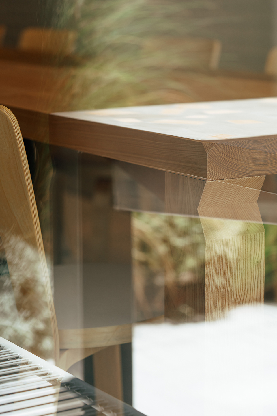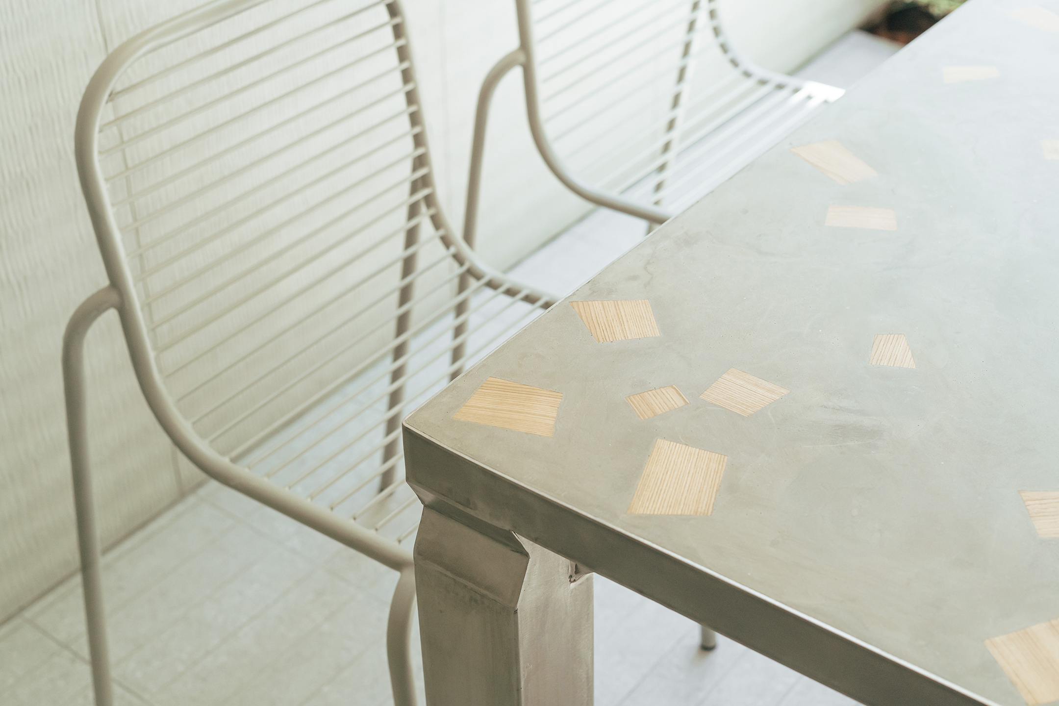 此外,室內外餐桌以天母愜意野餐意象為靈感,可連綿成歡聚宴會感的線形帶狀配置。山紋與直紋兩種紋理實木趣味拼接的餐桌,和戶外金屬水泥桌造型一致、嵌入相同木材的水泥桌裡外呼應,共構溫暖大方氣息。