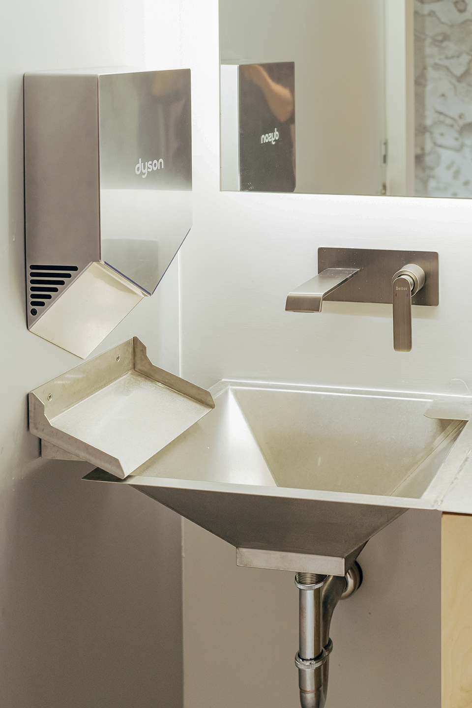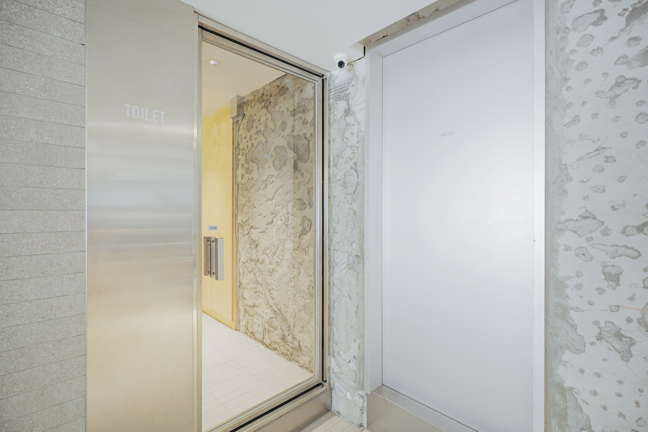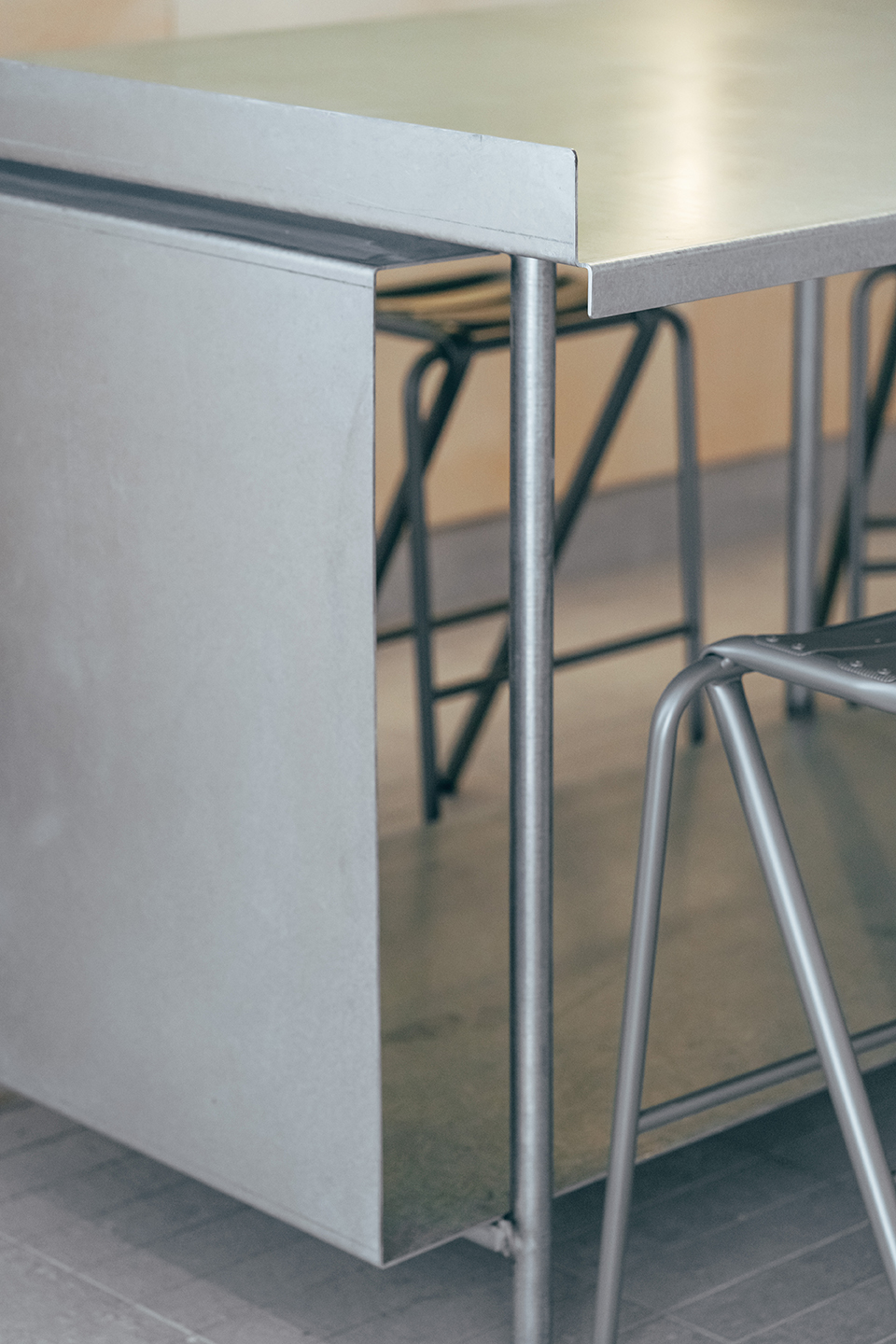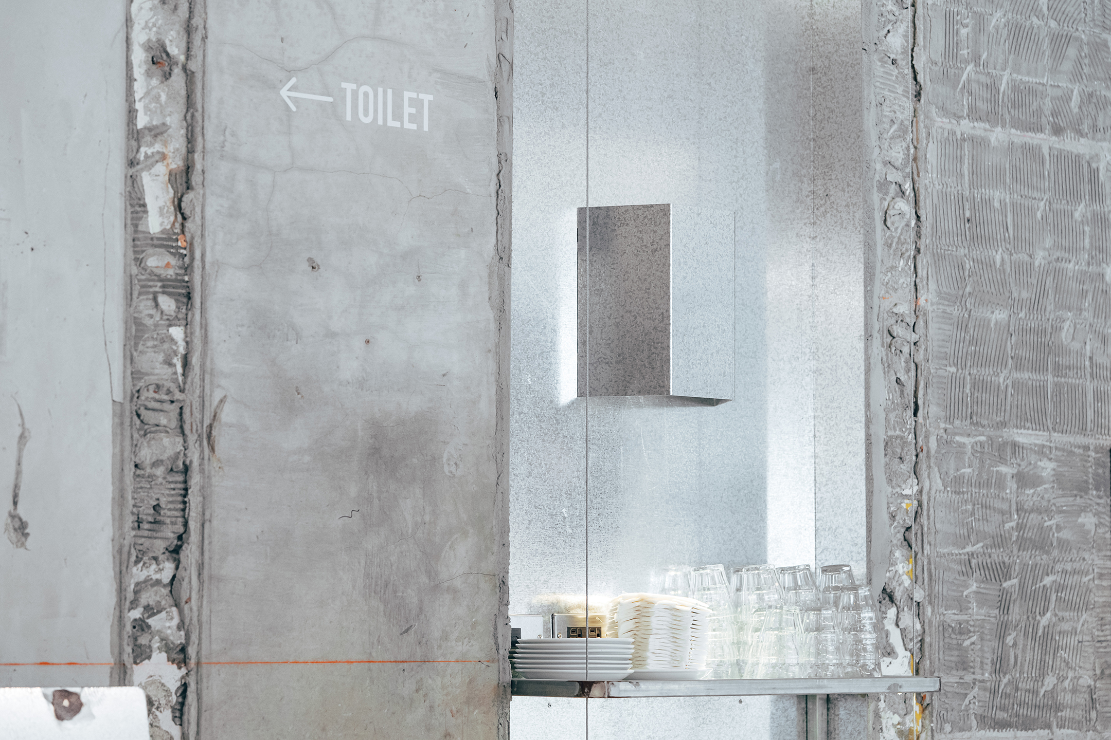 卡座沙發區牆面保留舊牆印記,嵌入金屬材質所設計的書報架、工作檯及展示櫃,結合開放式廚房的工作場景,一齊成為內部區域的迷人風貌。