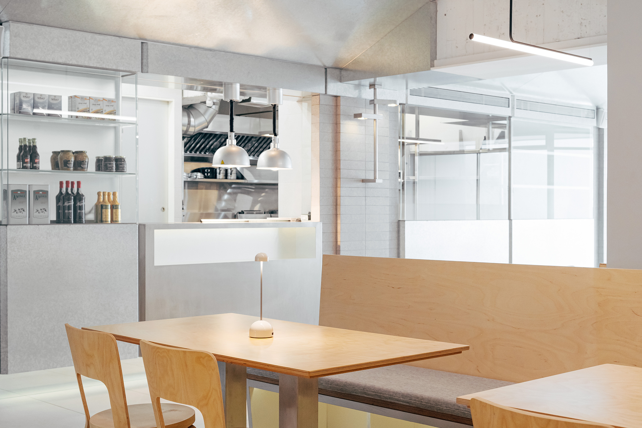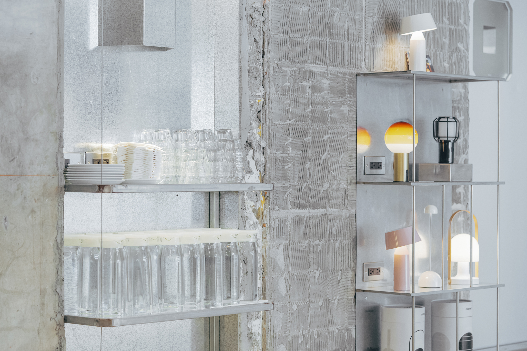 這裡讓帶著工作需求而來的人們更容易拆併桌,燈具也選擇呼應 BRUN 不然美饌的Ambrosia 系列,其名稱在希臘神話中代表「眾神的佳餚」,唯美且幹練和科技感兼備。此外,此區桌面也有配置結構簡單可愛Sips桌燈相伴,若有興趣還可以移步到 Marset 展架,賞玩各種桌燈的造型與光感。