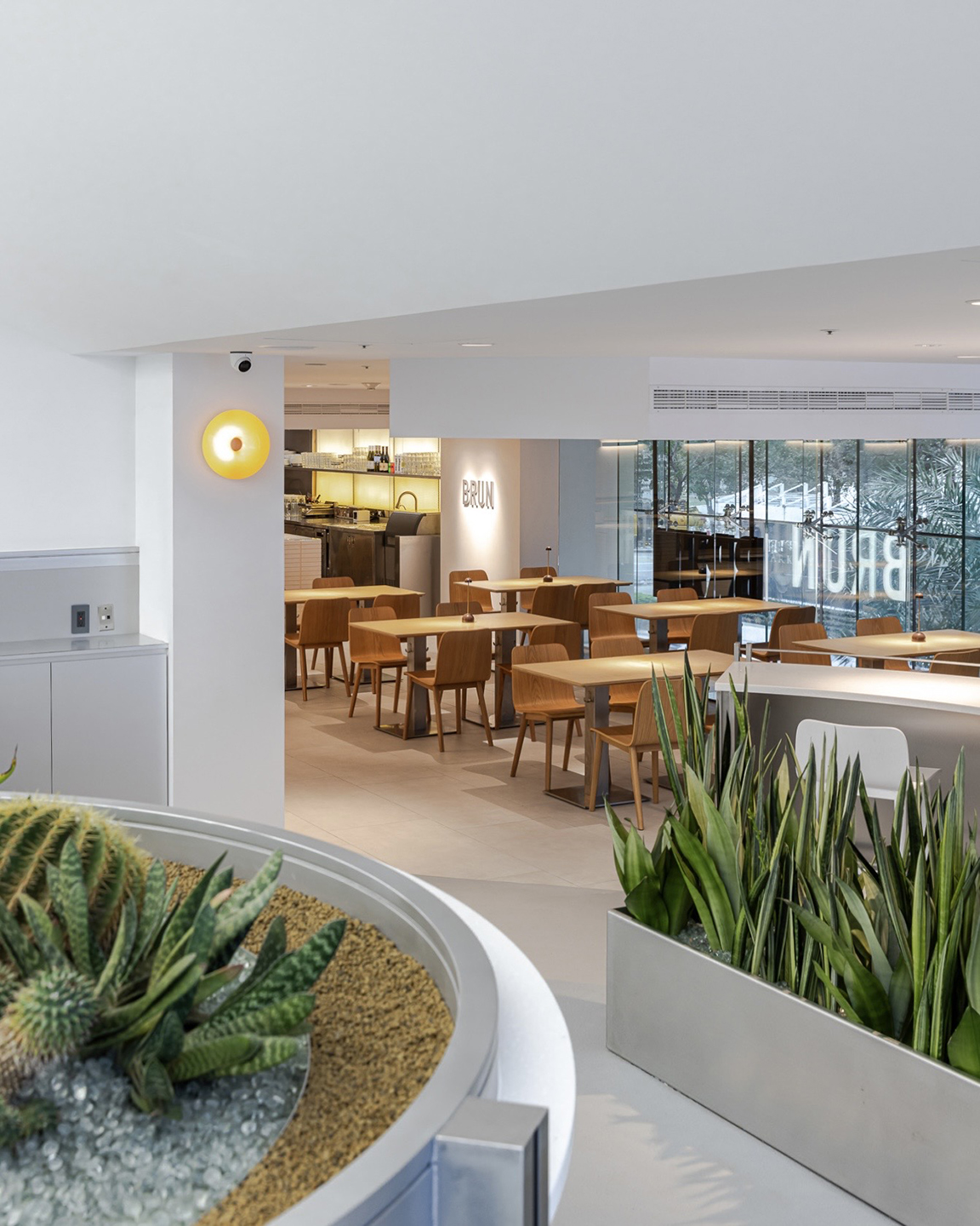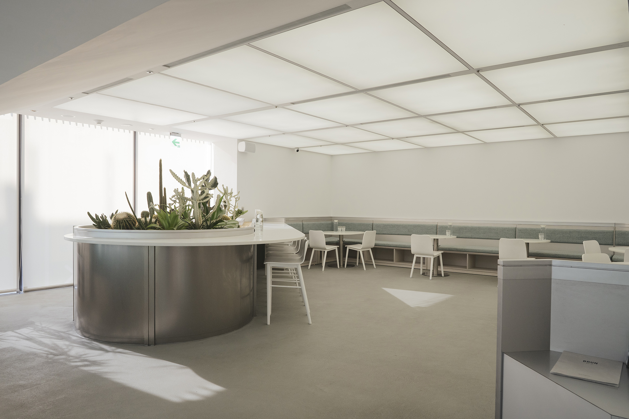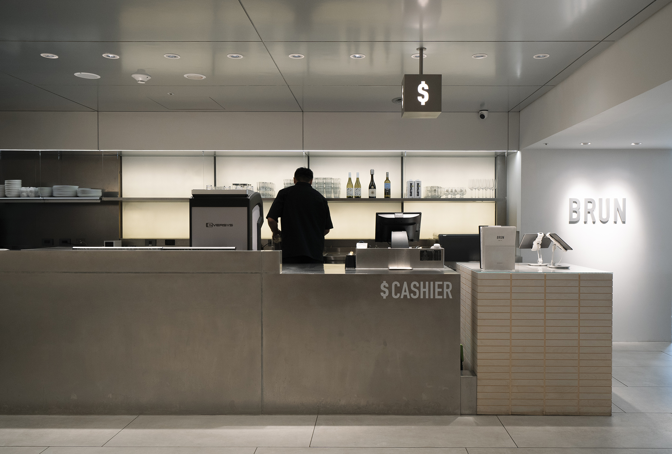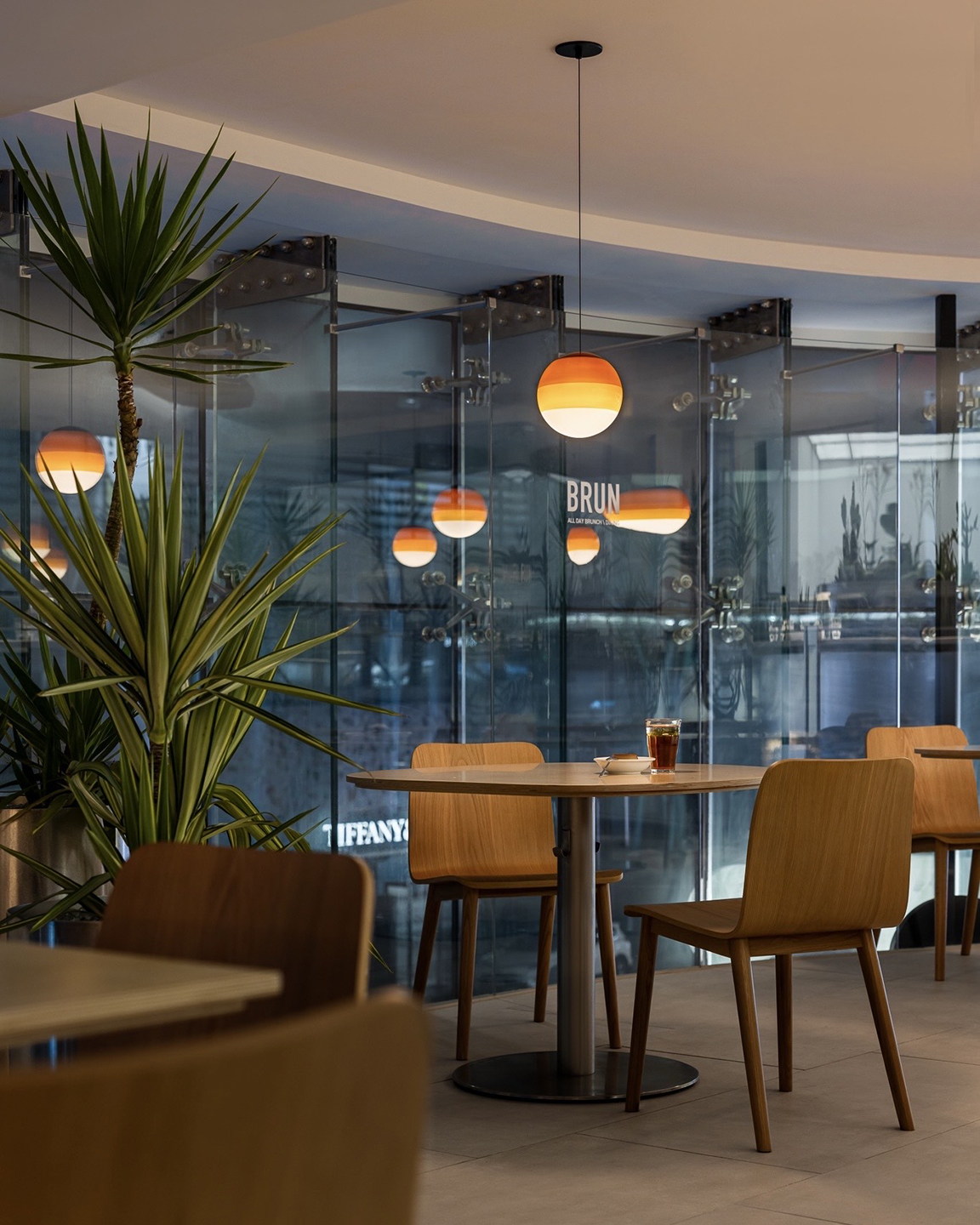 在內場定位完成後, BRUN 不然 外場的設計主要分為三大區域,連接通往服飾品牌「mouggan」的「深邃長廊」,使用訂製的樺木磚搭配橫紋白洲土,呼應服飾層層堆疊的意象。外場吧檯的背景是一個透過長虹玻璃摹擬日出色彩的漸變燈箱,與空間中獨特的大面積弧形帷幕窗相連而成的「自然光景區」,窗戶邊緣懸掛著三顆來自西班牙燈具品牌「MARSET」的Dipping Light吊燈,手工浸染上橘紅染料,恰巧對應上漸變的天色主軸,讓人無論坐在店內或於店外視線朝著二樓窗景望去,都被其吸引住目光。餐廳最深處的「BRUCH BAR」位於一樓挑高與夾層形成的架高平台上。以隨著弧形外窗內退的弧形花台作為中心,花台內環繞的綠意來自「感官花子」精心設置的多肉植栽,透過「春池」清澈透明的琉璃介質,使室內植物群更顯立體。外環向外擴展、延伸的同時提供了小包廂空間,並搭配上適合工作兼用餐的吧檯座位以及卡座,滿足各種用餐情境上的需求。
