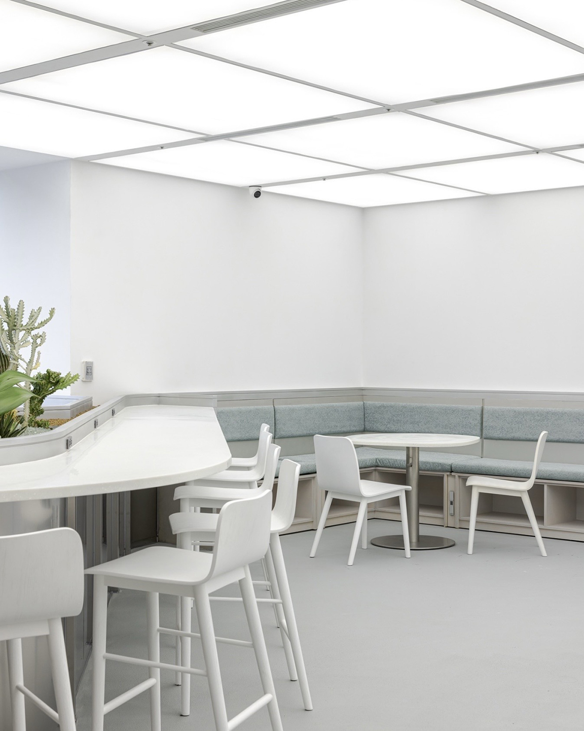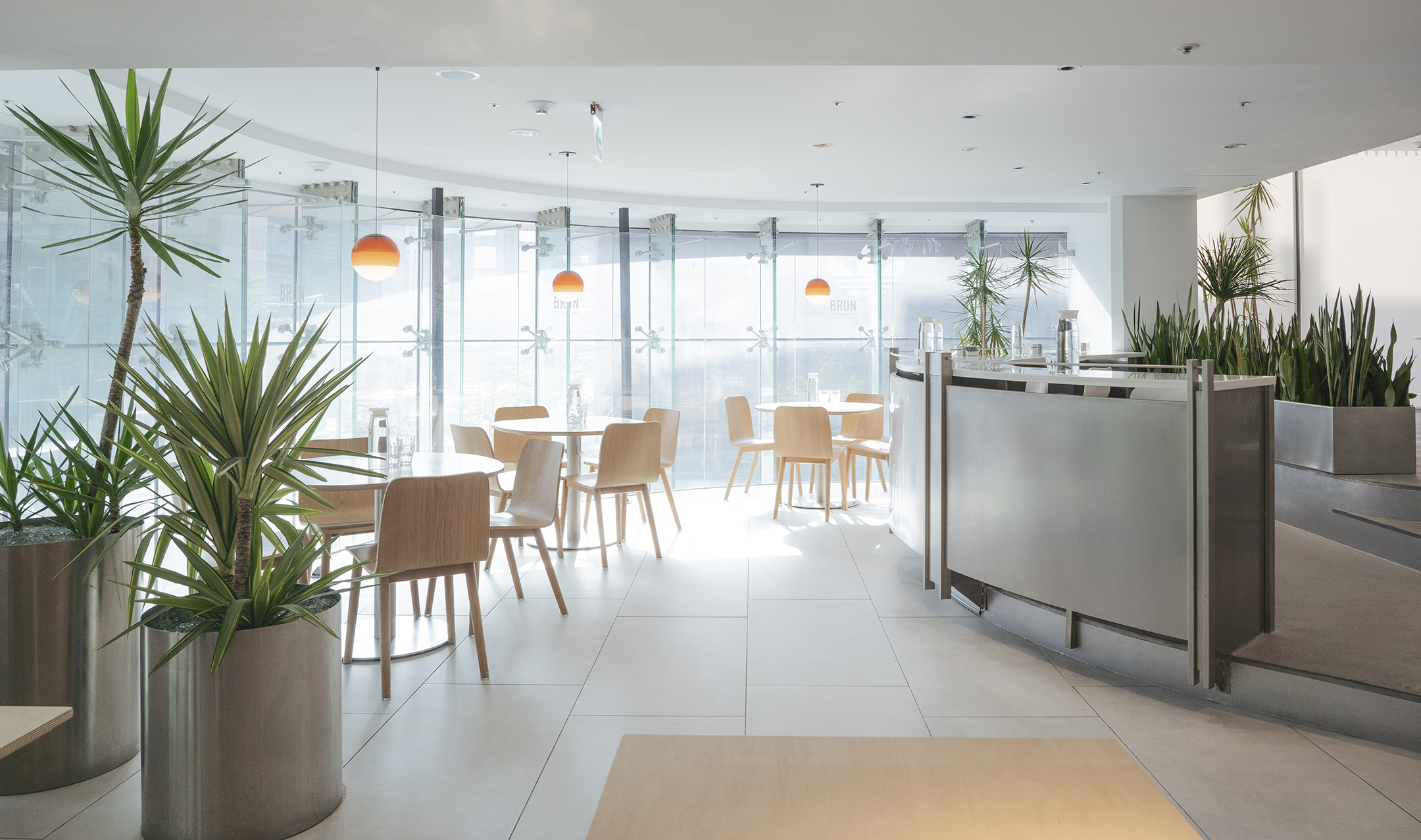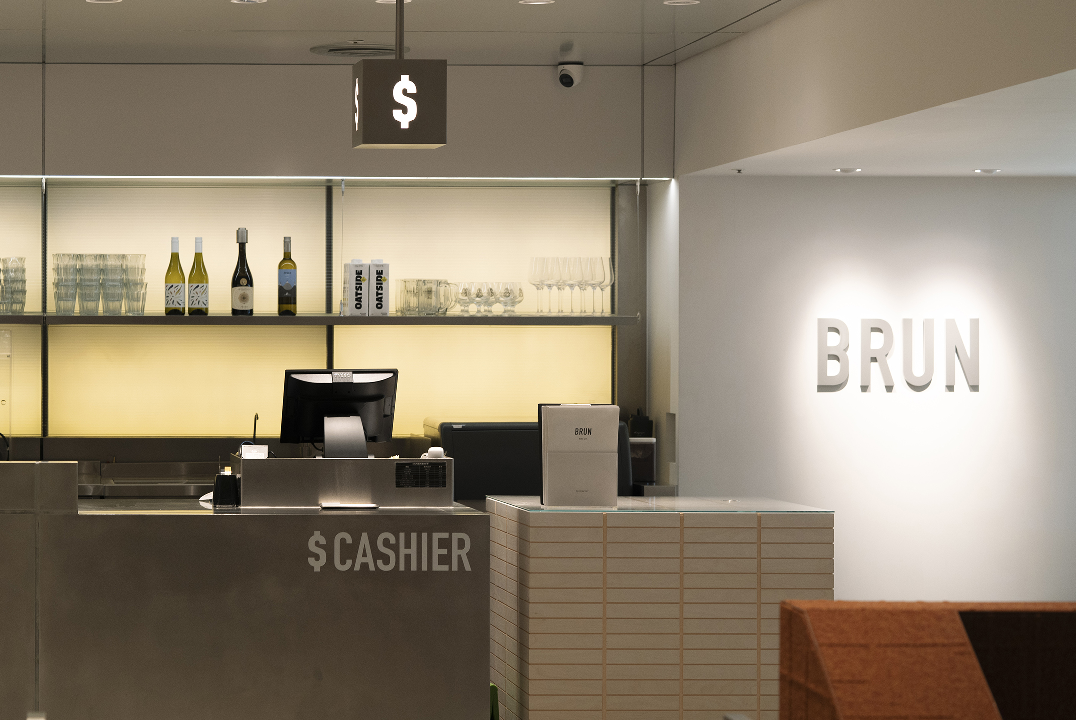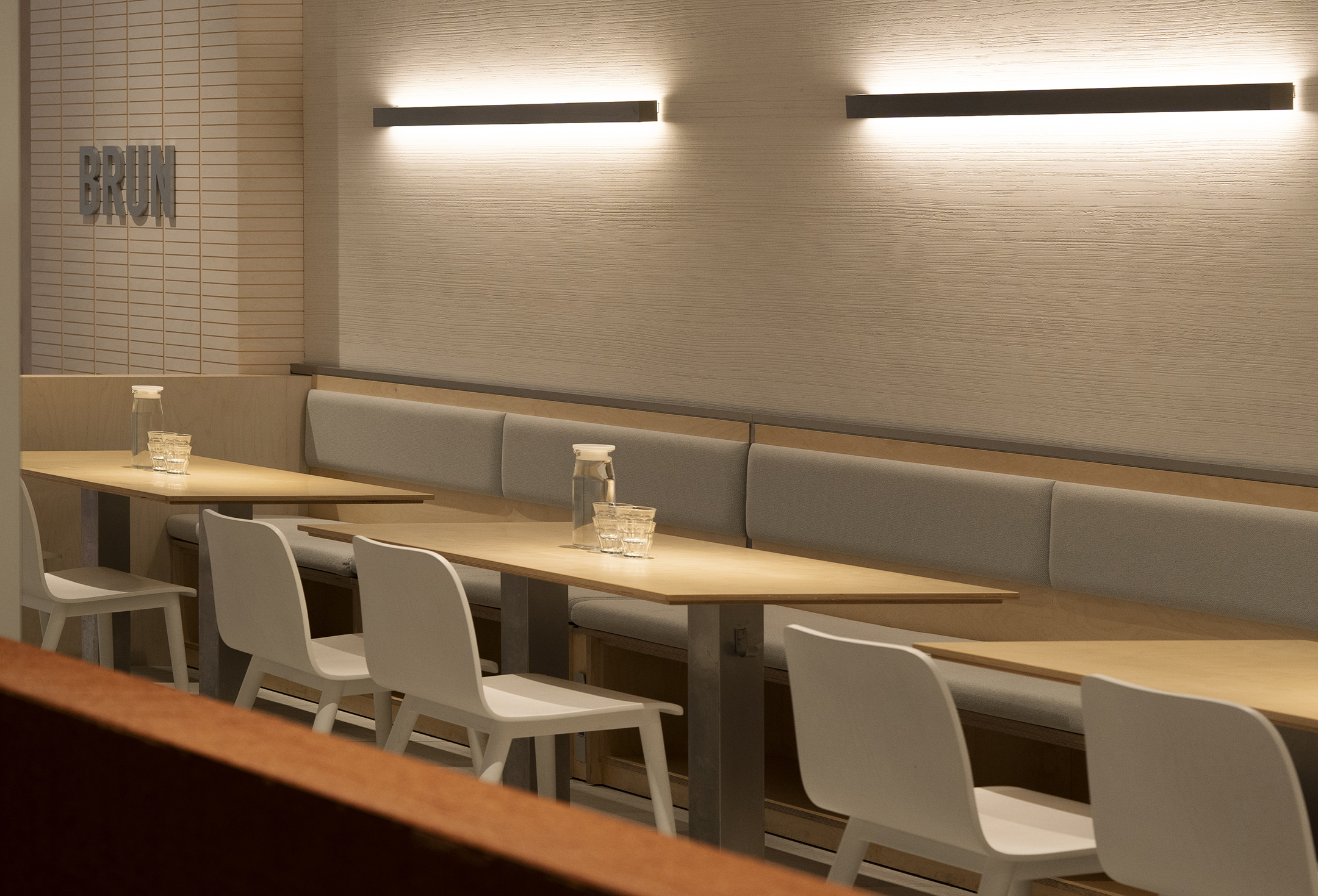 在內場定位完成後, BRUN 不然 外場的設計主要分為三大區域,連接通往服飾品牌「mouggan」的「深邃長廊」,使用訂製的樺木磚搭配橫紋白洲土,呼應服飾層層堆疊的意象。外場吧檯的背景是一個透過長虹玻璃摹擬日出色彩的漸變燈箱,與空間中獨特的大面積弧形帷幕窗相連而成的「自然光景區」,窗戶邊緣懸掛著三顆來自西班牙燈具品牌「MARSET」的Dipping Light吊燈,手工浸染上橘紅染料,恰巧對應上漸變的天色主軸,讓人無論坐在店內或於店外視線朝著二樓窗景望去,都被其吸引住目光。餐廳最深處的「BRUCH BAR」位於一樓挑高與夾層形成的架高平台上。以隨著弧形外窗內退的弧形花台作為中心,花台內環繞的綠意來自「感官花子」精心設置的多肉植栽,透過「春池」清澈透明的琉璃介質,使室內植物群更顯立體。外環向外擴展、延伸的同時提供了小包廂空間,並搭配上適合工作兼用餐的吧檯座位以及卡座,滿足各種用餐情境上的需求。