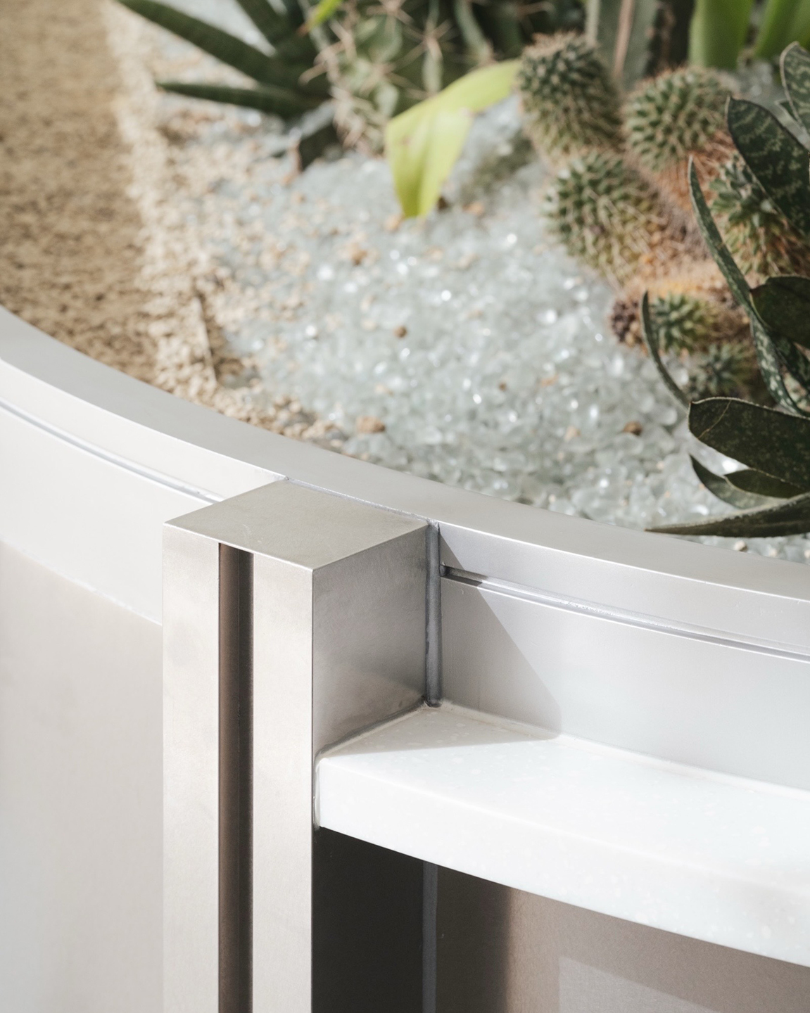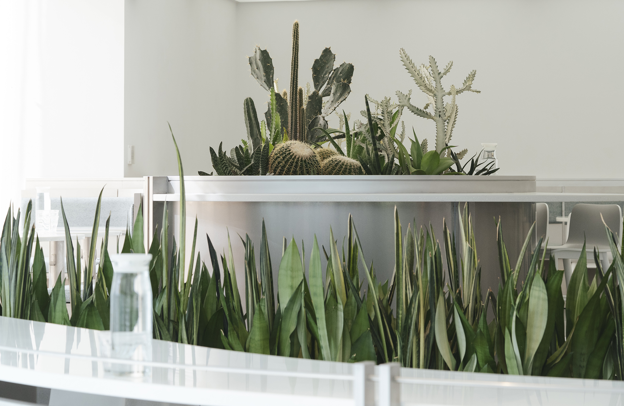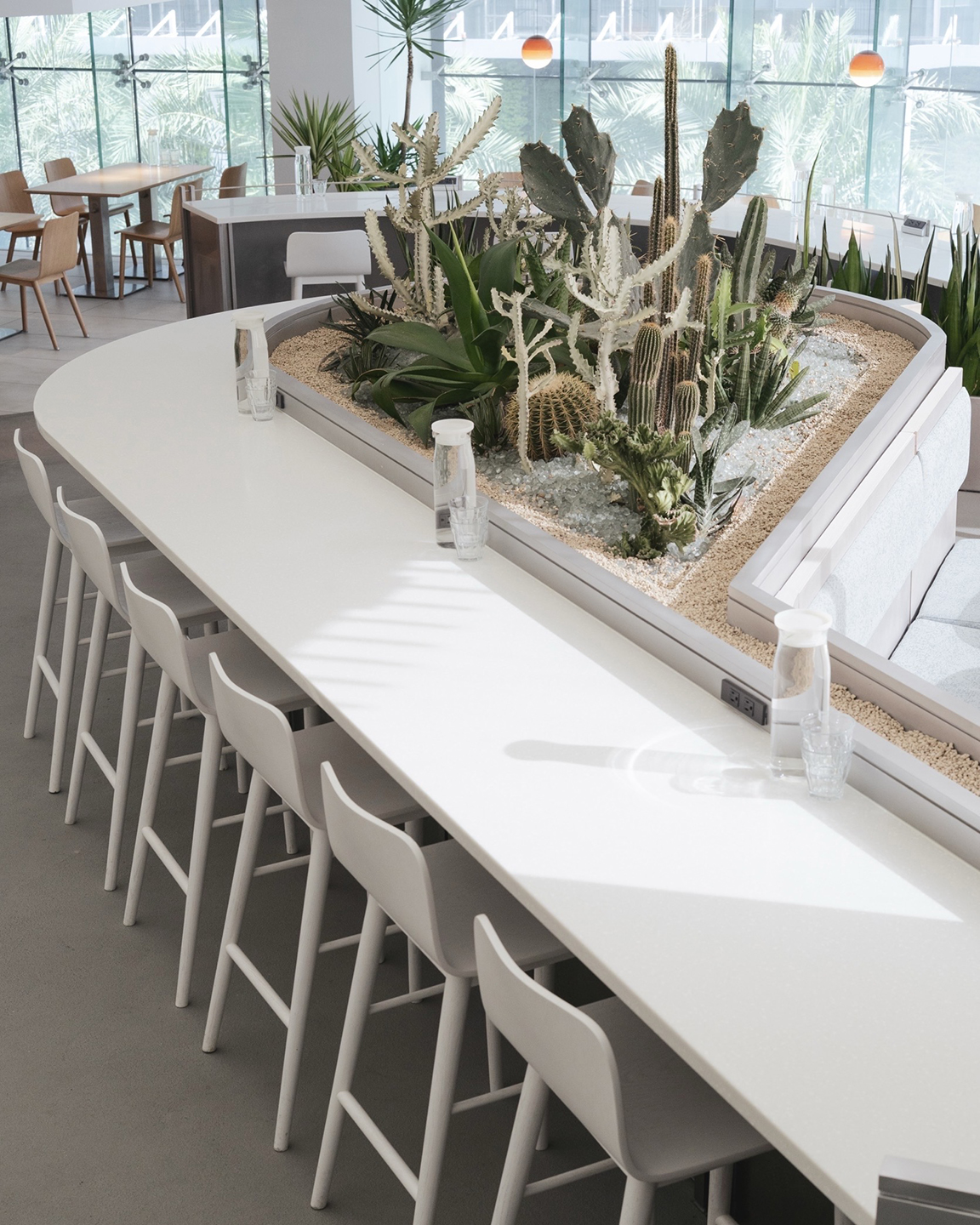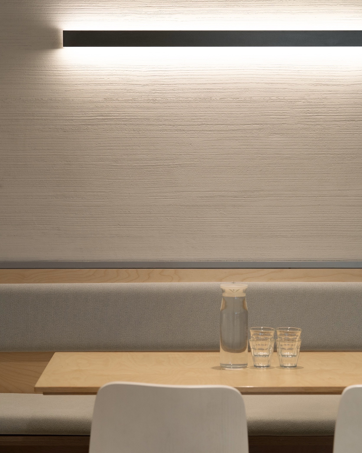 在內場定位完成後, BRUN 不然 外場的設計主要分為三大區域,連接通往服飾品牌「mouggan」的「深邃長廊」,使用訂製的樺木磚搭配橫紋白洲土,呼應服飾層層堆疊的意象。外場吧檯的背景是一個透過長虹玻璃摹擬日出色彩的漸變燈箱,與空間中獨特的大面積弧形帷幕窗相連而成的「自然光景區」,窗戶邊緣懸掛著三顆來自西班牙燈具品牌「MARSET」的Dipping Light吊燈,手工浸染上橘紅染料,恰巧對應上漸變的天色主軸,讓人無論坐在店內或於店外視線朝著二樓窗景望去,都被其吸引住目光。餐廳最深處的「BRUCH BAR」位於一樓挑高與夾層形成的架高平台上。以隨著弧形外窗內退的弧形花台作為中心,花台內環繞的綠意來自「感官花子」精心設置的多肉植栽,透過「春池」清澈透明的琉璃介質,使室內植物群更顯立體。外環向外擴展、延伸的同時提供了小包廂空間,並搭配上適合工作兼用餐的吧檯座位以及卡座,滿足各種用餐情境上的需求。