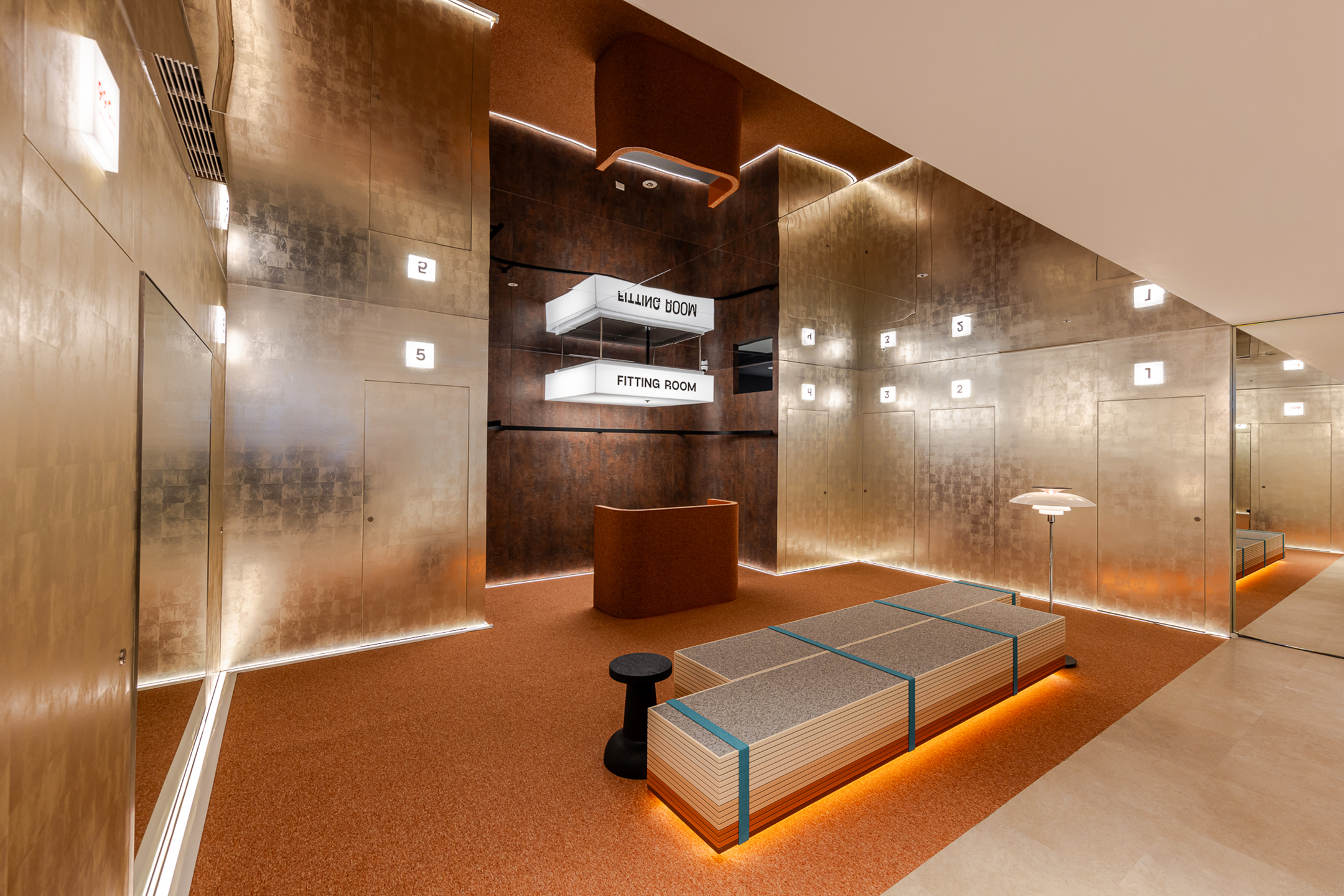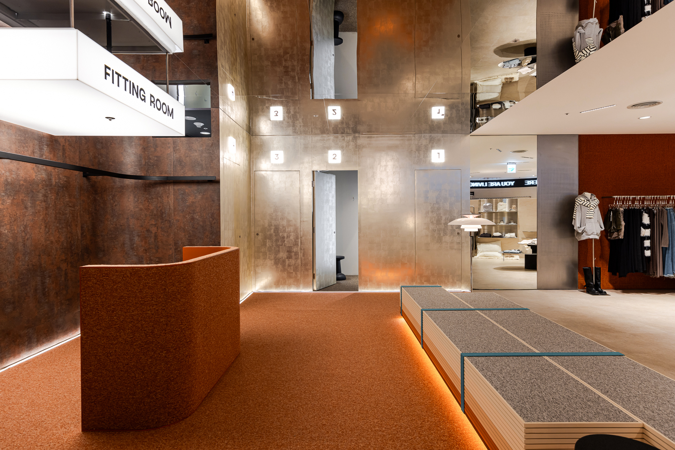 實體門市對於大眾的共同經驗除了感受服飾的真實質地外,也常常成為相約見面的理由,建立人與人一同購物的美好連結和記憶。ATT店嘗試「試衣」角度出發,強化試衣體驗與拍照上的畫面感。開放及對稱語彙將試衣間轉為空間端景,鏡面與地毯界定空間範圍,造型座椅提供等待、休憩,享受與好友們、伴侶間的交流穿搭與自拍留念的過程。