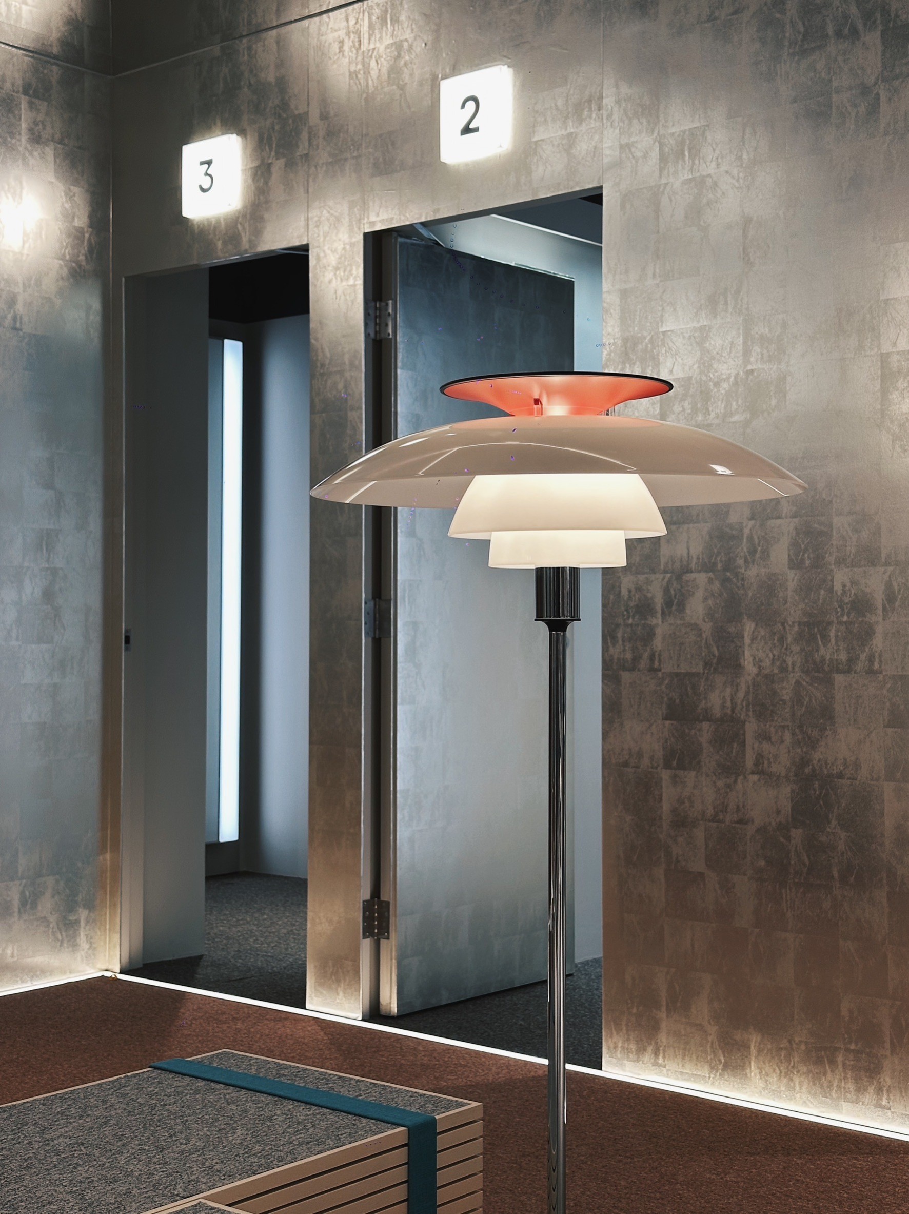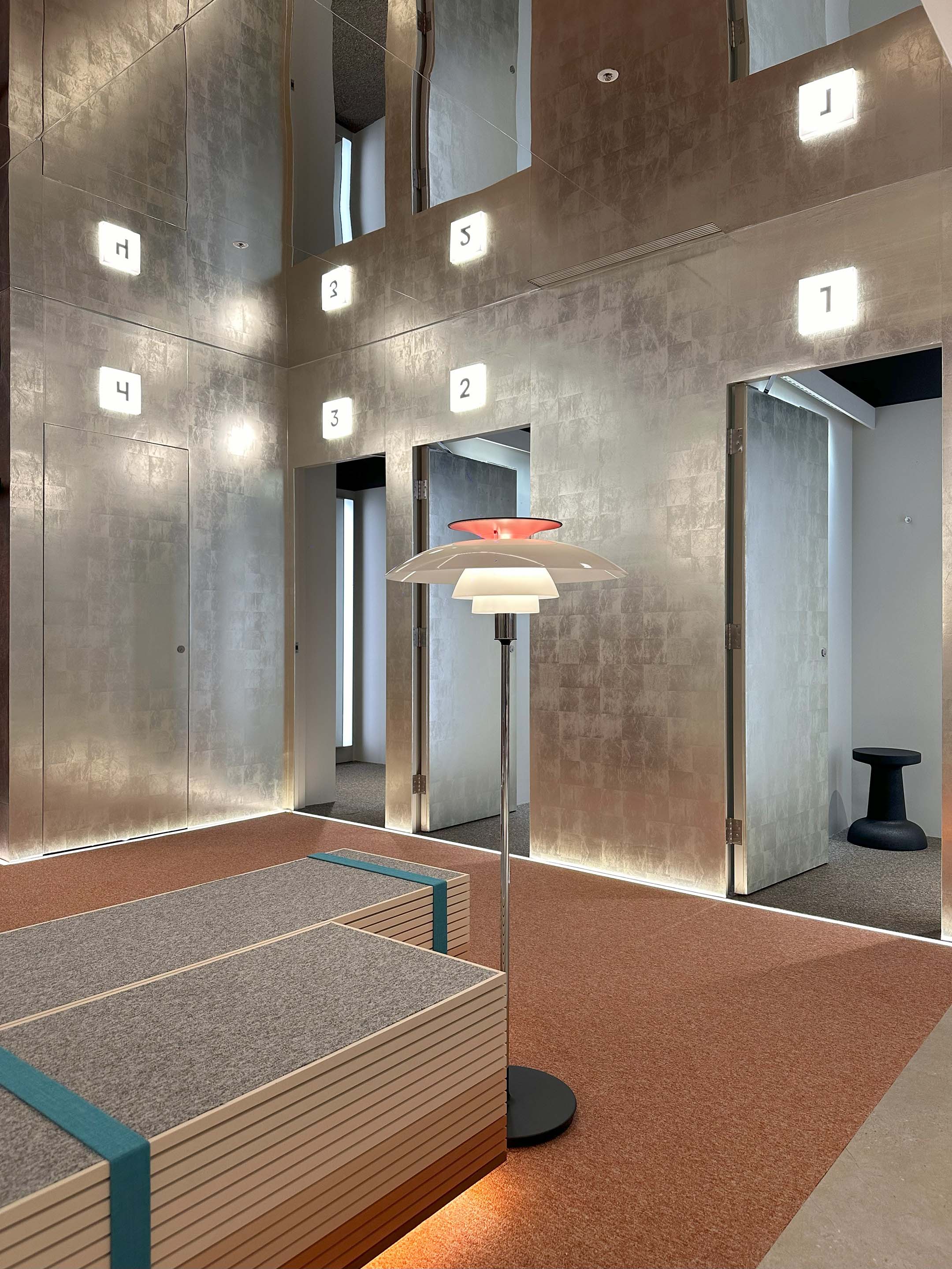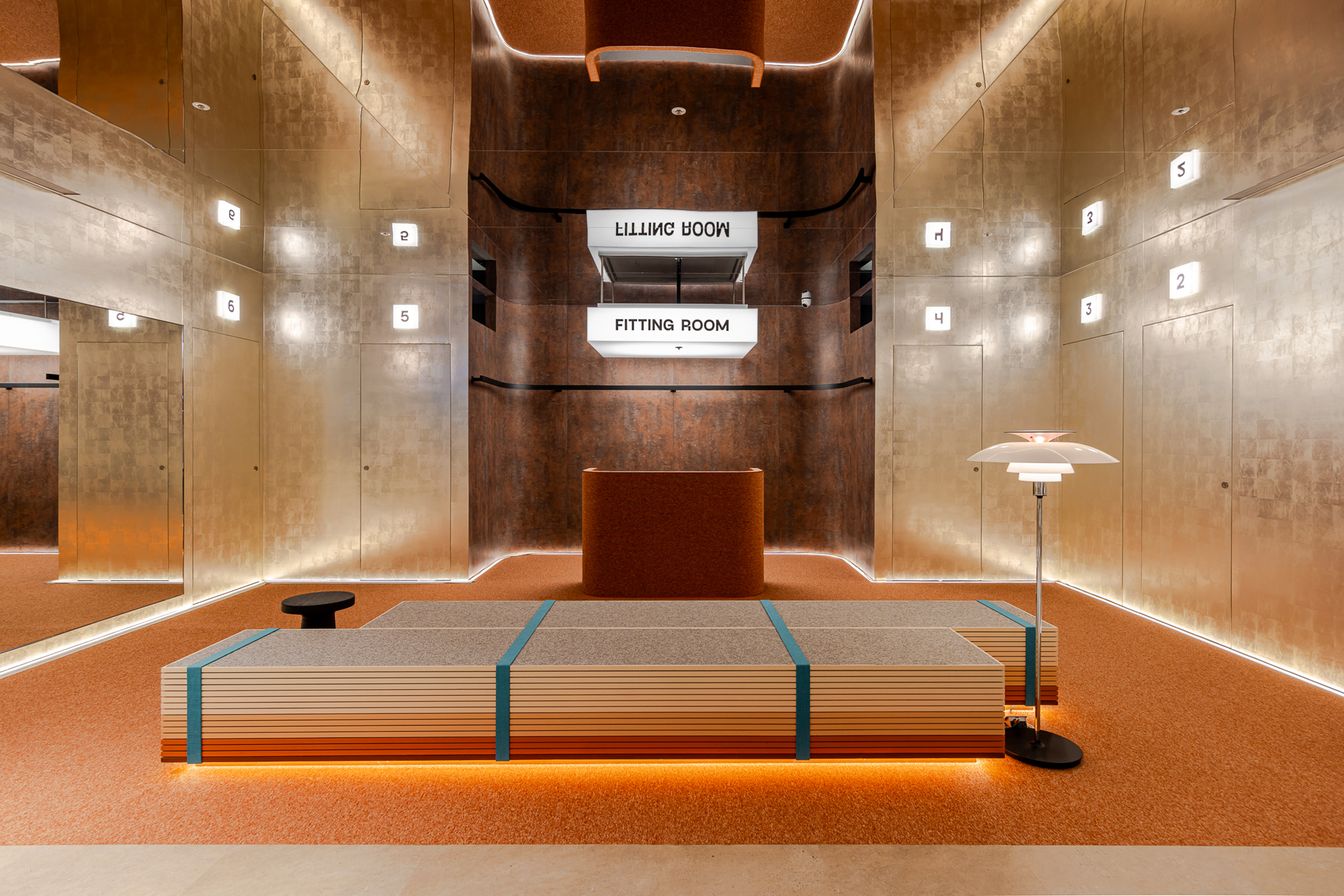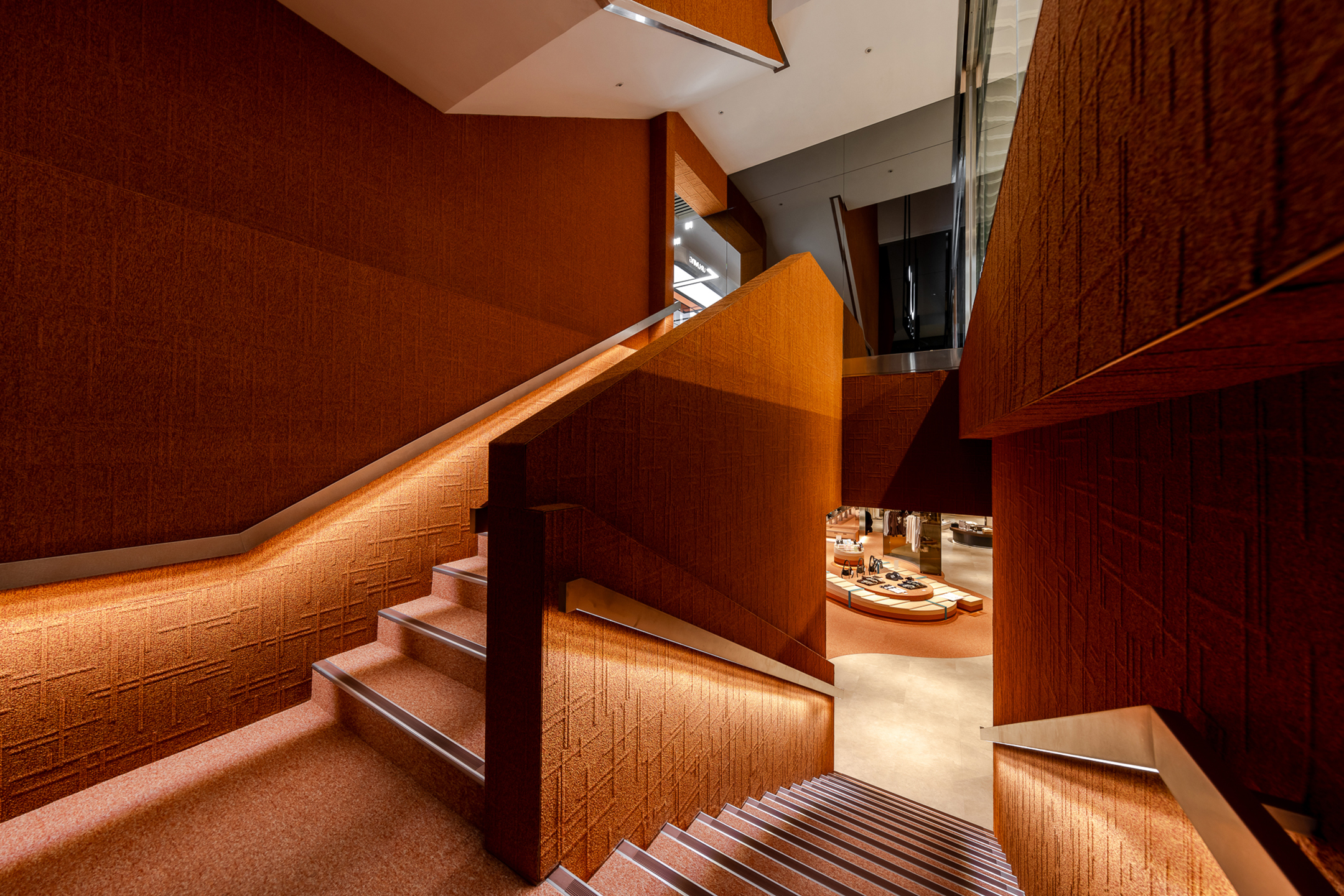 作為串聯URLIVING ATT店概念裡不同時序的通道,樓梯選用特殊的表面材質來回應前所未有的穿越體驗,兩種不同的橘色地毯材質包覆梯內地壁,兩端設置的鏡面反射營造出神秘虛幻的空間視覺,在三層場域間成為特別的定位與存在。