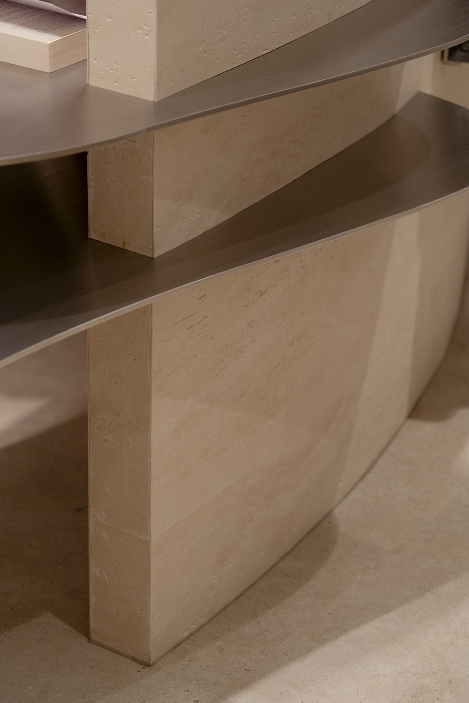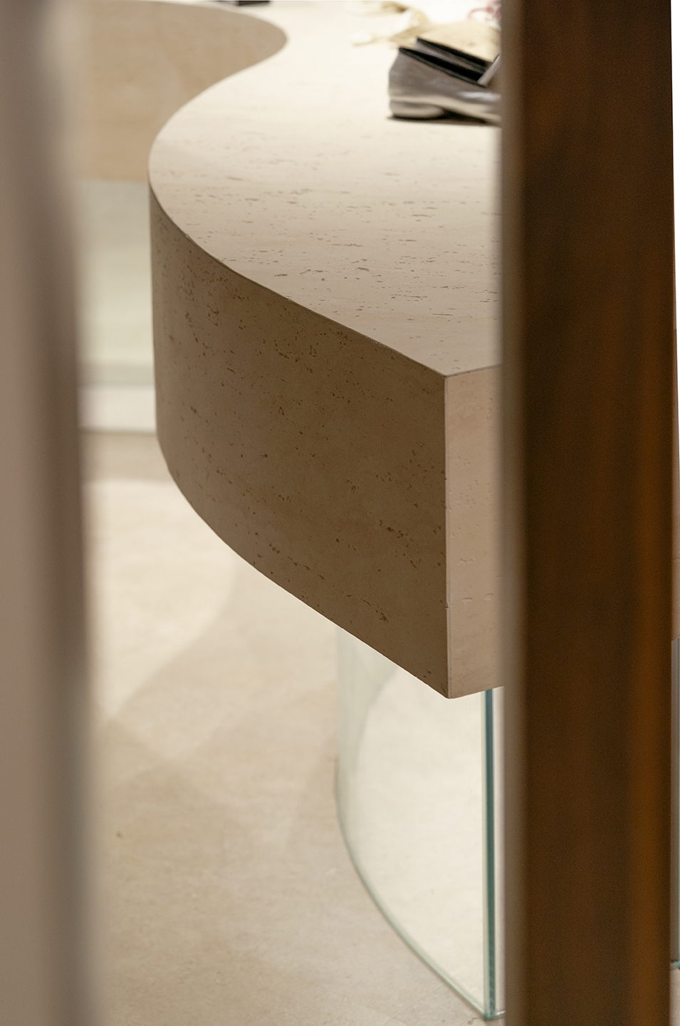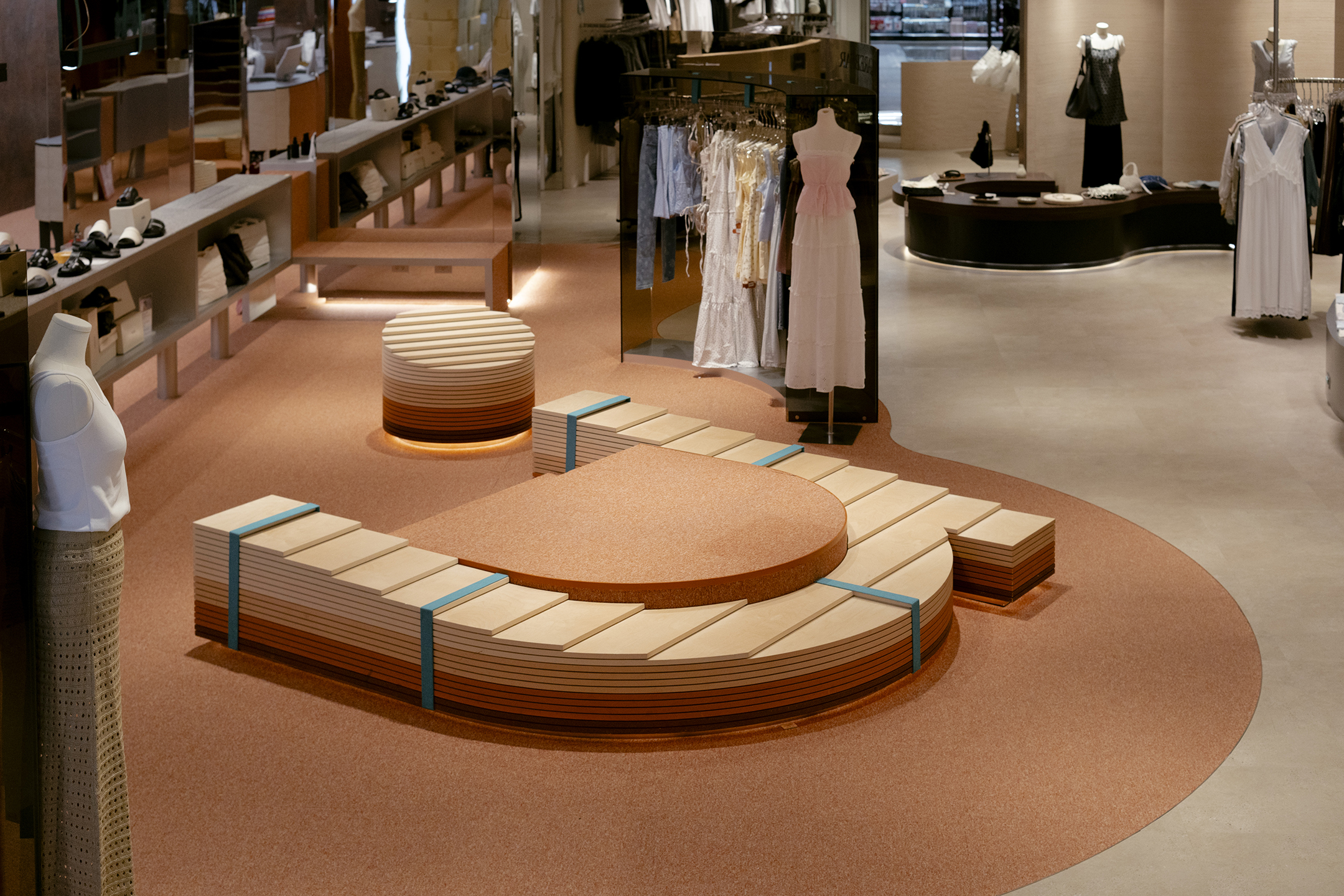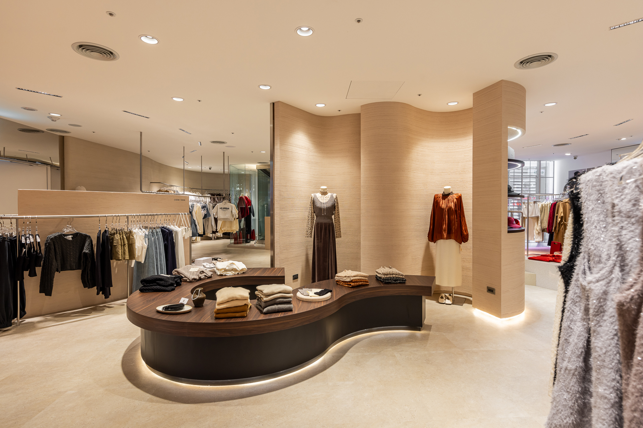 模擬日落餘暉下,放鬆、曖昧的氛圍,B1由四個品牌空間、收銀及試衣空間所組成。3000K的暖光燈具與踢腳間照光相互輕柔渲染,讓空間色溫形成三層樓中最溫暖的一個場域。服飾陳列則運用了有機曲型、高矮錯落的島台和掛架道具散佈於空間,不同尺度的動線皆為了提供顧客在品牌間自由穿梭。而面材上則使用同色系不同質地的石、木、玻璃、塗料等材質交錯組構,以低調界定品牌邊界。