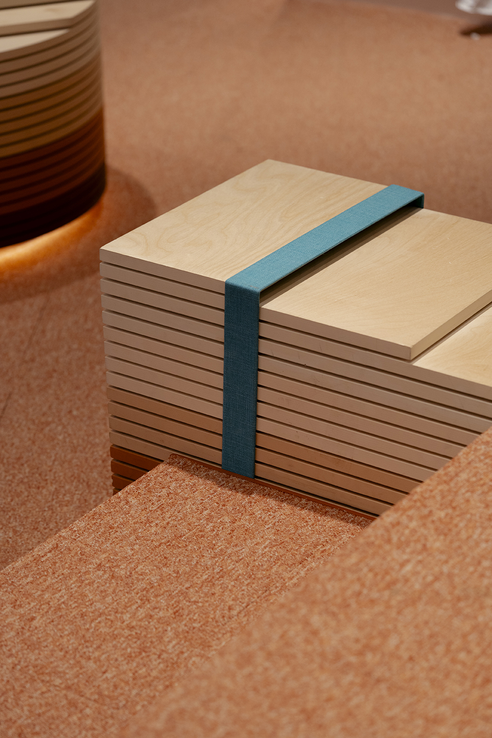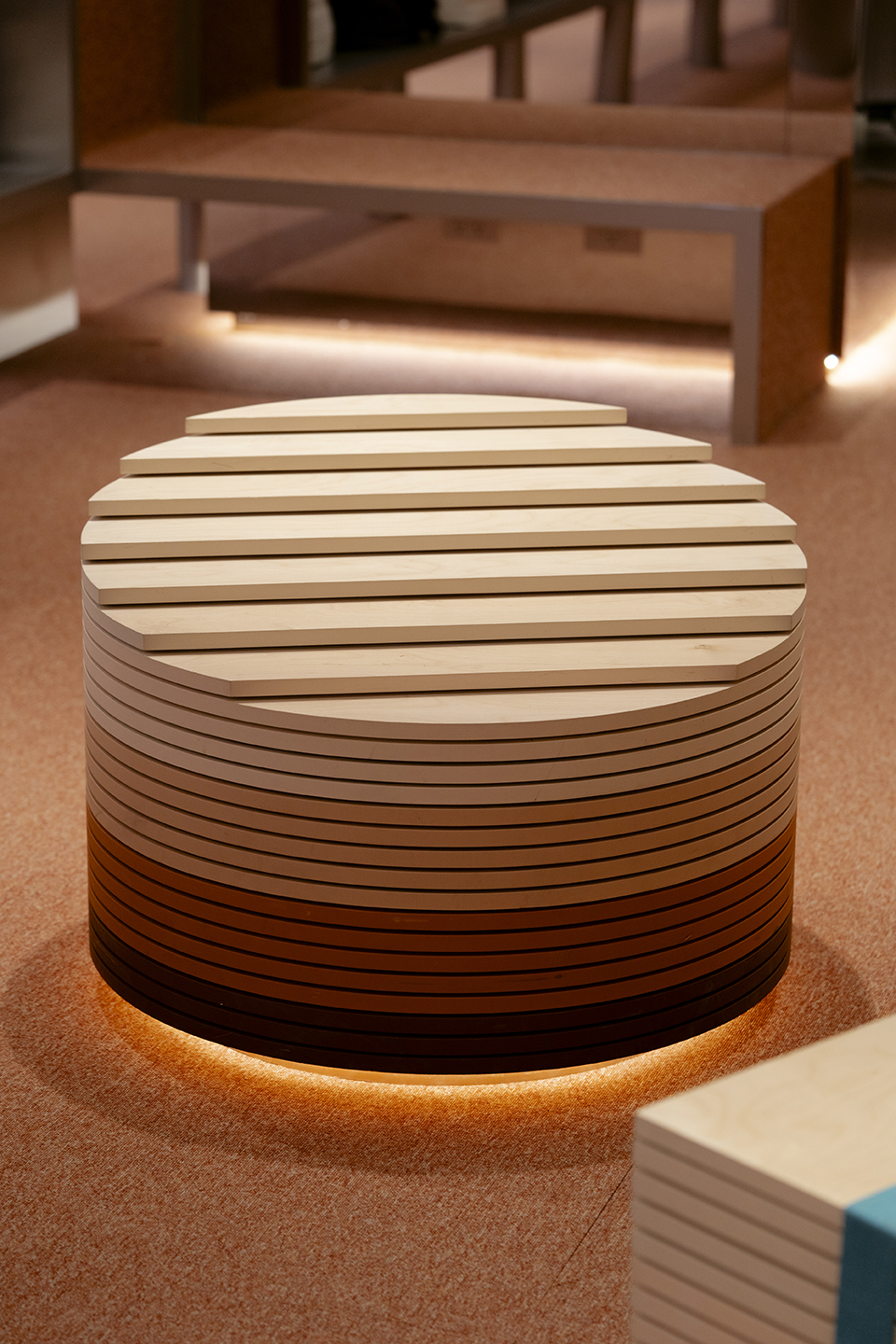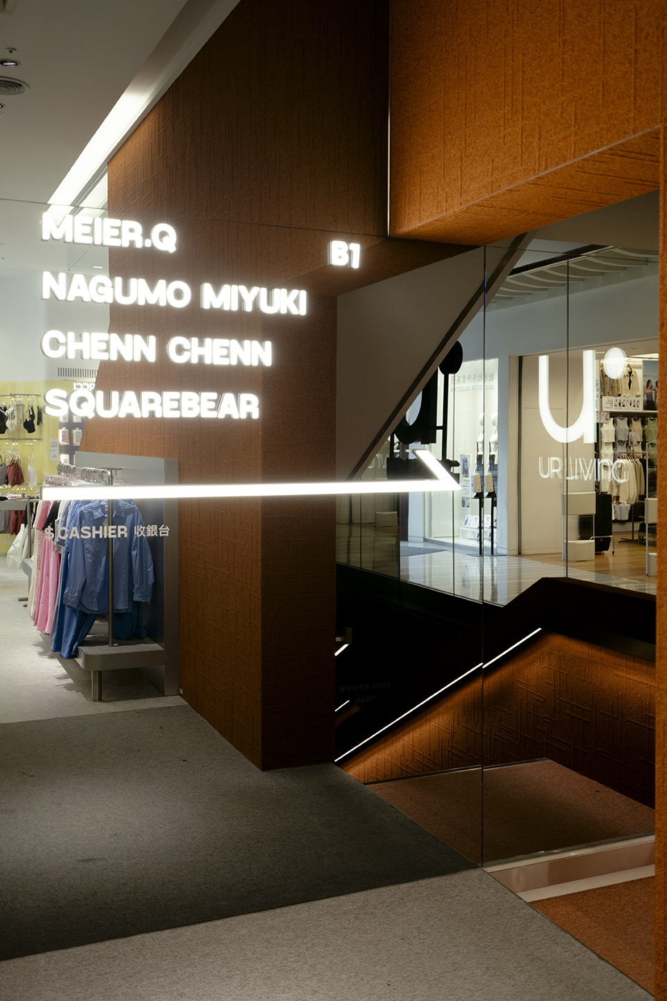 空間中心由橘色地毯串聯收銀櫃檯及選品商店,透過堆疊手法翻玩美而快集團代表性的Logo符號「u˙」,造型高低漸變不只提供多元的陳列形式,由淺至深的橘色漸層邊緣也與時序的垂直向度相互呼應,強化了進入B1的畫面效果並加深了品牌印象。