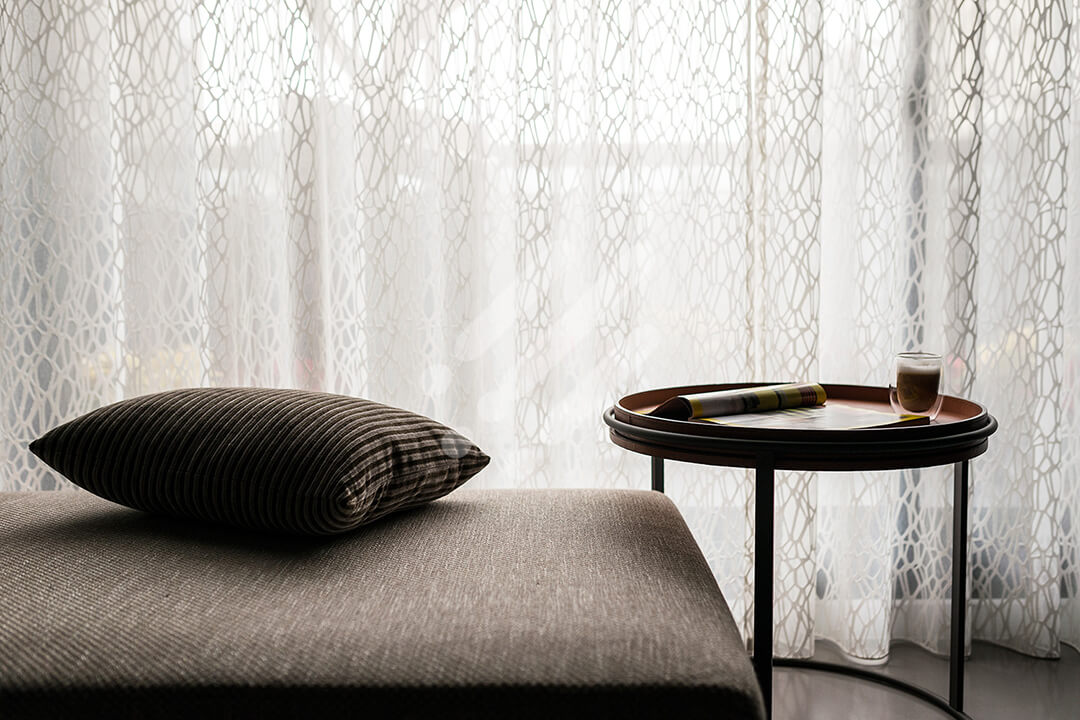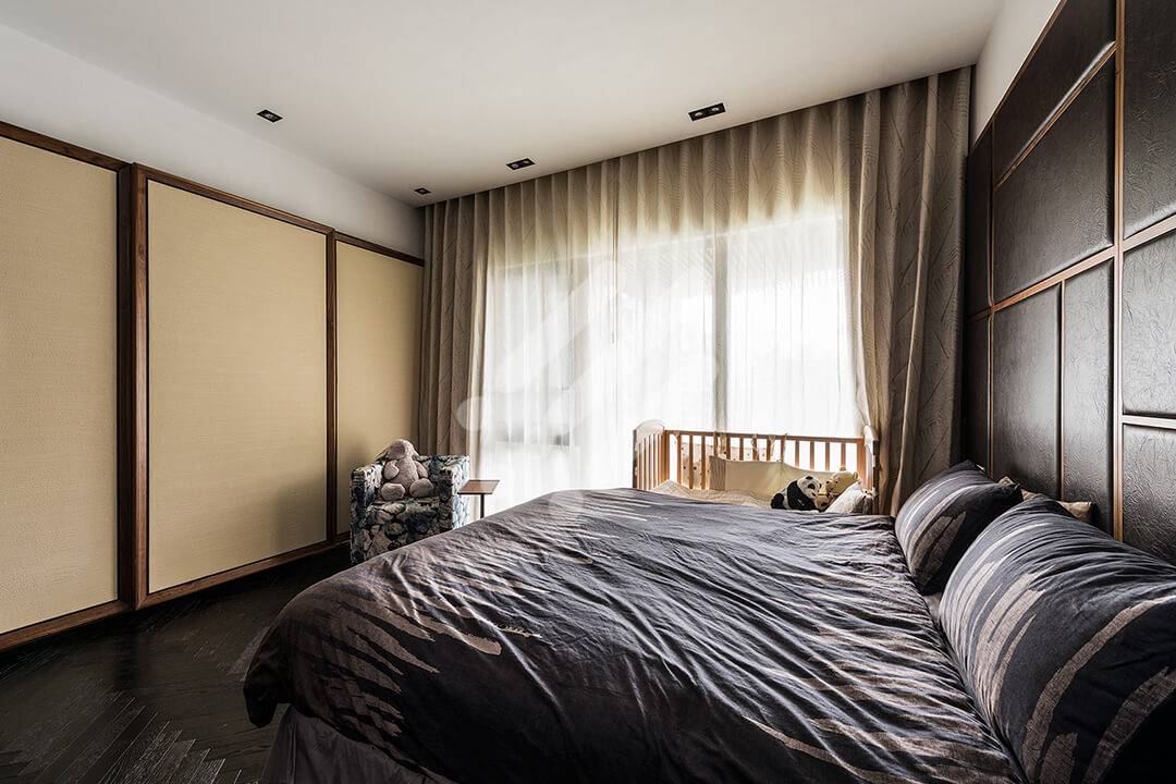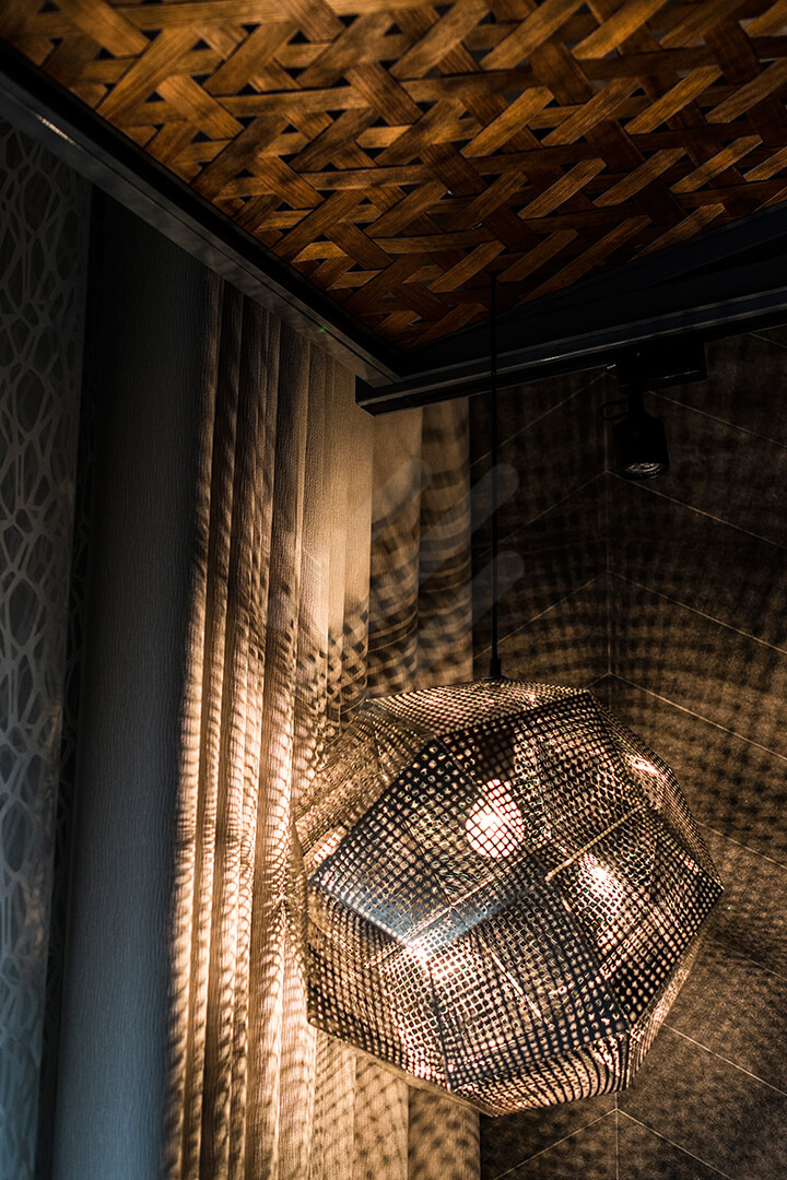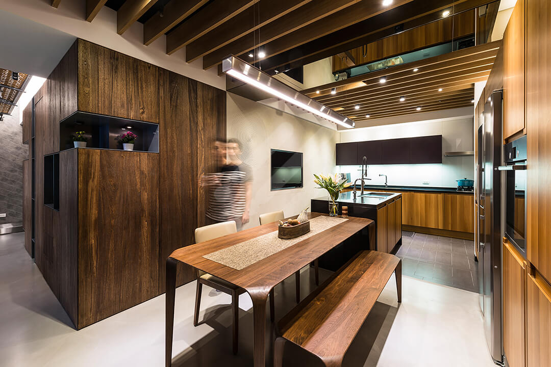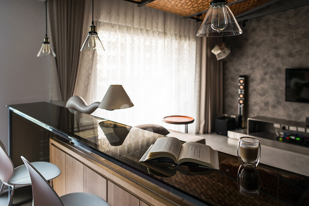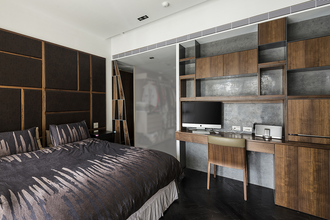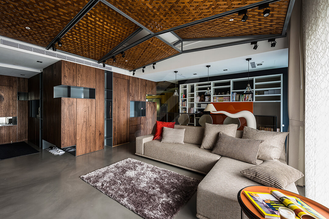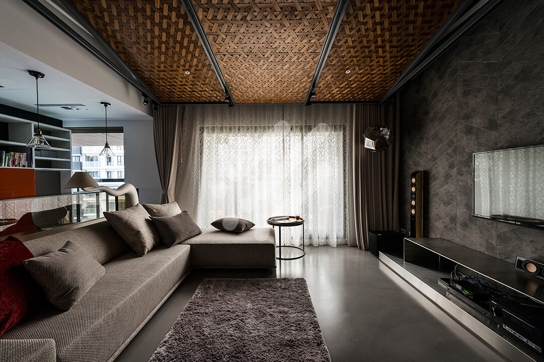 洪宅業主為個性鮮明的年輕夫妻,希望打造一個有別於一般住宅風格的親子互動宅,空間規劃上打破各自獨立的居住空間,透過開放式的廚房與書房吧臺串聯,讓流通與開放產生互動連結的可能,同時能隨時掌握小孩的活動動態。 天花板以輕巧的竹編工藝技法及木質隔柵,界定空間的重心亦將生活中的自然材料韻律烘托出來;木質的牆面由玄關入口延伸至廚房,暗示著連續的生活路徑與空間語彙。
