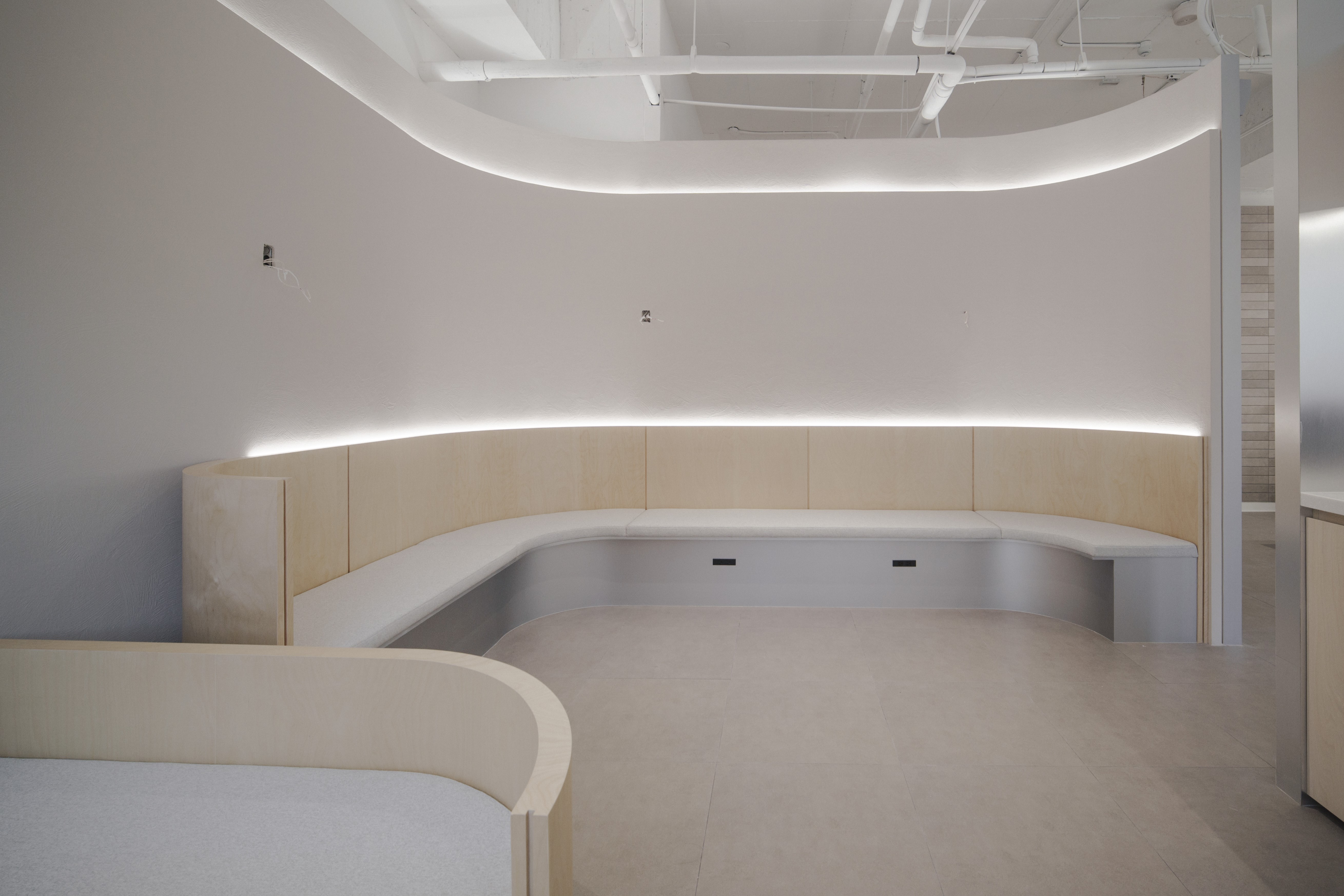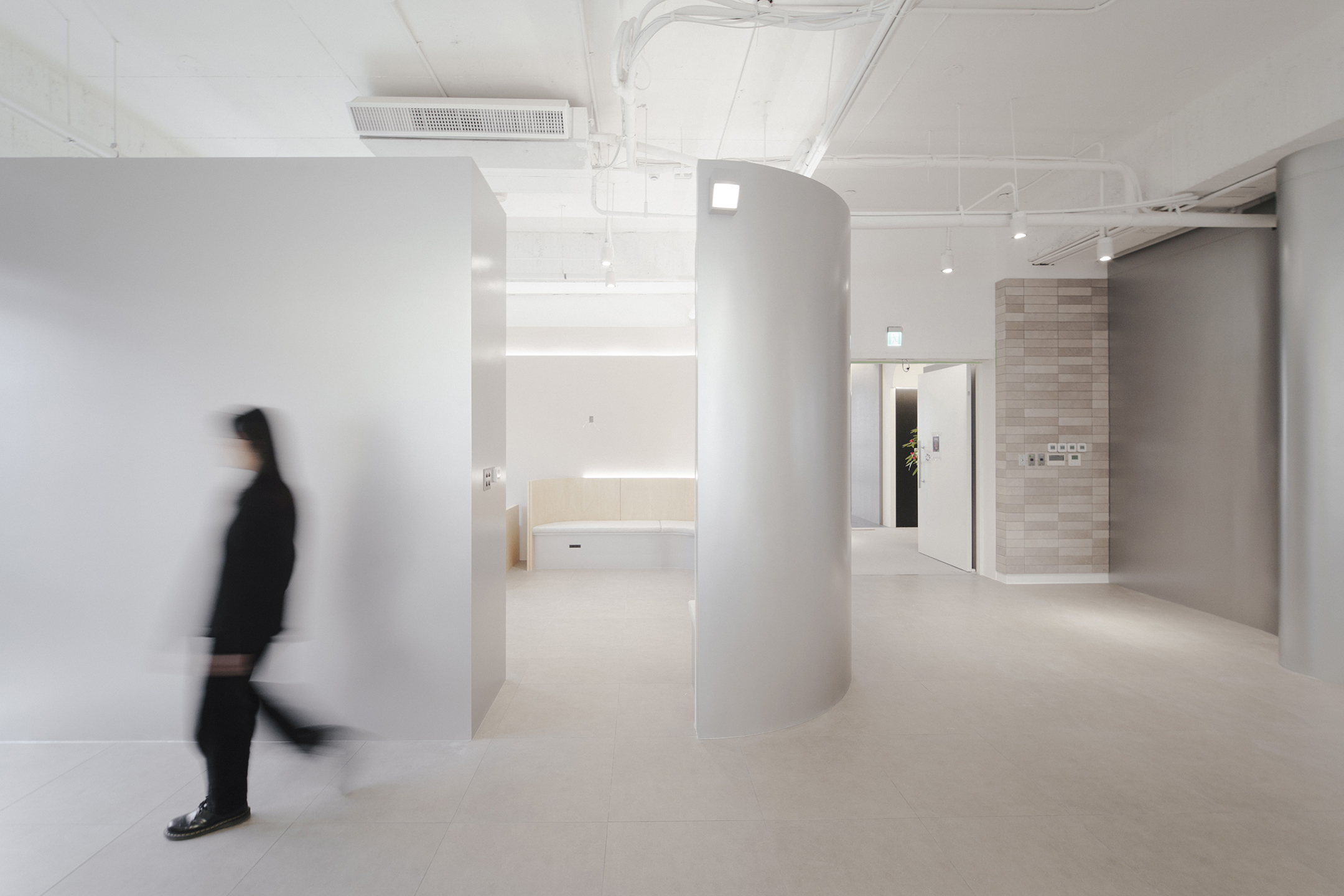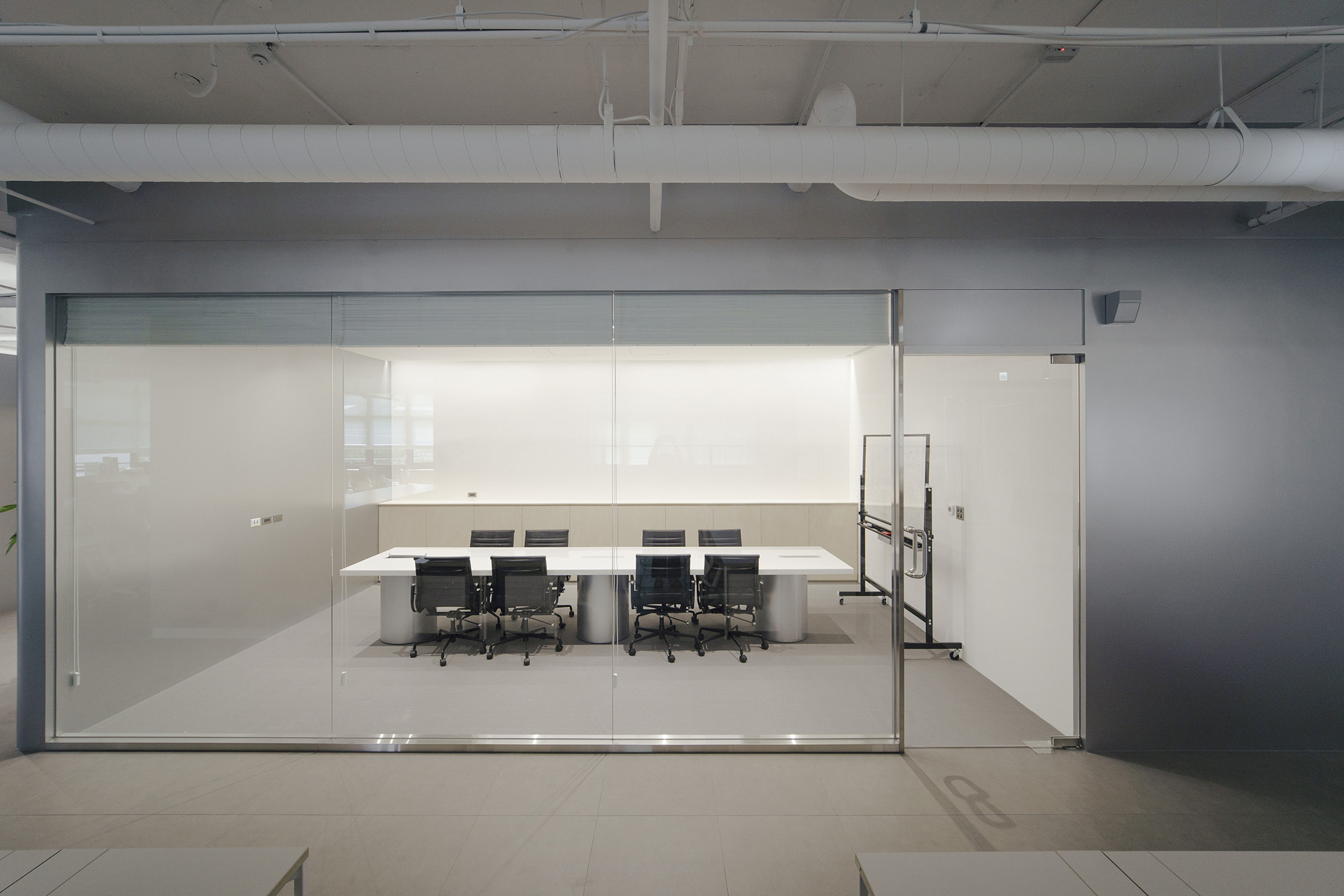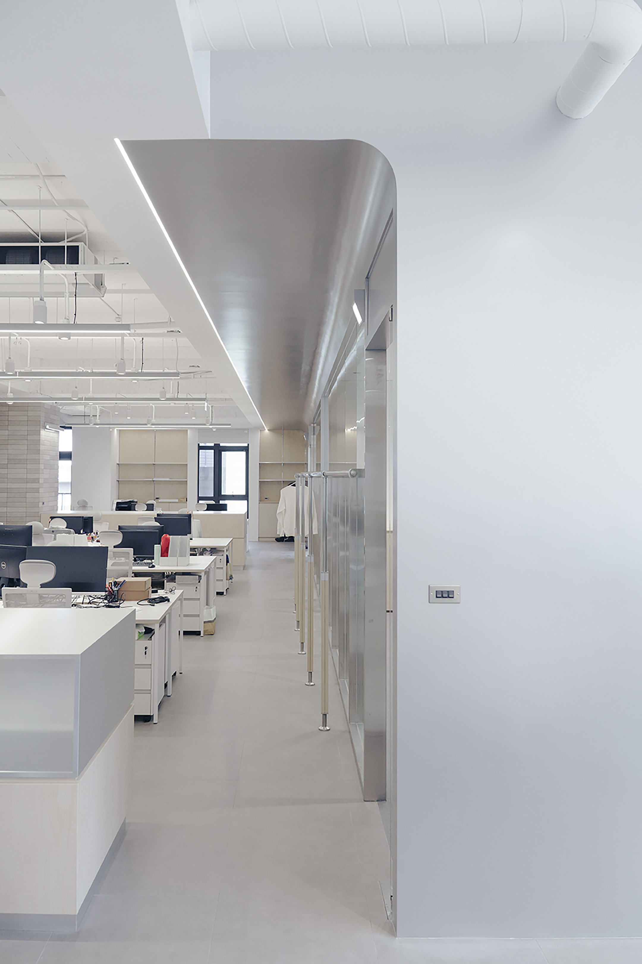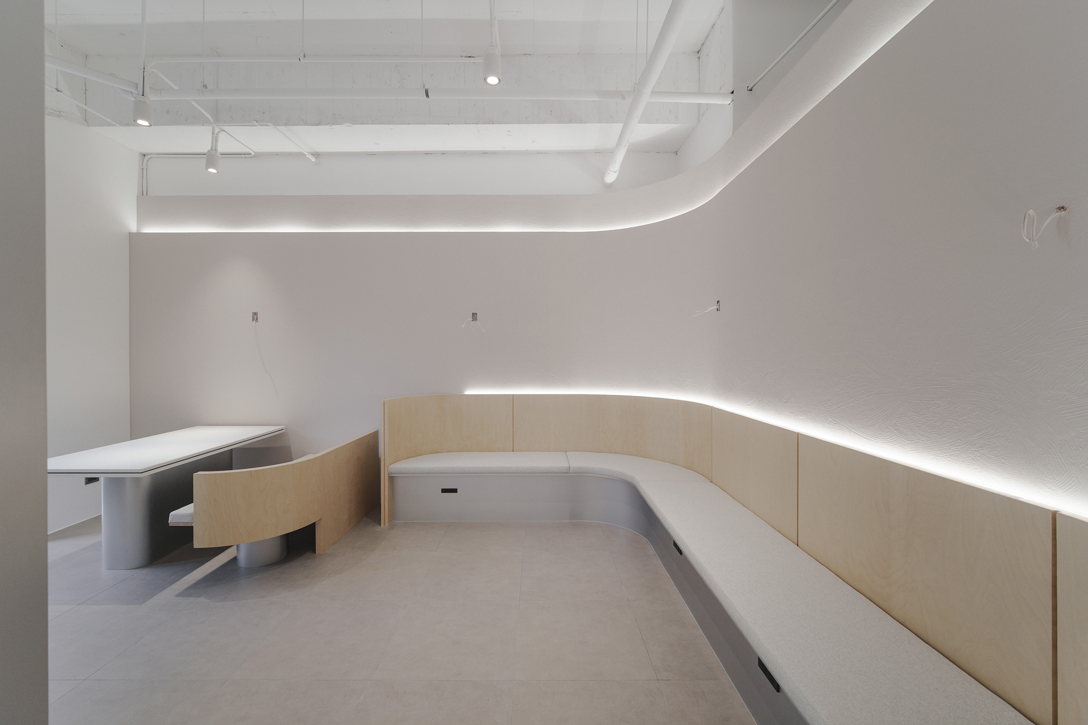 三樓空間基調以淺色系鋪陳,使視覺更顯明亮通透。弧形牆面與玻璃材質的應用,柔化了傳統辦公場域的生硬邊界,也延續品牌「美而快」中「美」的直覺表現。