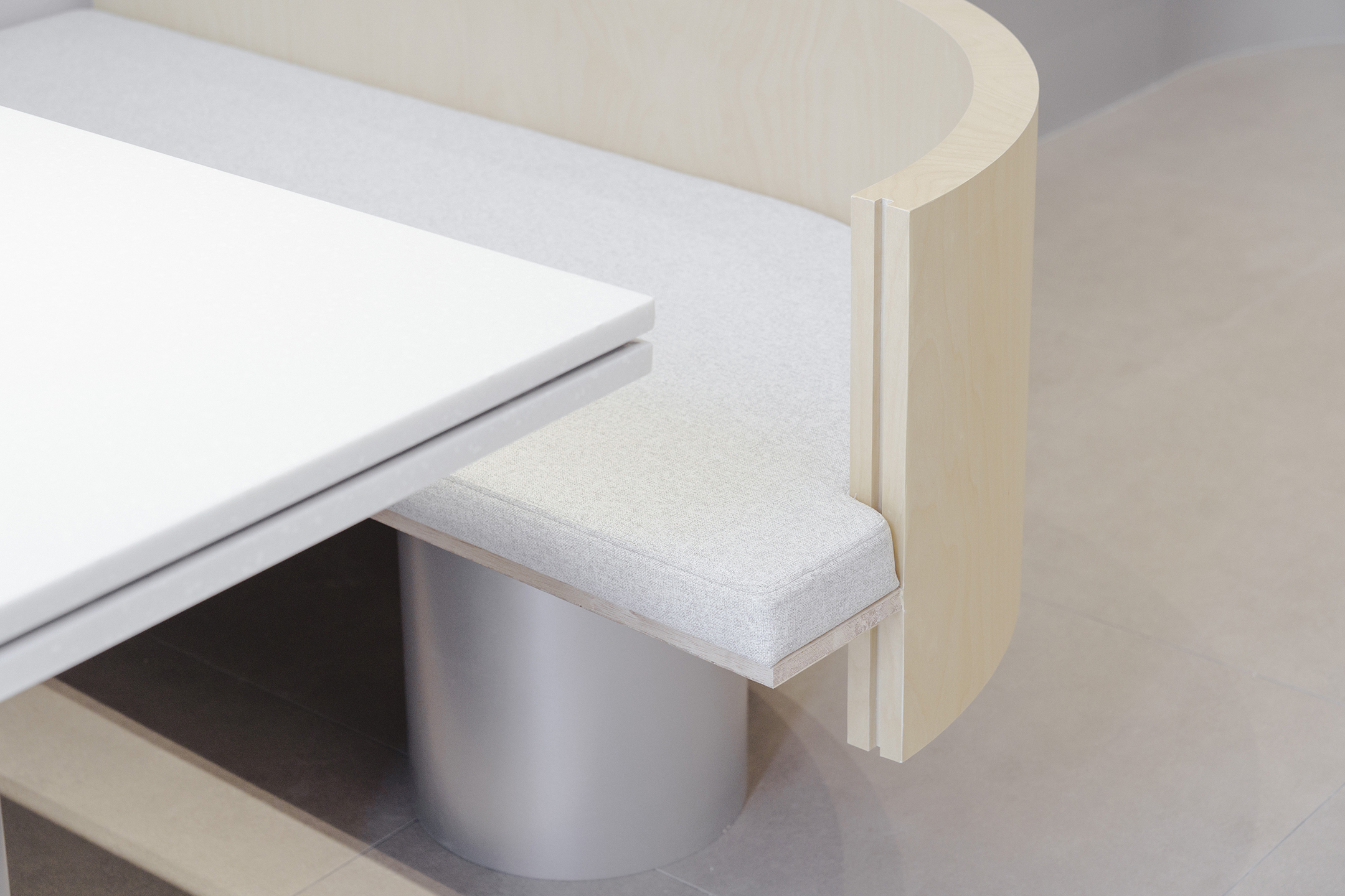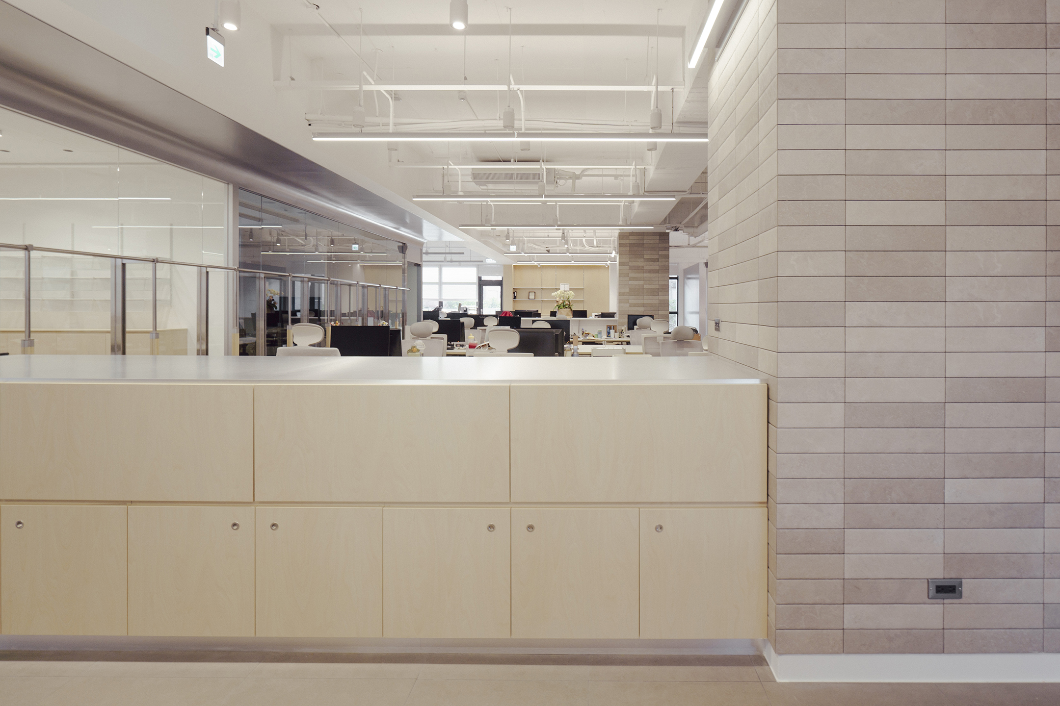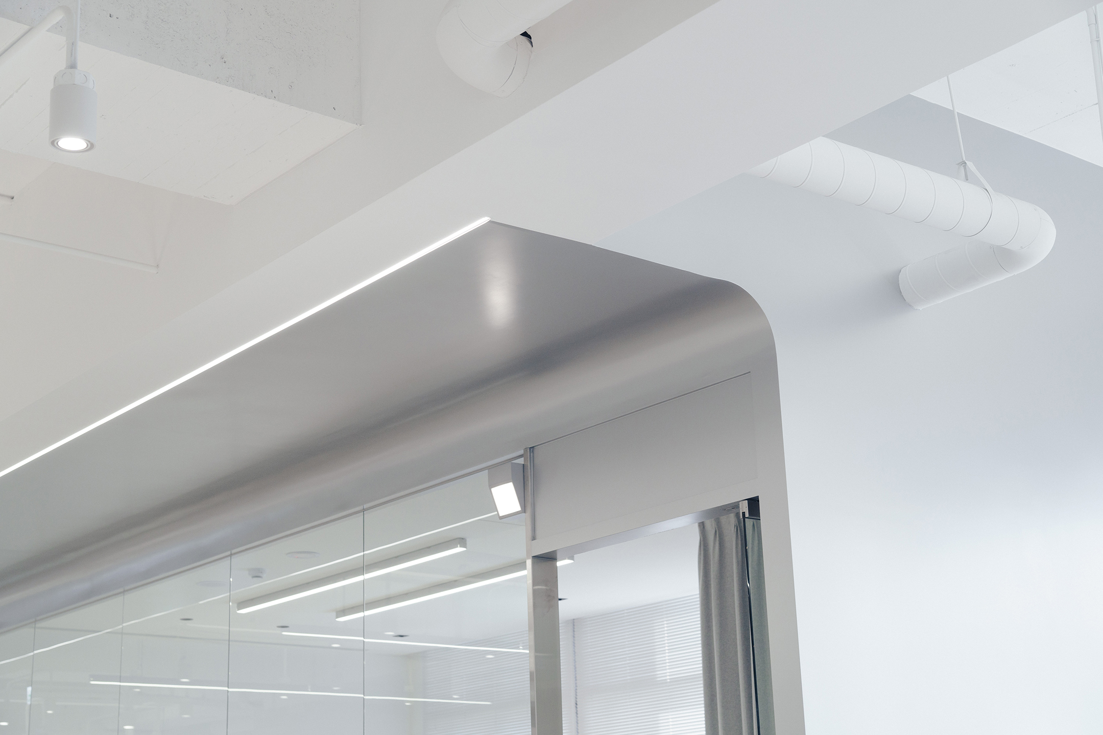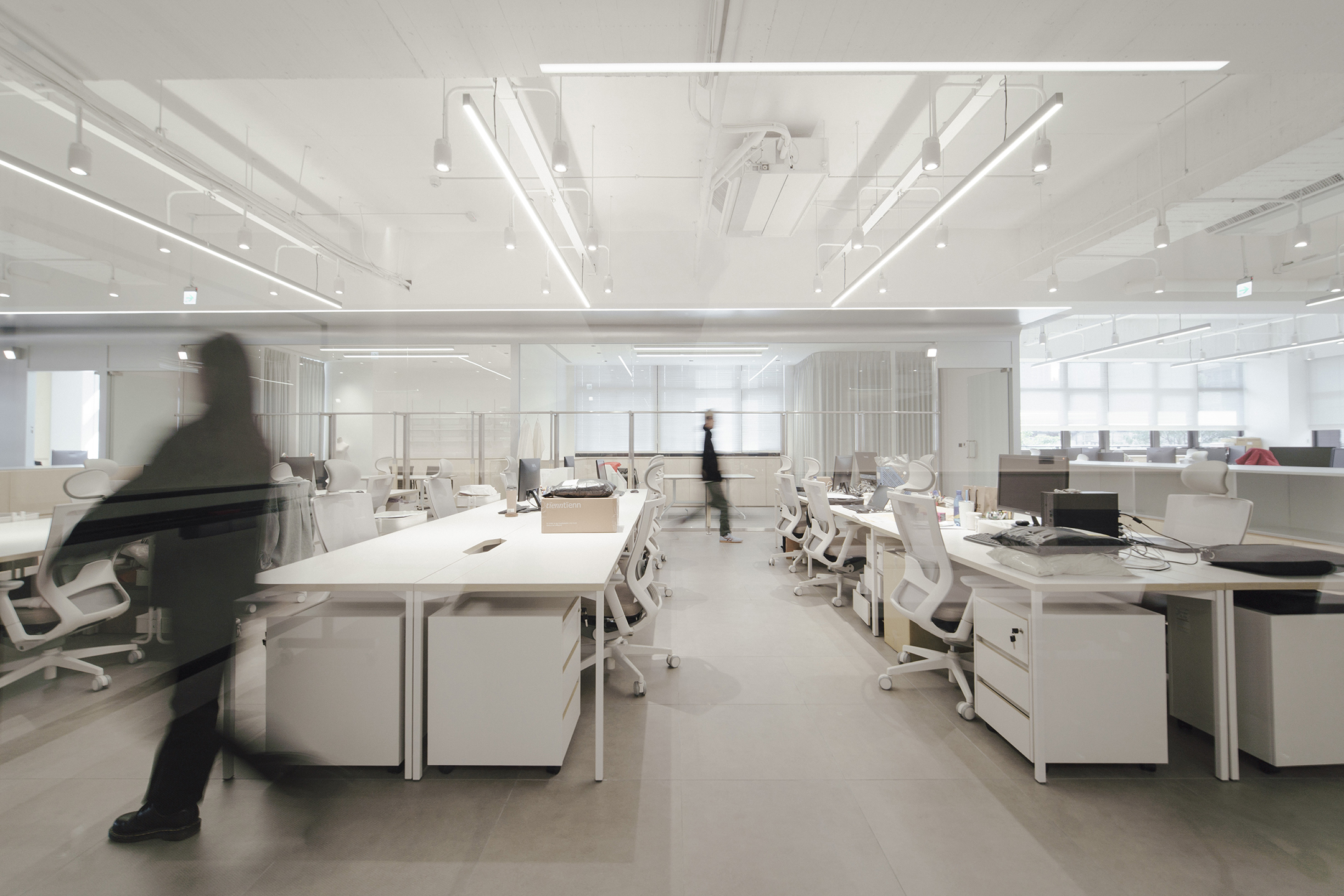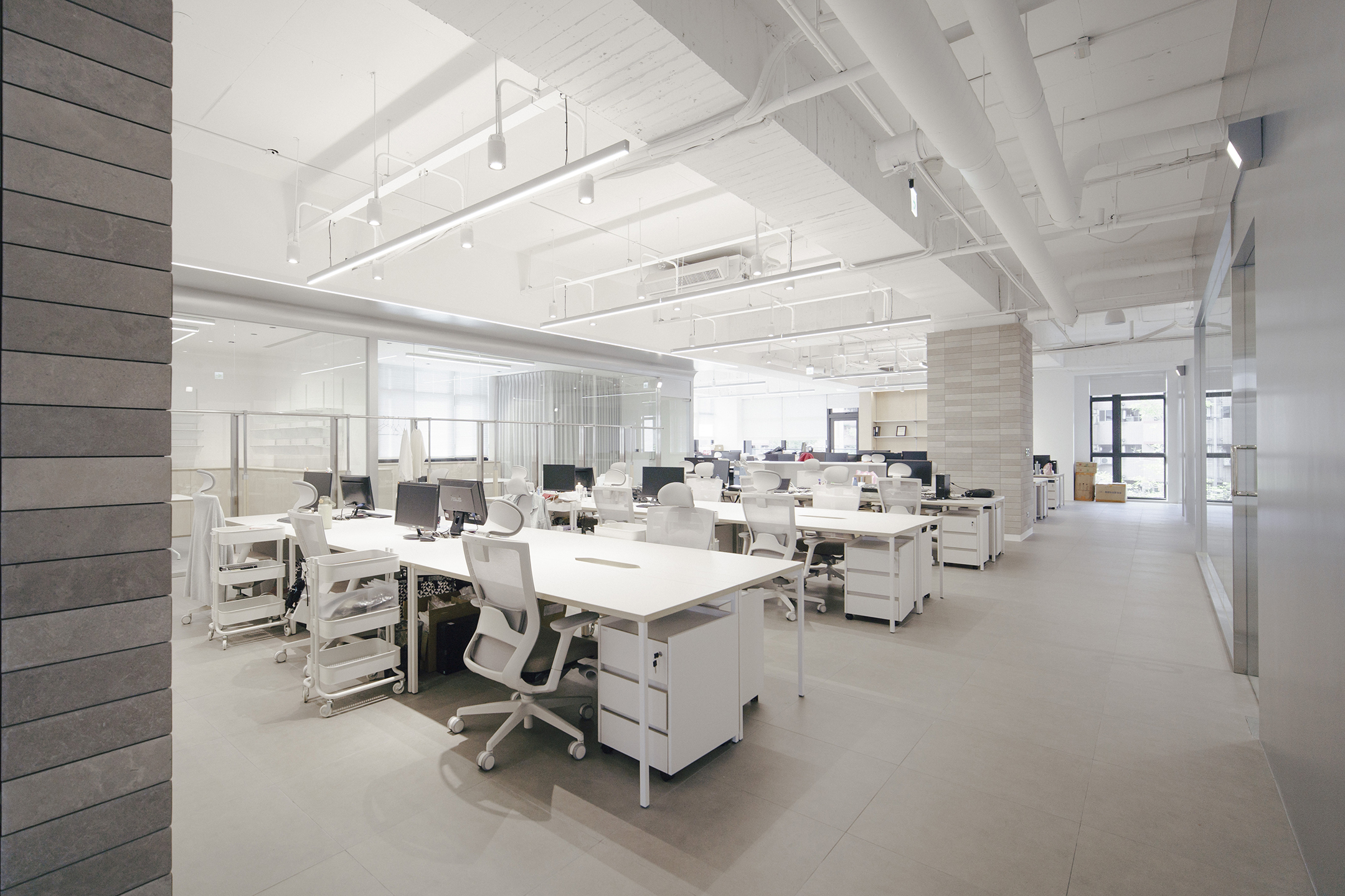 三樓空間基調以淺色系鋪陳,使視覺更顯明亮通透。弧形牆面與玻璃材質的應用,柔化了傳統辦公場域的生硬邊界,也延續品牌「美而快」中「美」的直覺表現。