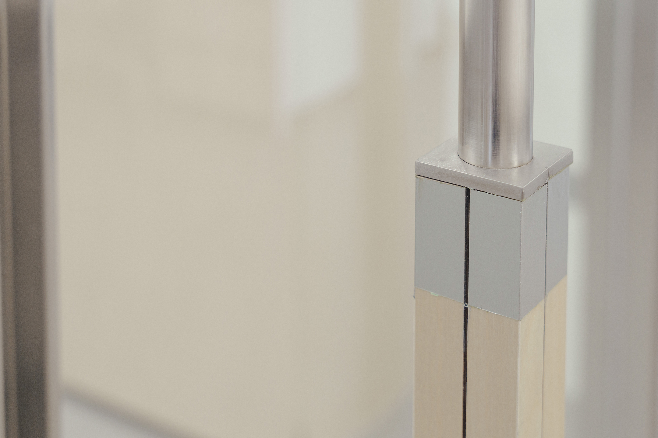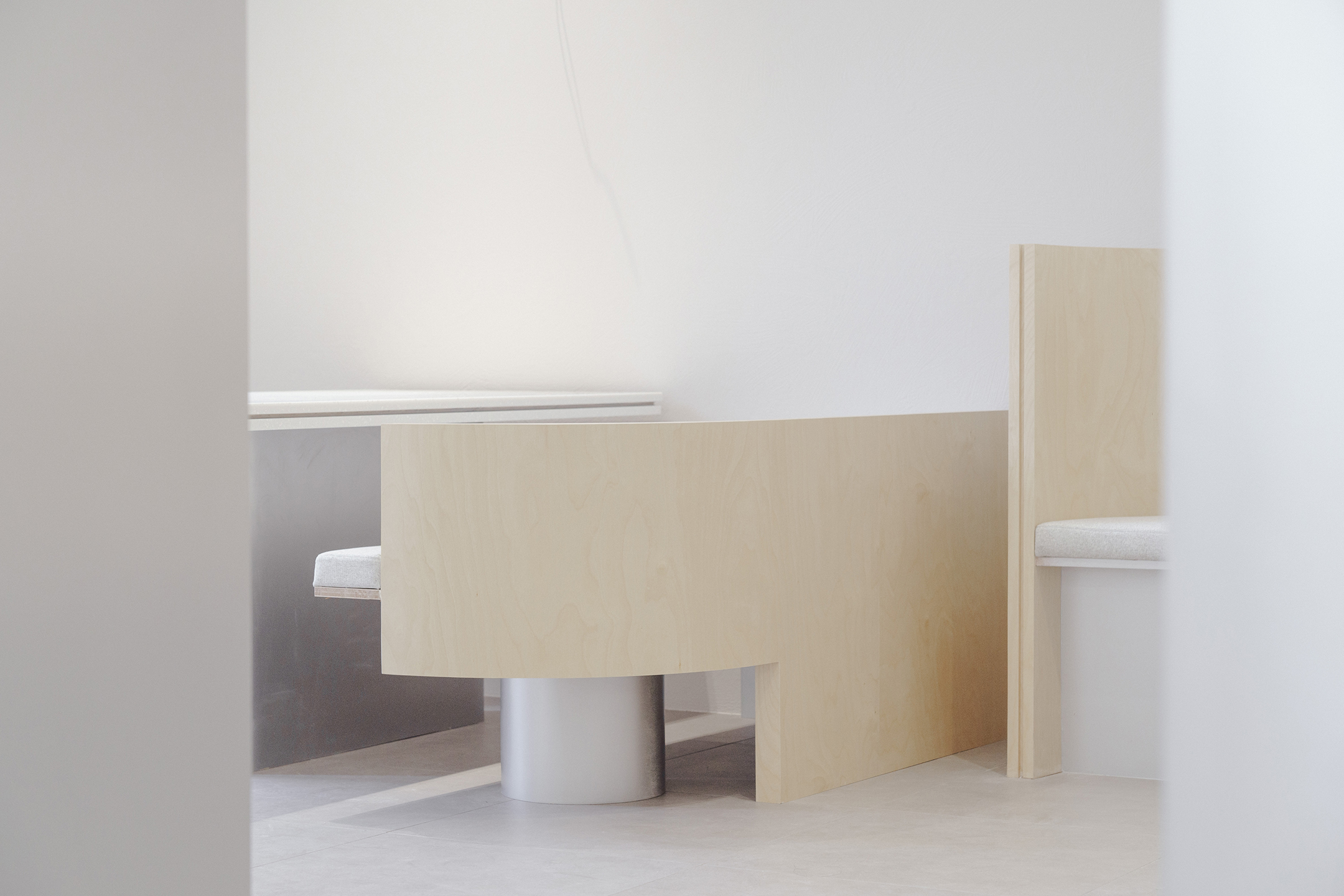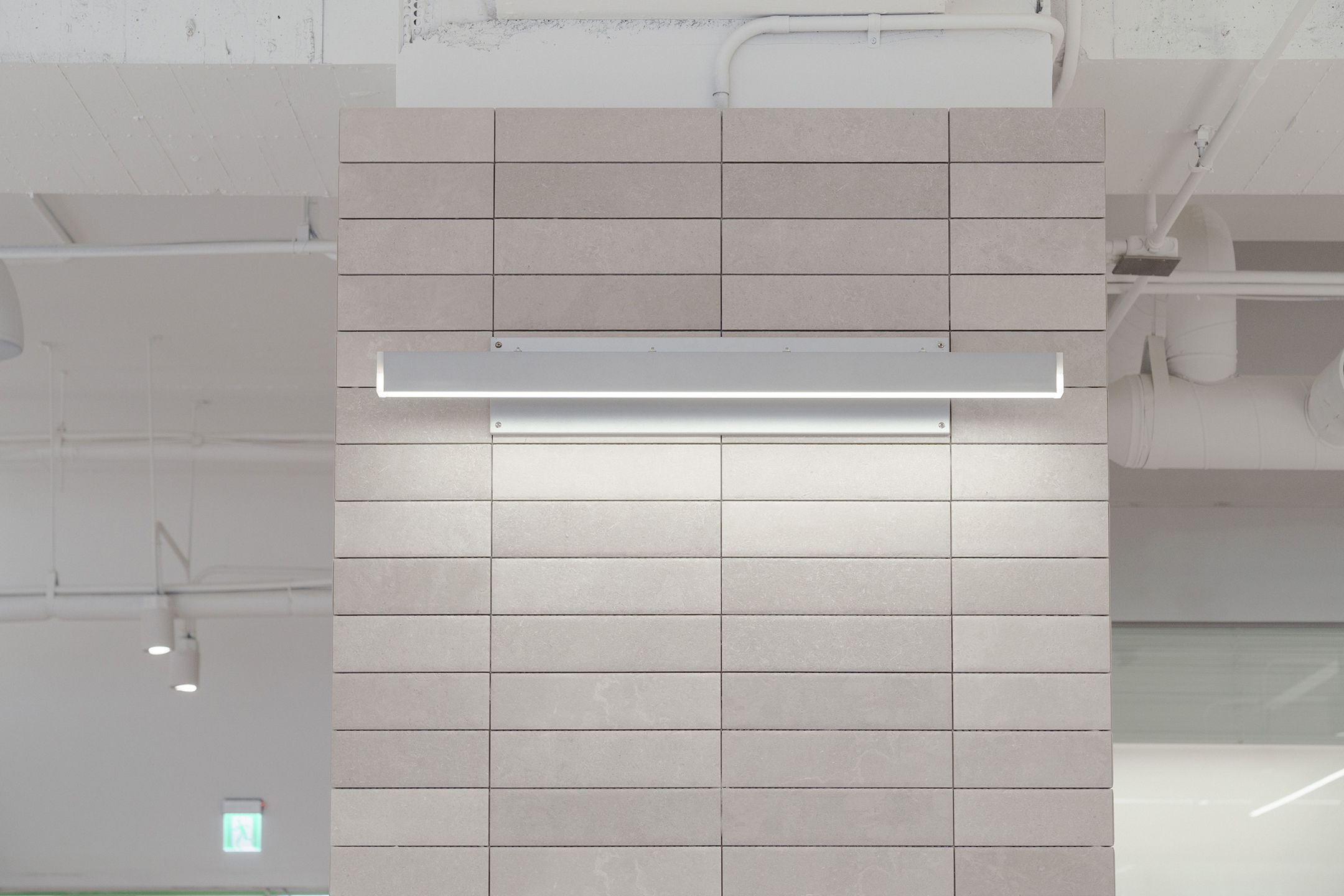 材質選擇上,運用淺色石材、木質飾面搭配局部金屬元素,提升整體層次感與質地對比,讓每一次進入空間都成為感官上的體驗。立柱所使用的灰色磚材,特別以不填縫的手法處理,使結構原貌保有粗獷質地,在明亮空間中形成視覺對比,成為另一個微妙而有力的設計亮點。