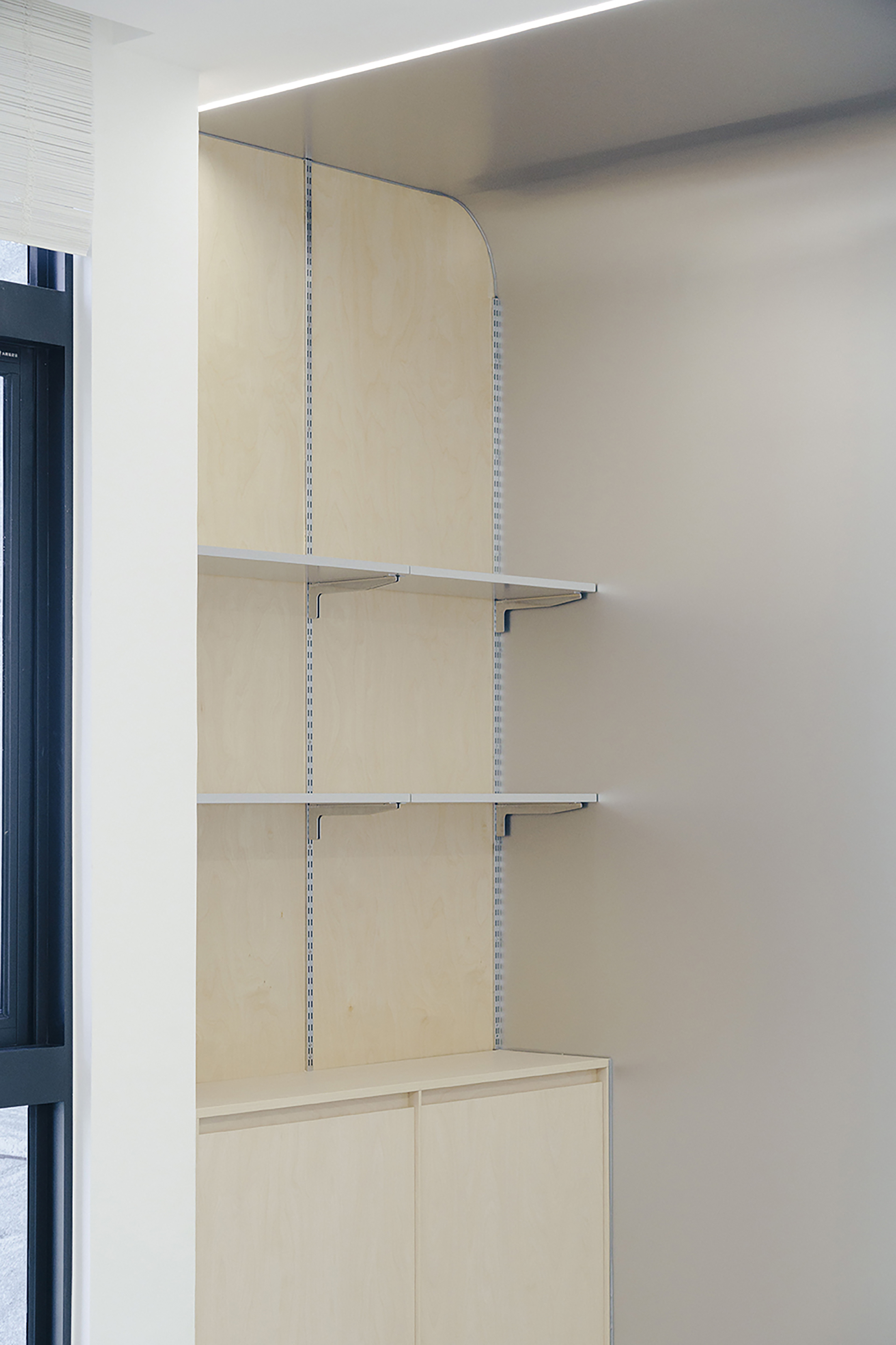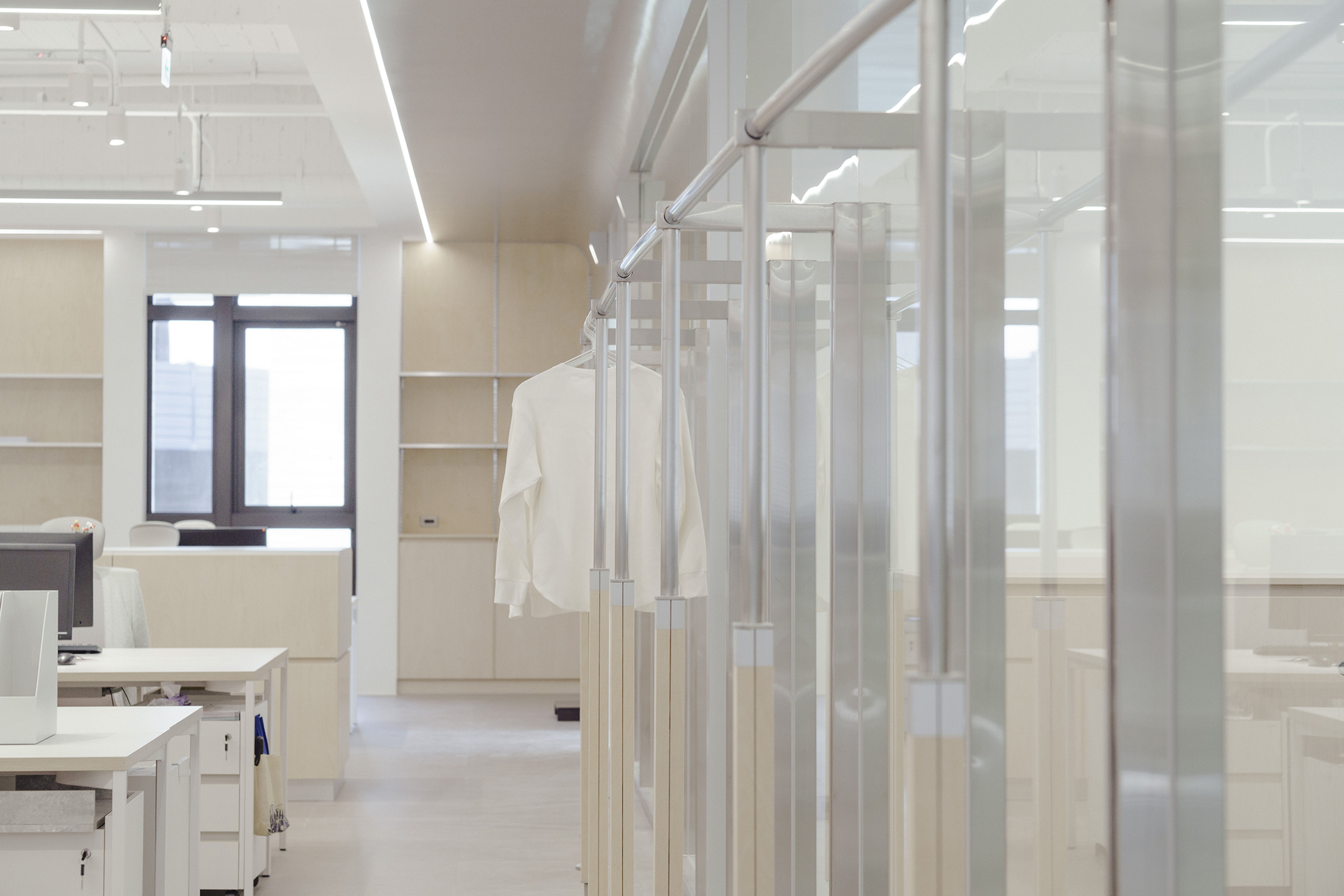 其中最具辨識度的,是為採購作業量身打造的一體式衣桿設計,以半弧造型結合金屬骨架與玻璃壁面,不僅滿足樣衣展示的實用需求,也成為空間中最具視覺張力的獨特語彙,讓機能使用與視覺風格自然交融。