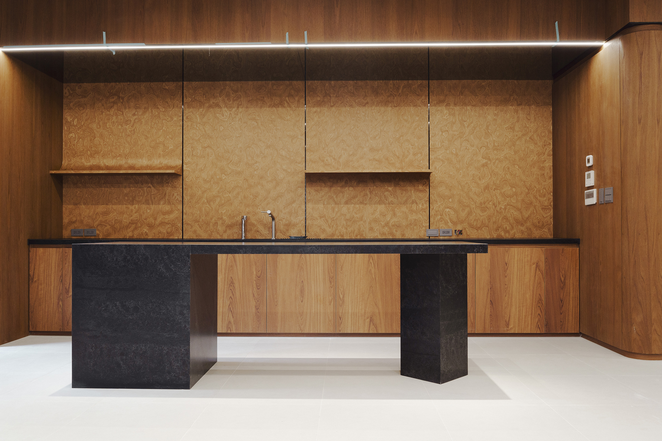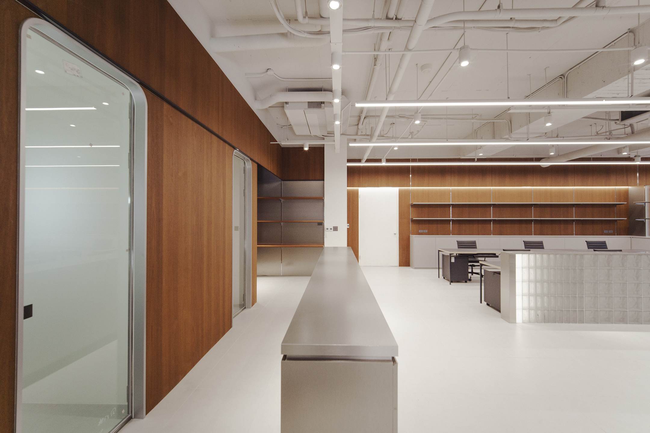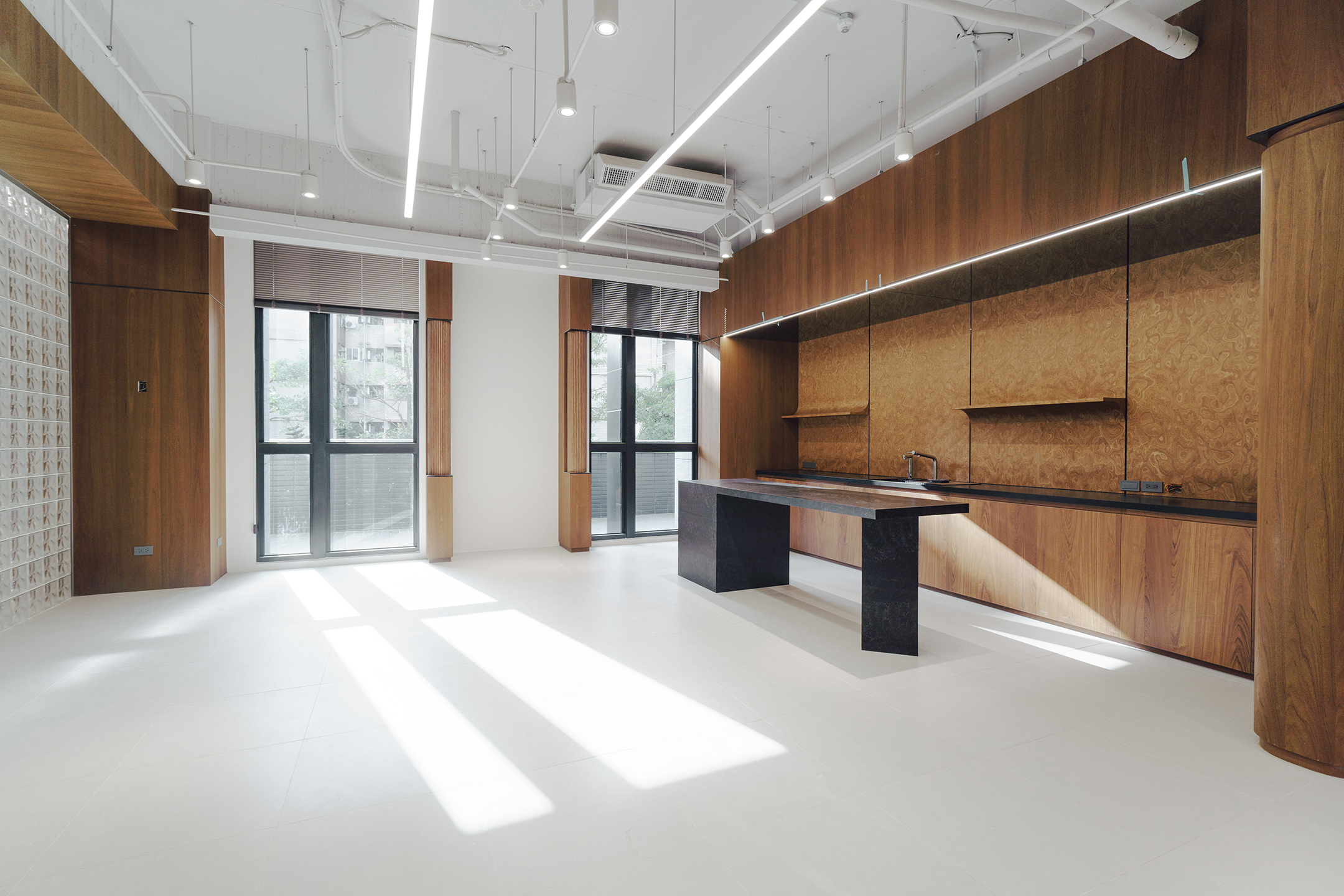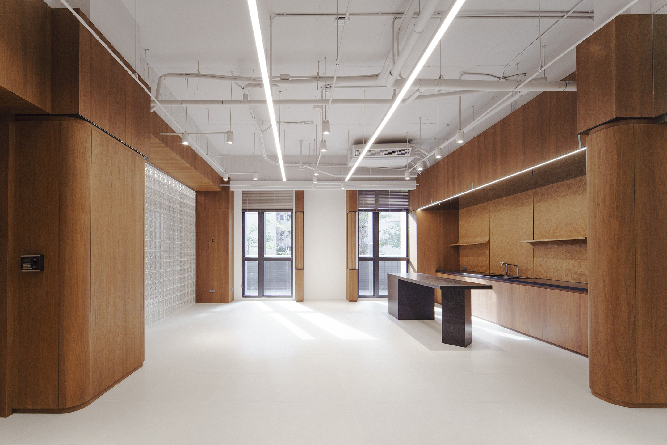 空間基調則由大面積柚木實木皮鋪陳,串聯亂紋不鏽鋼、灰色玻璃與水波紋玻璃磚等異材質,在冷峻語感中加入溫潤調性。木質所營造的溫潤與厚實,不僅調和整體質地,也呼應使用者的角色與特質——低調、沉著,卻蘊含份量,展現核心辦公空間應有的質感與深度。