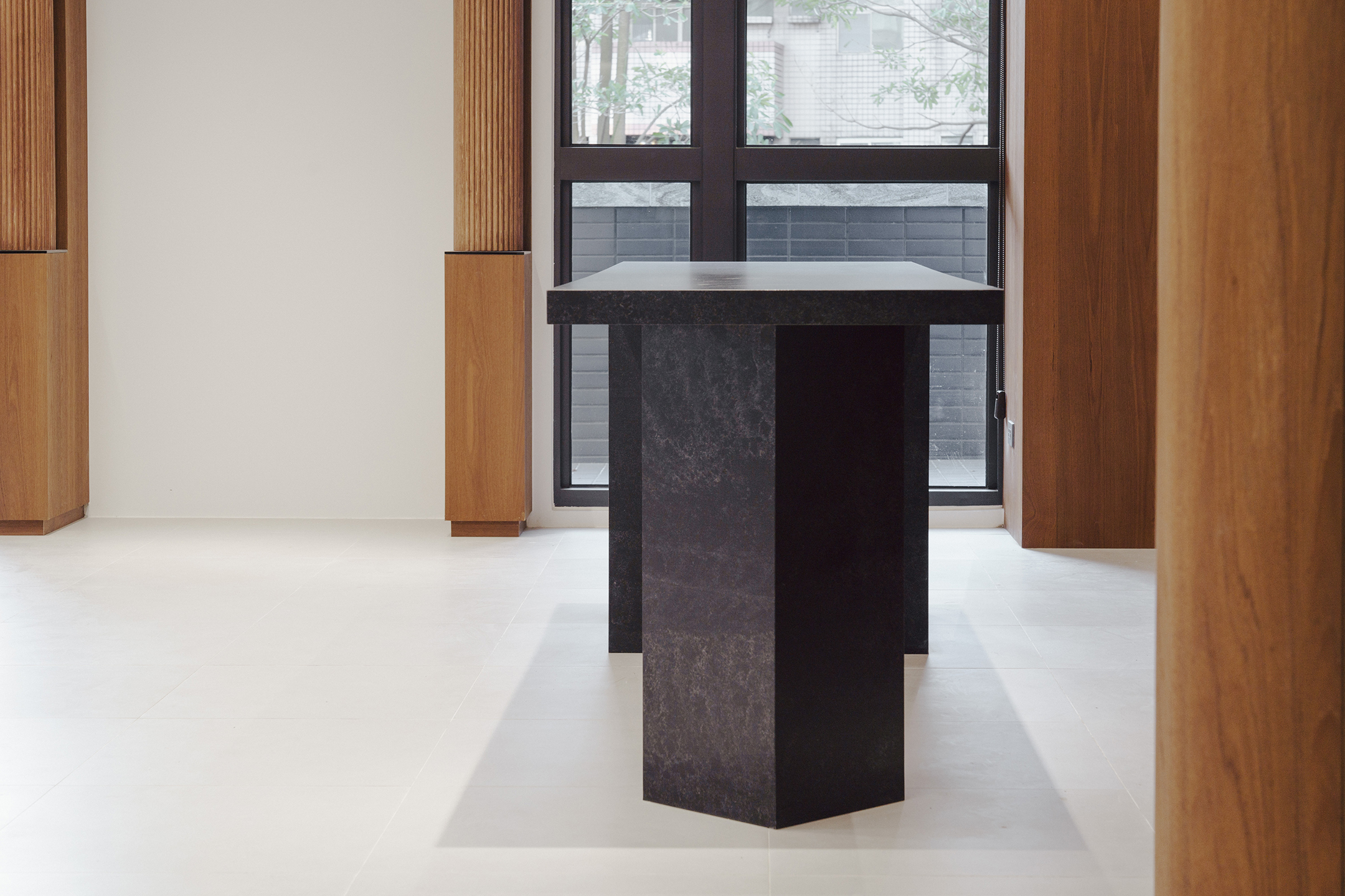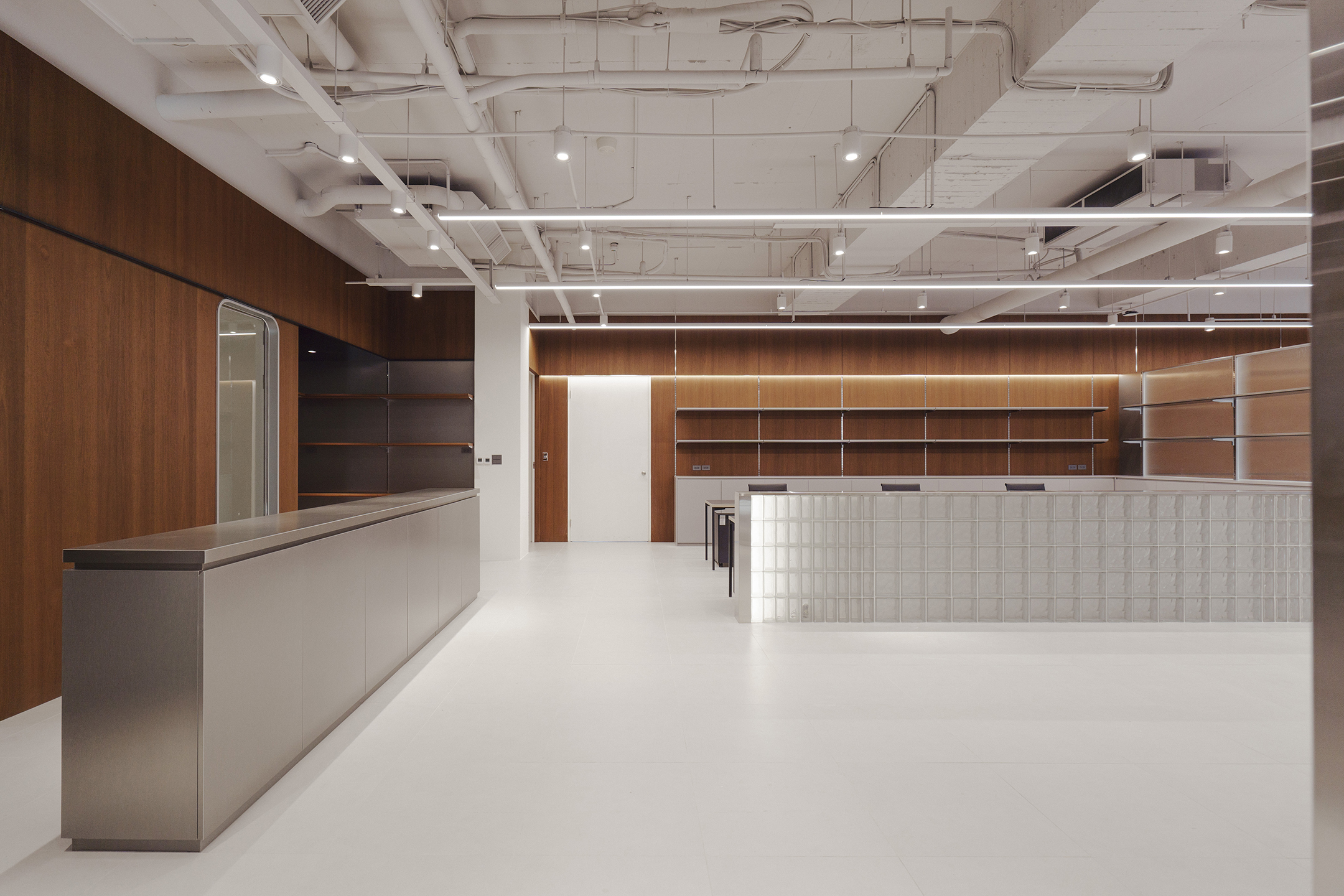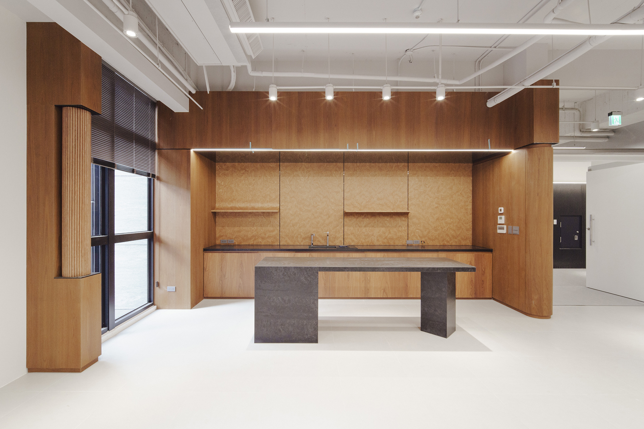空間基調則由大面積柚木實木皮鋪陳,串聯亂紋不鏽鋼、灰色玻璃與水波紋玻璃磚等異材質,在冷峻語感中加入溫潤調性。木質所營造的溫潤與厚實,不僅調和整體質地,也呼應使用者的角色與特質——低調、沉著,卻蘊含份量,展現核心辦公空間應有的質感與深度。