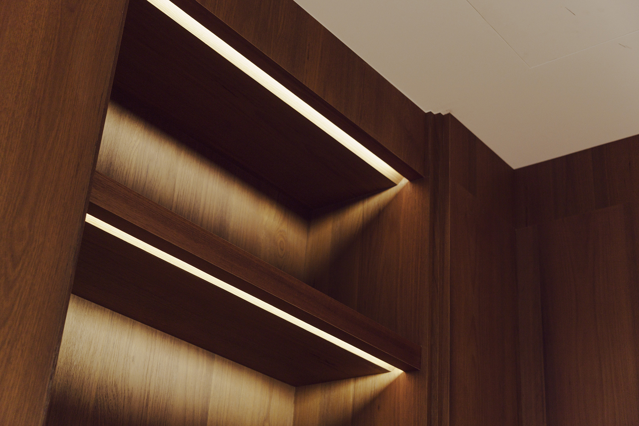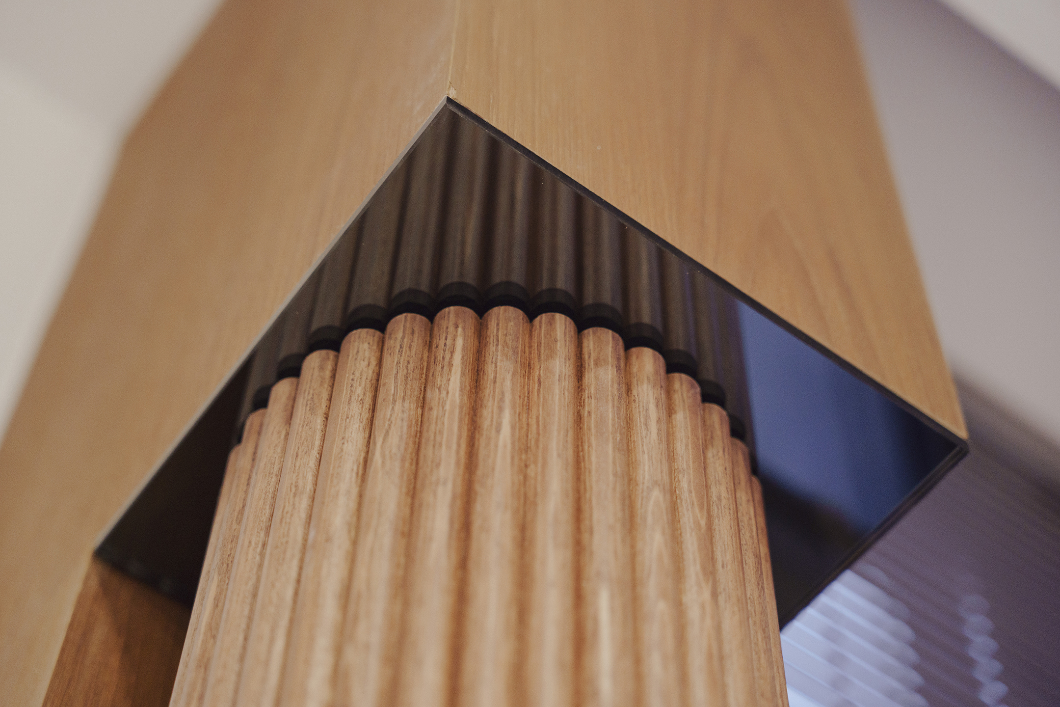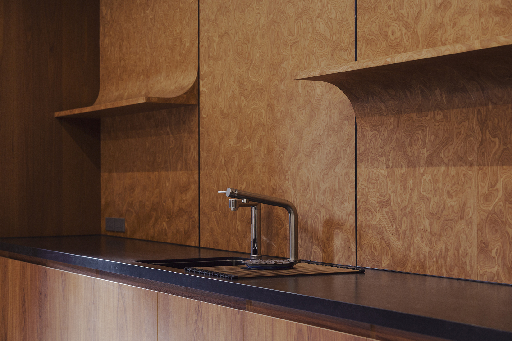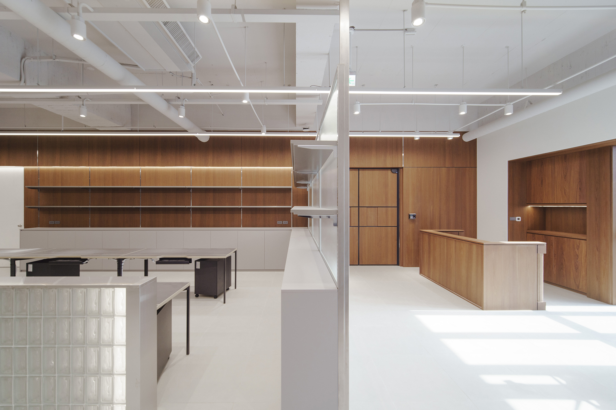 空間基調則由大面積柚木實木皮鋪陳,串聯亂紋不鏽鋼、灰色玻璃與水波紋玻璃磚等異材質,在冷峻語感中加入溫潤調性。木質所營造的溫潤與厚實,不僅調和整體質地,也呼應使用者的角色與特質——低調、沉著,卻蘊含份量,展現核心辦公空間應有的質感與深度。