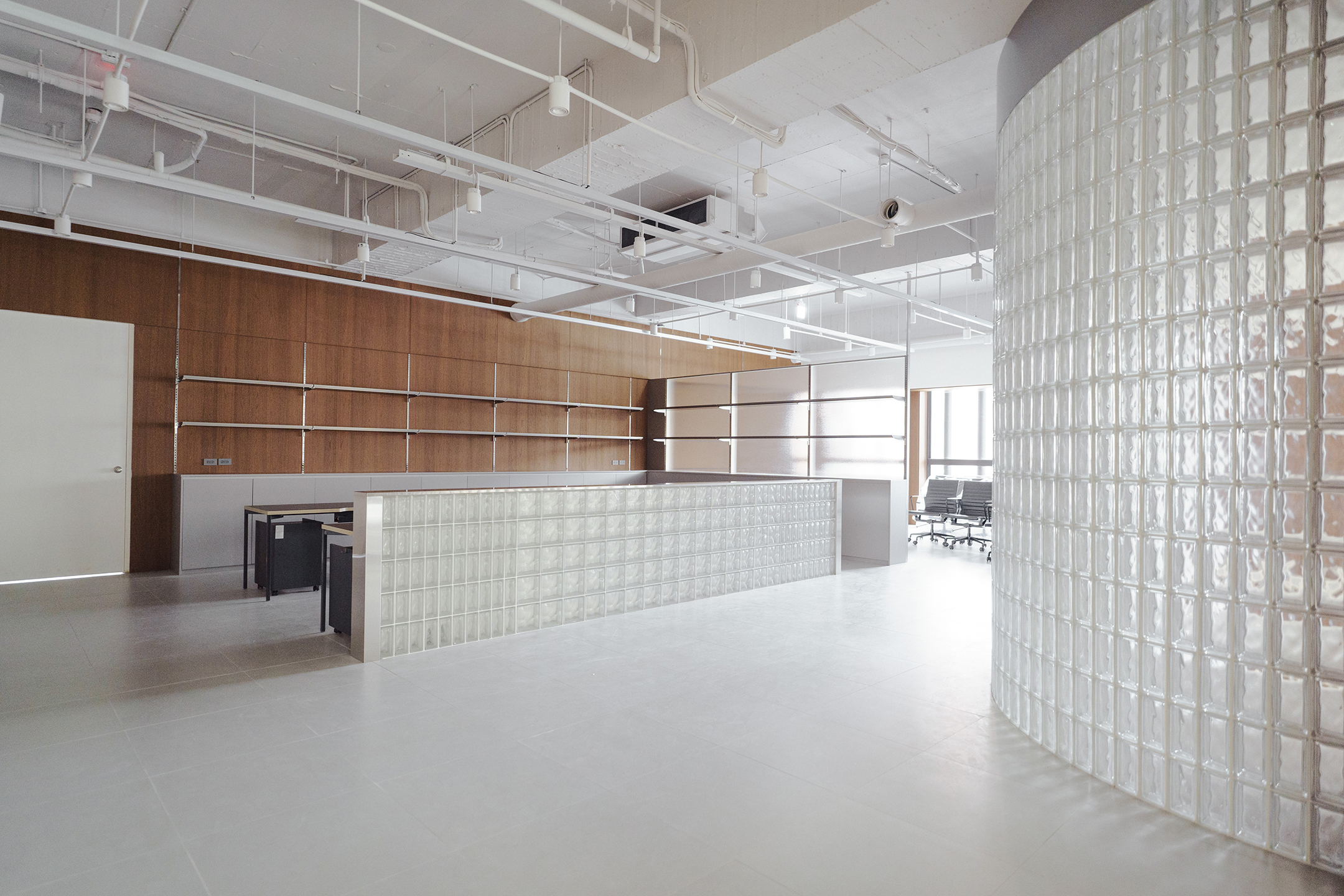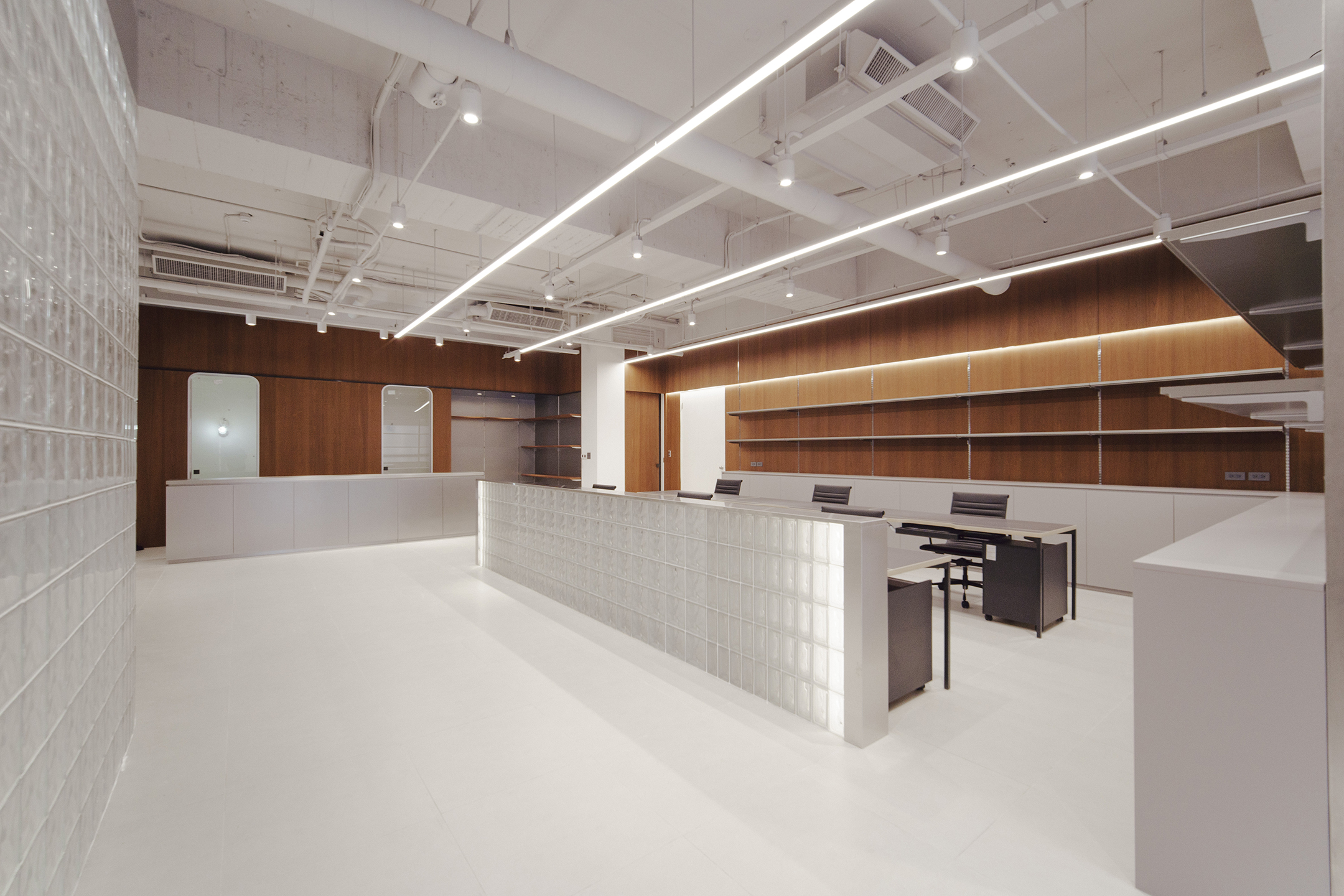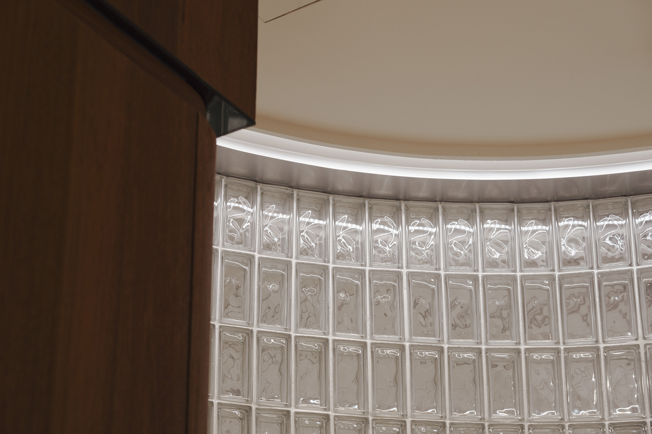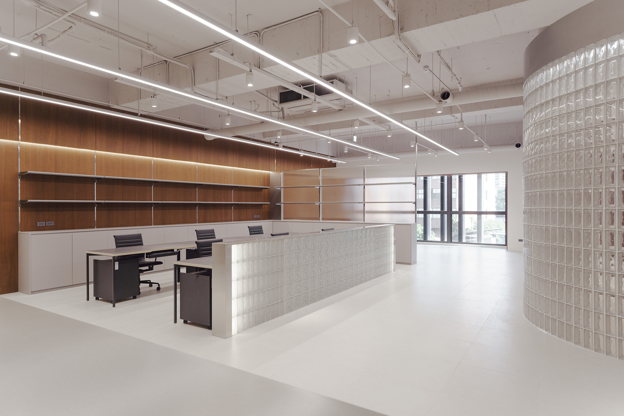 玻璃磚的語彙,自會議室延伸至幕僚辦公區前方的矮隔屏,形塑穩定的工作輪廓,也讓整體動線更具層次。隔屏內嵌的燈條光影,灑落於玻璃磚的紋理之上,形成一道靜謐的迎賓軸線。