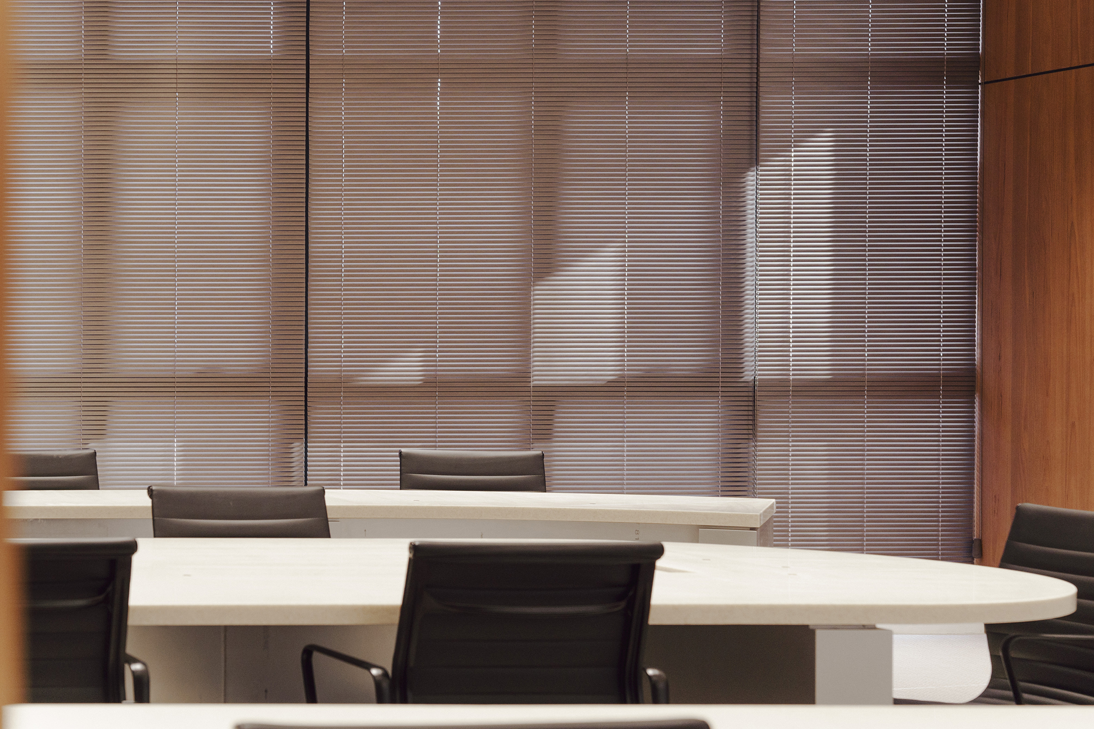 會議室以水波紋玻璃磚構築邊界,半透材質使自然光得以滲透至入口茶水區,維持空間的通透與明亮,同時有效隔絕視線與聲音,確保會議過程中的隱私性。